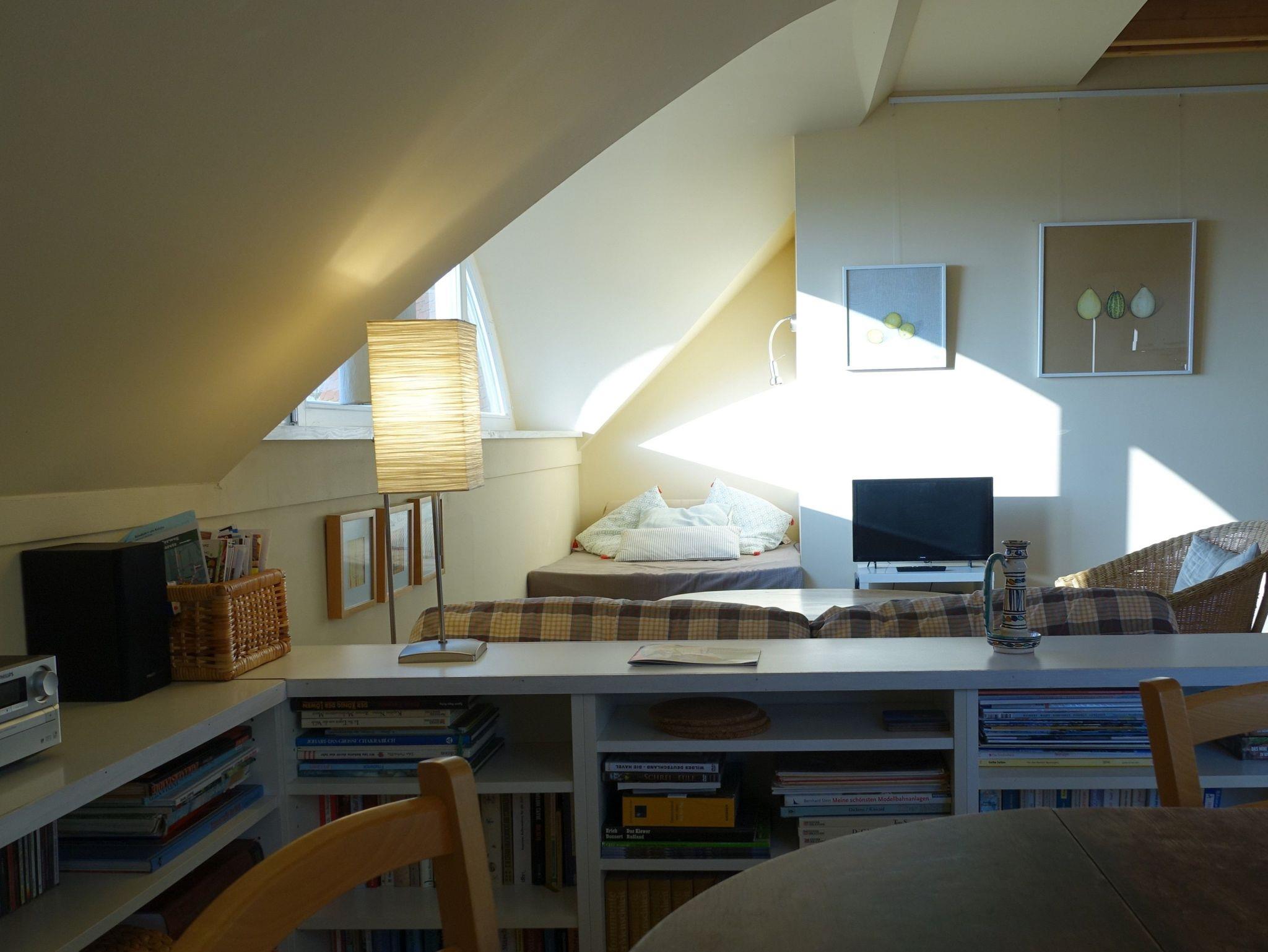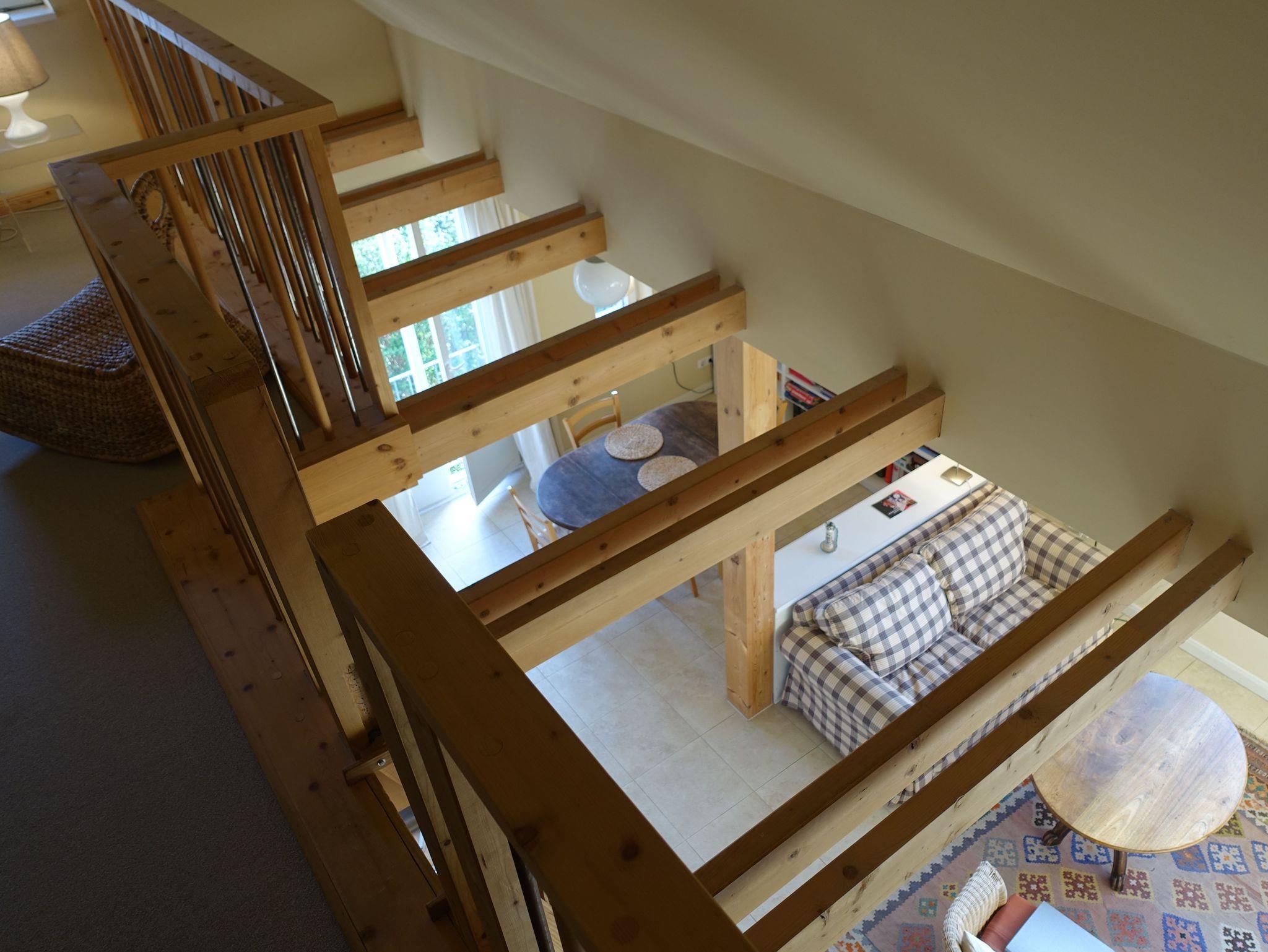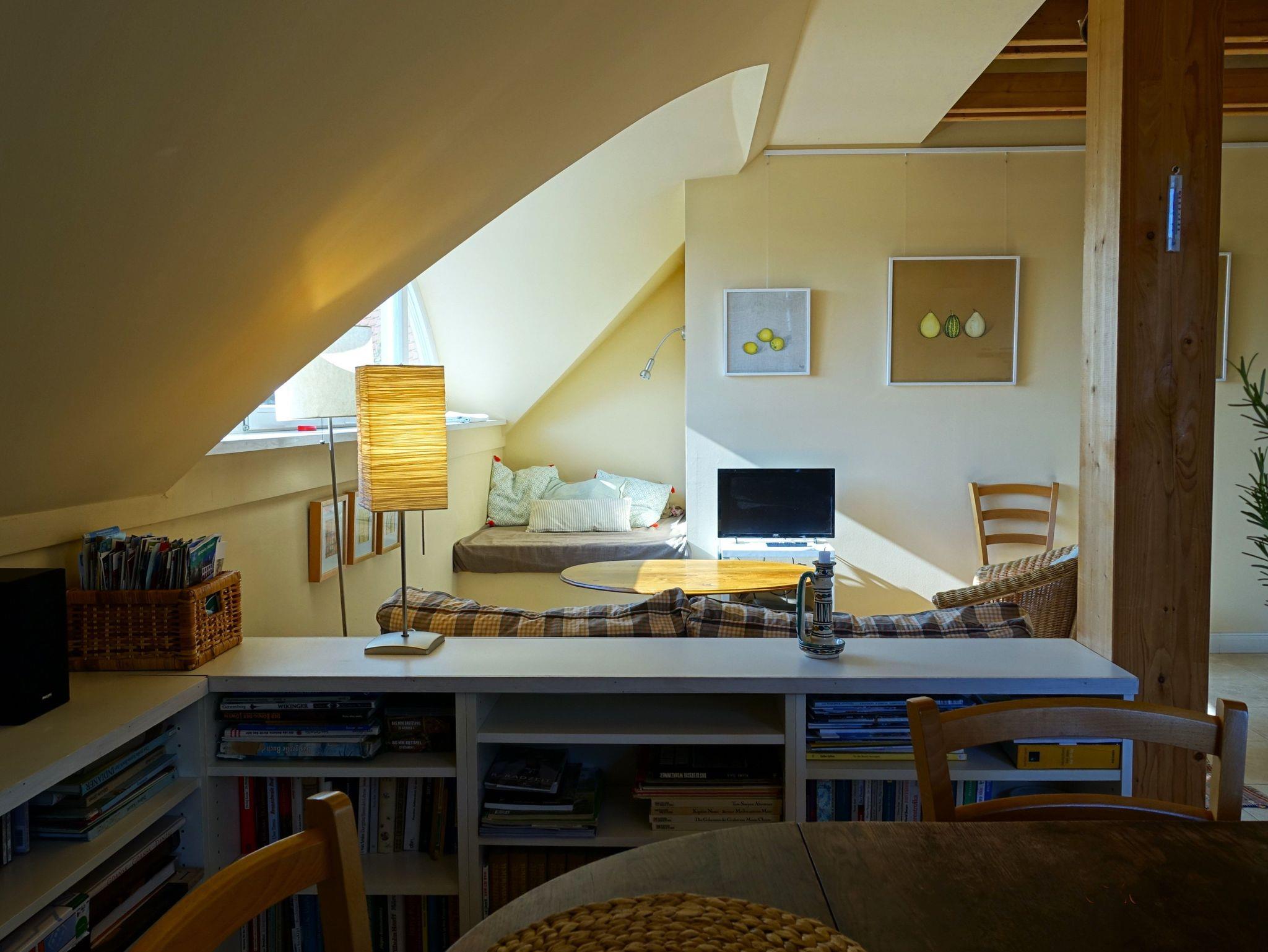 Komfortables Maisonette-Apartment im 1. Obergeschoß unseres Landhauses Arcadia. Eigener Haus-Eingang. WLAN kostenfrei. Einrichtung im Landhausstil. Großzügiger Wohnraum: TV/DVD, gemütliches Sofa mit Sessel, Leseecke, Essbereich mit Eichentisch + Holzstühle mit Korbgeflecht, Regale mit Büchern, CDs, Spielen, Radioanlage mit USB/i-Phone Anschluß. Küchenzeile ca. 3 m mit Kühl-/Gefriereinheit, Kochen auf Halogen-Ceranfeld, Heißluftbackofen (Bauknecht), Geschirrspüler (Siemens), umfangreiche Kochutensilien, Edelstahl Bratpfanne (WMF), Edelstahltöpfe, Filter-Kaffeemaschine (Bosch), Wasserkocher, Abzugshaube mit Abluft (!!). Holztreppe z. Galerie, Fußbodenheizung, Eigene Terrasse. Großes Rundbogenfenster nach Südosten. 1 Schlafzimmer mit Doppelbett 160 x 200 cm, Galerie mit 2 Einzelbetten je 90 x 200 cm.