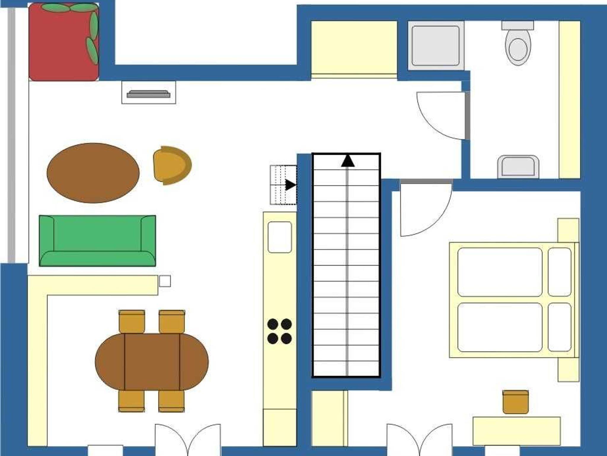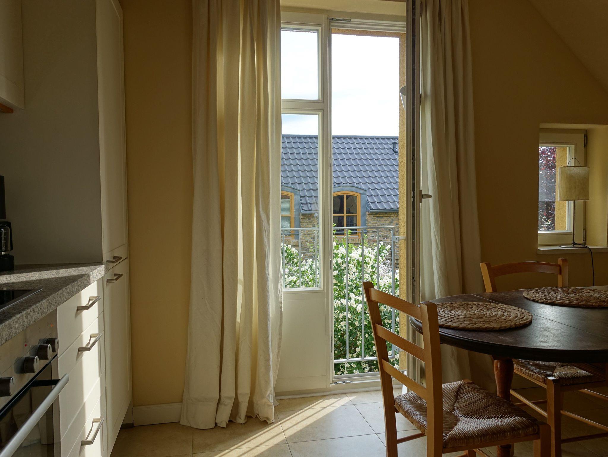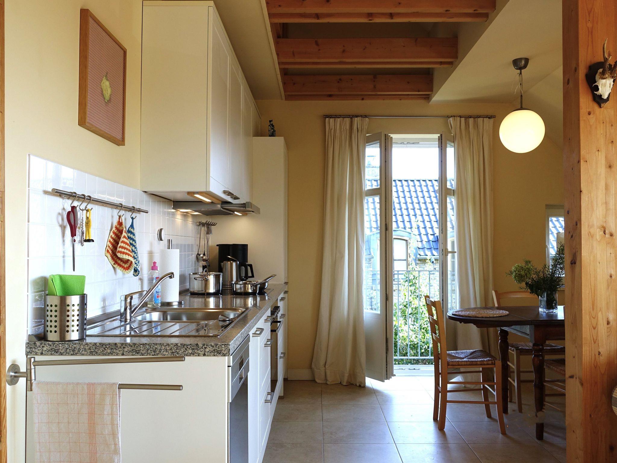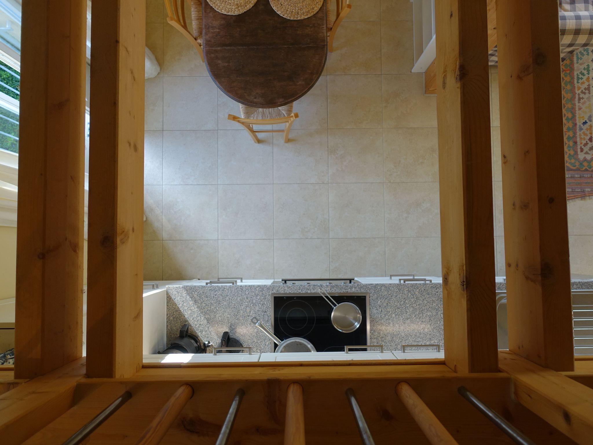 Komfortables Maisonette-Apartment im 1. Obergeschoß unseres Landhauses Arcadia. Eigener Haus-Eingang. WLAN kostenfrei. Einrichtung im Landhausstil. Großzügiger Wohnraum: TV/DVD, gemütliches Sofa mit Sessel, Leseecke, Essbereich mit Eichentisch + Holzstühle mit Korbgeflecht, Regale mit Büchern, CDs, Spielen, Radioanlage mit USB/i-Phone Anschluß. Küchenzeile ca. 3 m mit Kühl-/Gefriereinheit, Kochen auf Halogen-Ceranfeld, Heißluftbackofen (Bauknecht), Geschirrspüler (Siemens), umfangreiche Kochutensilien, Edelstahl Bratpfanne (WMF), Edelstahltöpfe, Filter-Kaffeemaschine (Bosch), Wasserkocher, Abzugshaube mit Abluft (!!). Holztreppe z. Galerie, Fußbodenheizung, Eigene Terrasse. Großes Rundbogenfenster nach Südosten. 1 Schlafzimmer mit Doppelbett 160 x 200 cm, Galerie mit 2 Einzelbetten je 90 x 200 cm.