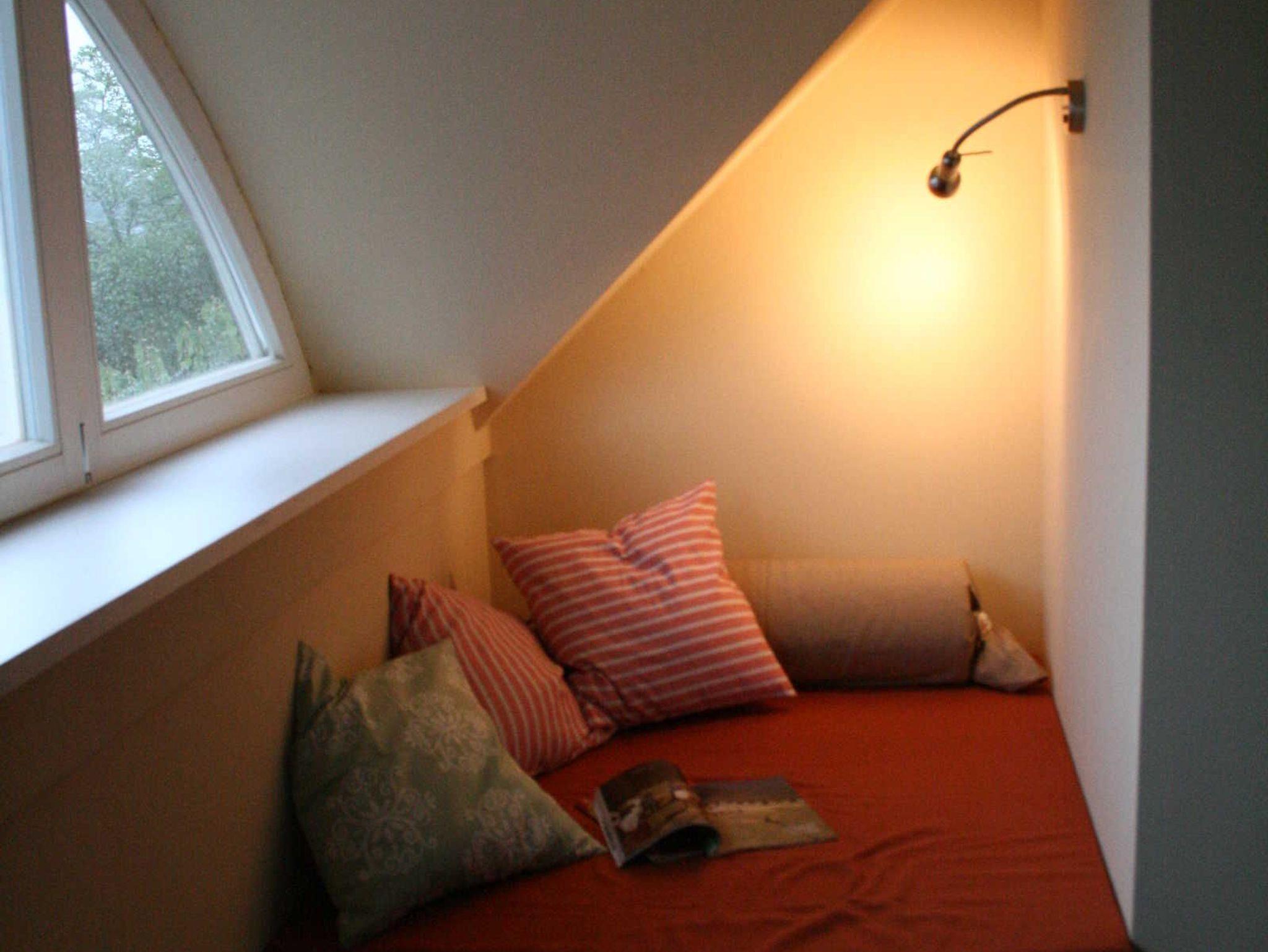 Über eine herausziehbare Holztreppe gelangen Sie zu dem Refugium auf der Empore, der Galerie, die - mit zwei leicht verschiebbaren Einzelbetten je 90 x 200 cm ausgestattet - zum Lesen, Spielen oder Schlafen einlädt. Im Schlafzimmer finden Sie ein Doppelbett, einen Schrank (sowie einen kompakten Schreibtisch für Ihren Laptop. Das Doppelbett misst ca. 205 cm x 190 cm, Kissen und Decken sind mit Natur-Daunen gefüttert.