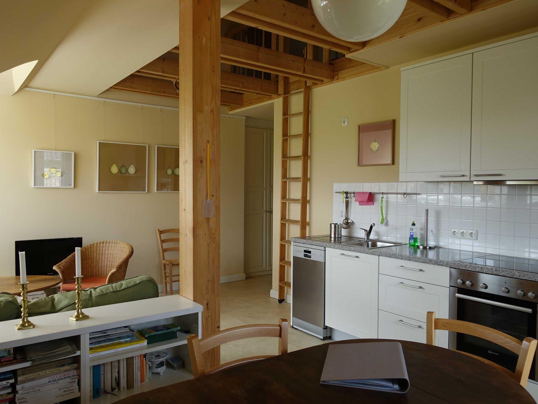 Die Wohnungen: großzügig wirkende, Licht durchflutete Räume mit professioneller Küchenzeile, Holzeßtisch und einem freundlich hellen, bequemen Wohnbereich. Wände in Naturfarben gestrichen, an den Wänden Originalbilder von Anette Hollmann.