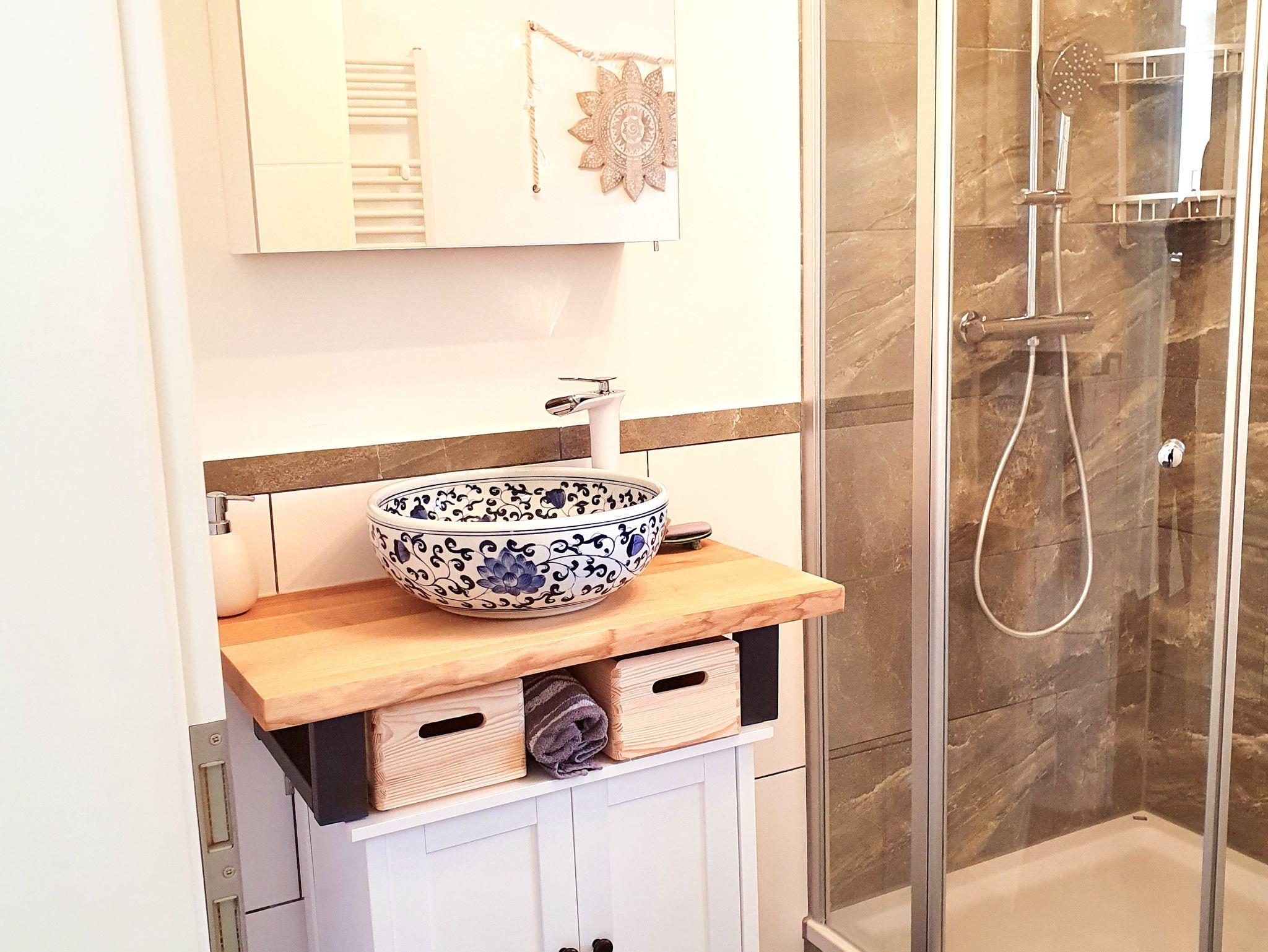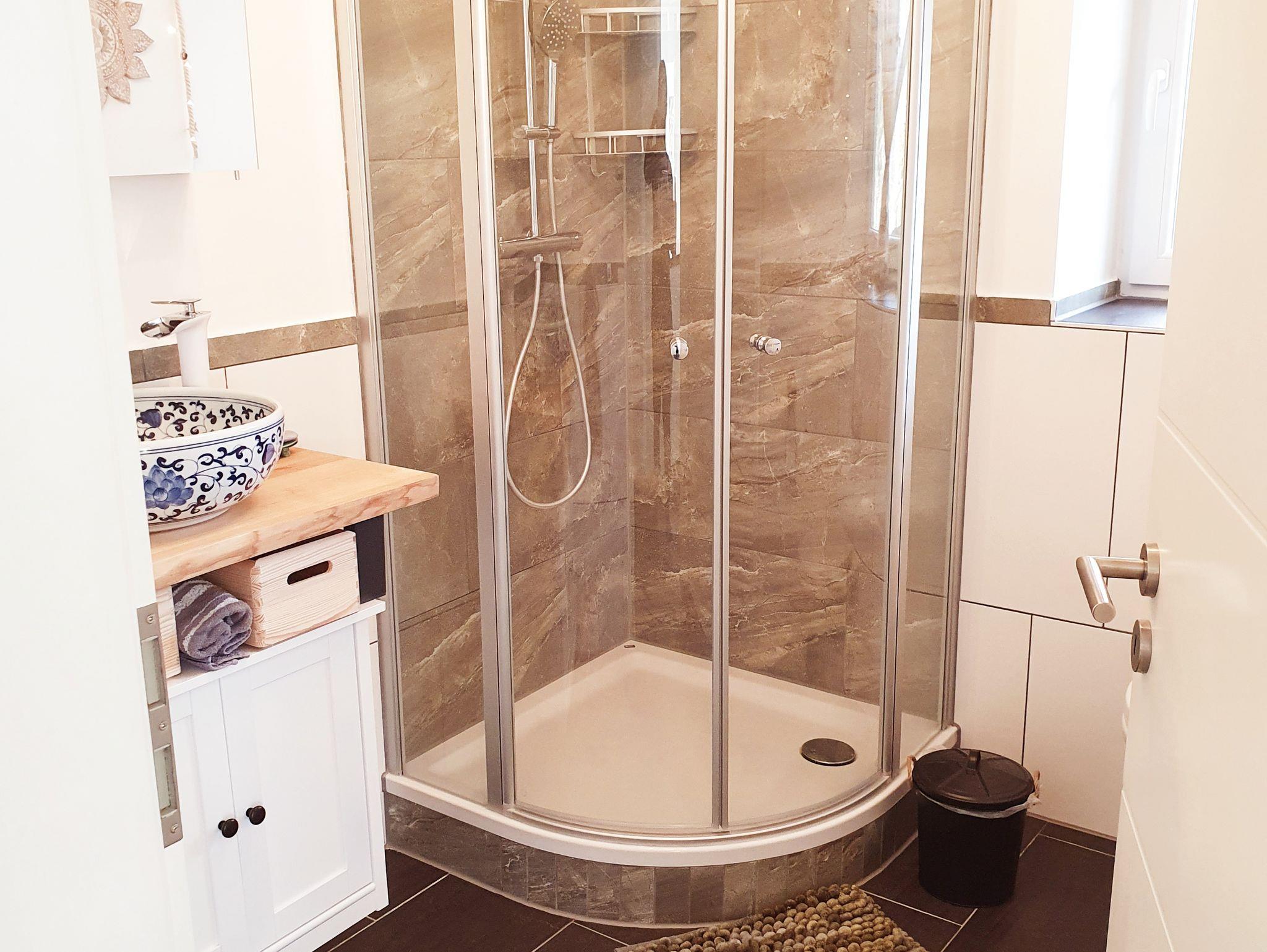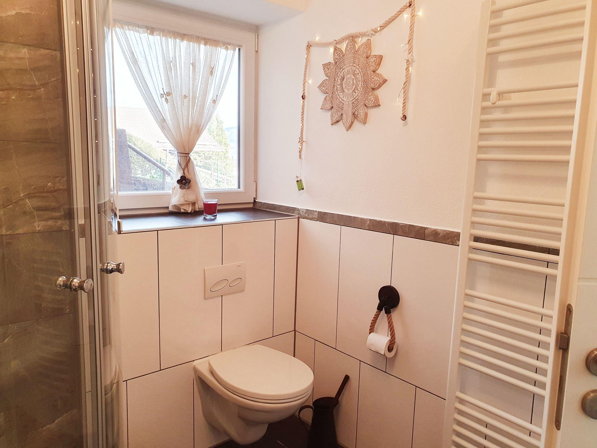 Auf beiden Etagen stehen sanitäre Einrichtungen zur Verfügung; im Erdgeschoss ein großzügiges Badzimmer mit Dusche und WC, sowie im Obergeschoss ein Badezimmer mit Whirlwanne und ein separates WC.
