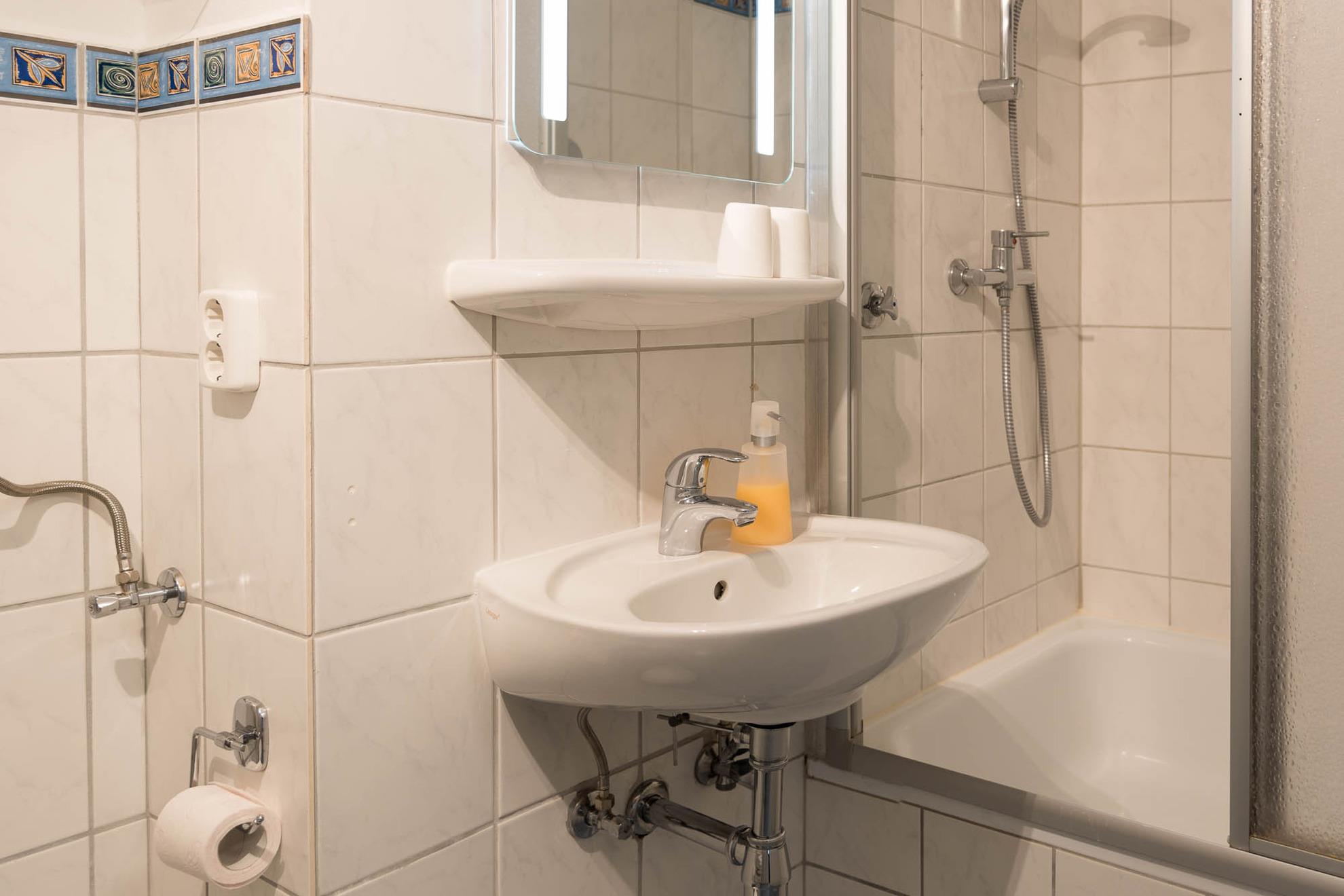 Das Badezimmer befindet sich in einem gepflegten Zustand und ist mit einer Dusche ausgestattet.