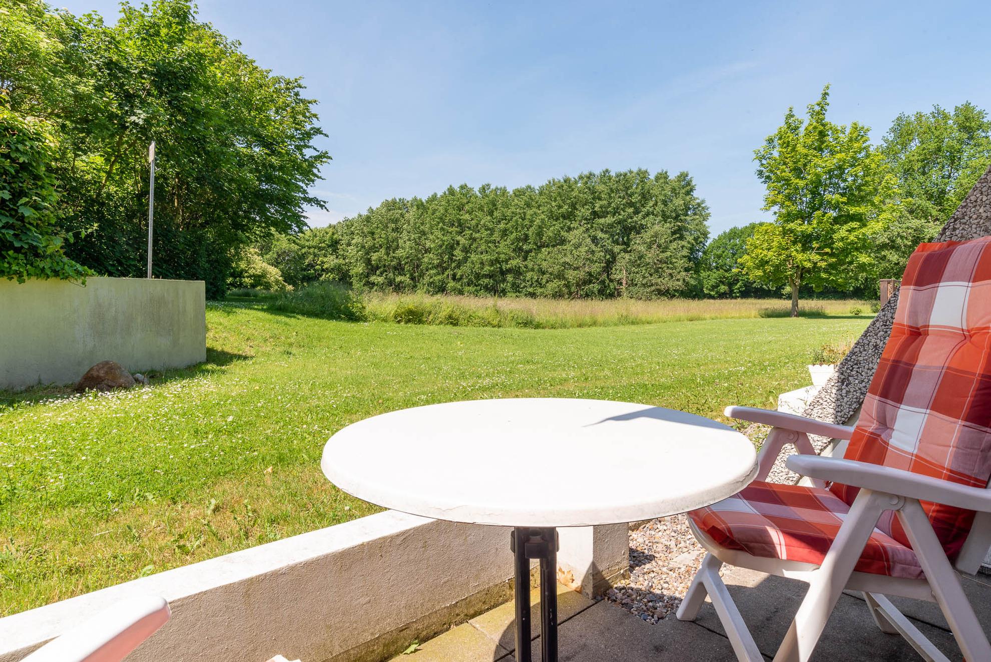 Die Ferienwohnung befindet sich im Erdgeschoss und verfügt über eine schöne Terrasse, die zur Sonnenseite gelegen ist. Zwei Gartenstühle und ein Tisch stehen für Sie bereit. Genießen Sie ab der Mittagszeit die Sonne und den Blick in den grünen Park. Zum Sonnenschutz verfügt die Terrasse über eine ausfahrbare Markise.