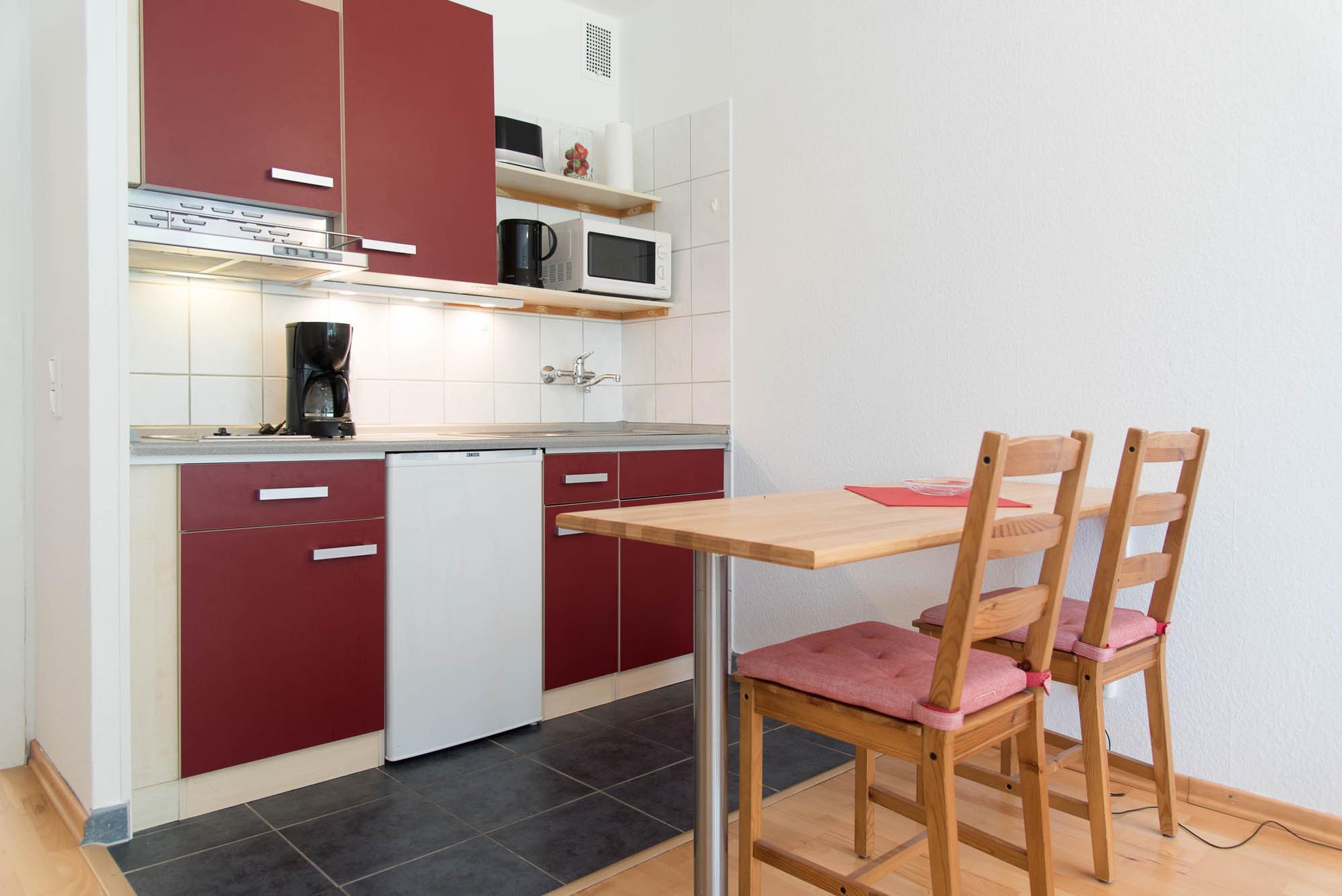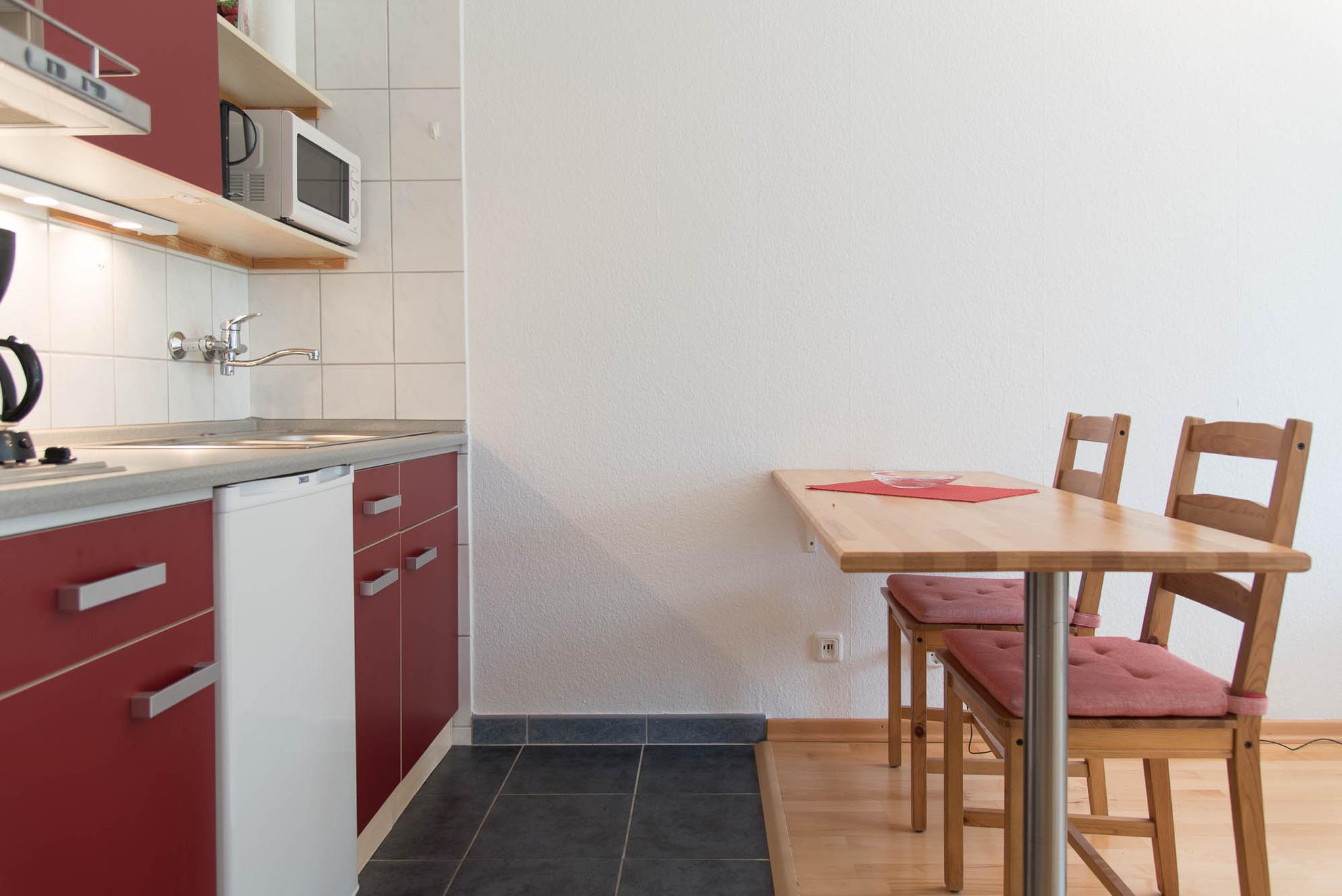 Die Küche ist funktionell eingerichtet und hat alles Notwendige, um zu frühstücken, oder kleinere Mahlzeiten zu kochen. Neben dem Cerankochfeld mit zwei Kochfeldern verfügt der Kühlschrank über ein kleines Gefrierfach und die vorhandene Mikrowelle ist mit Grillfunktion ausgestattet.