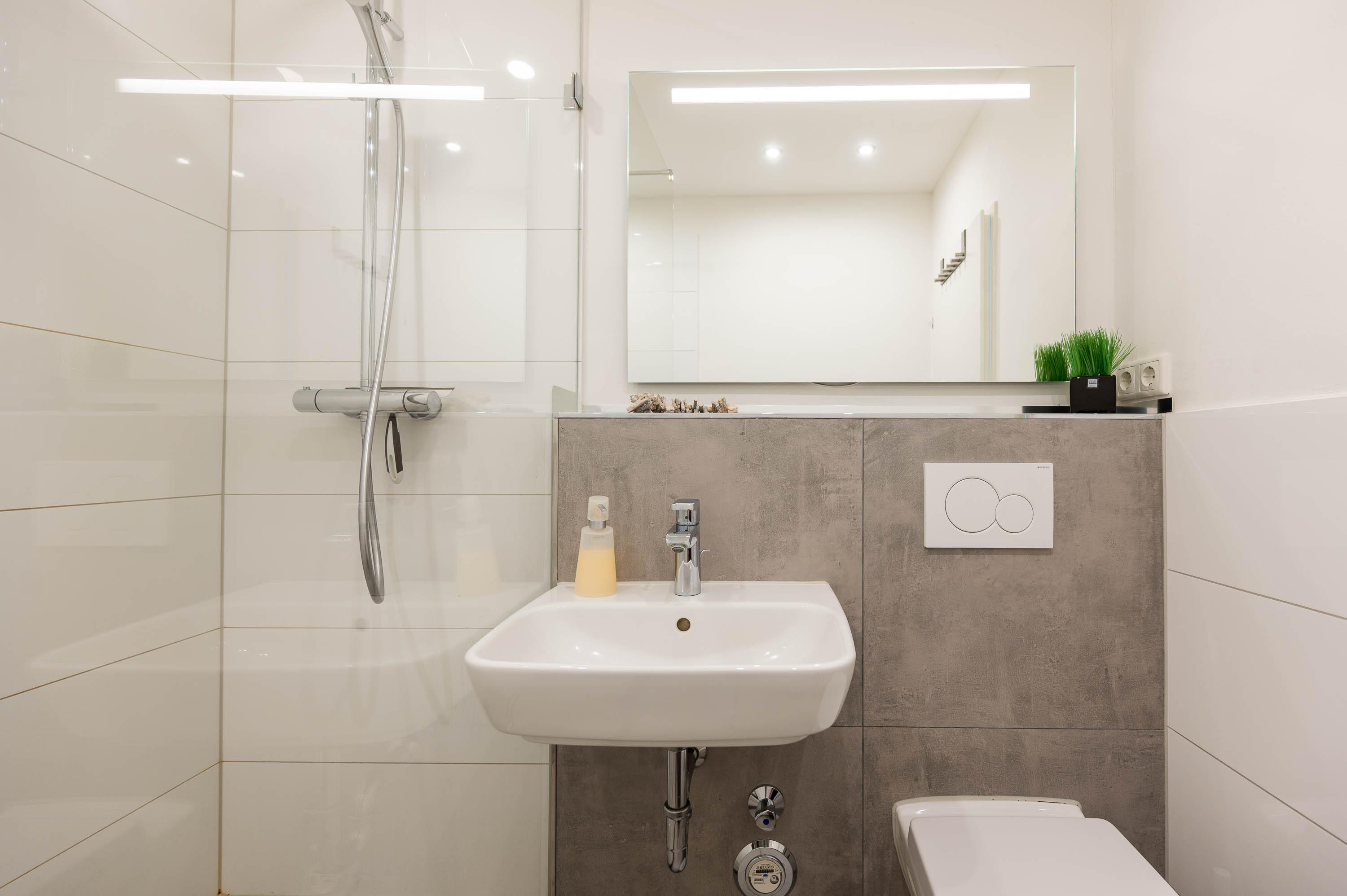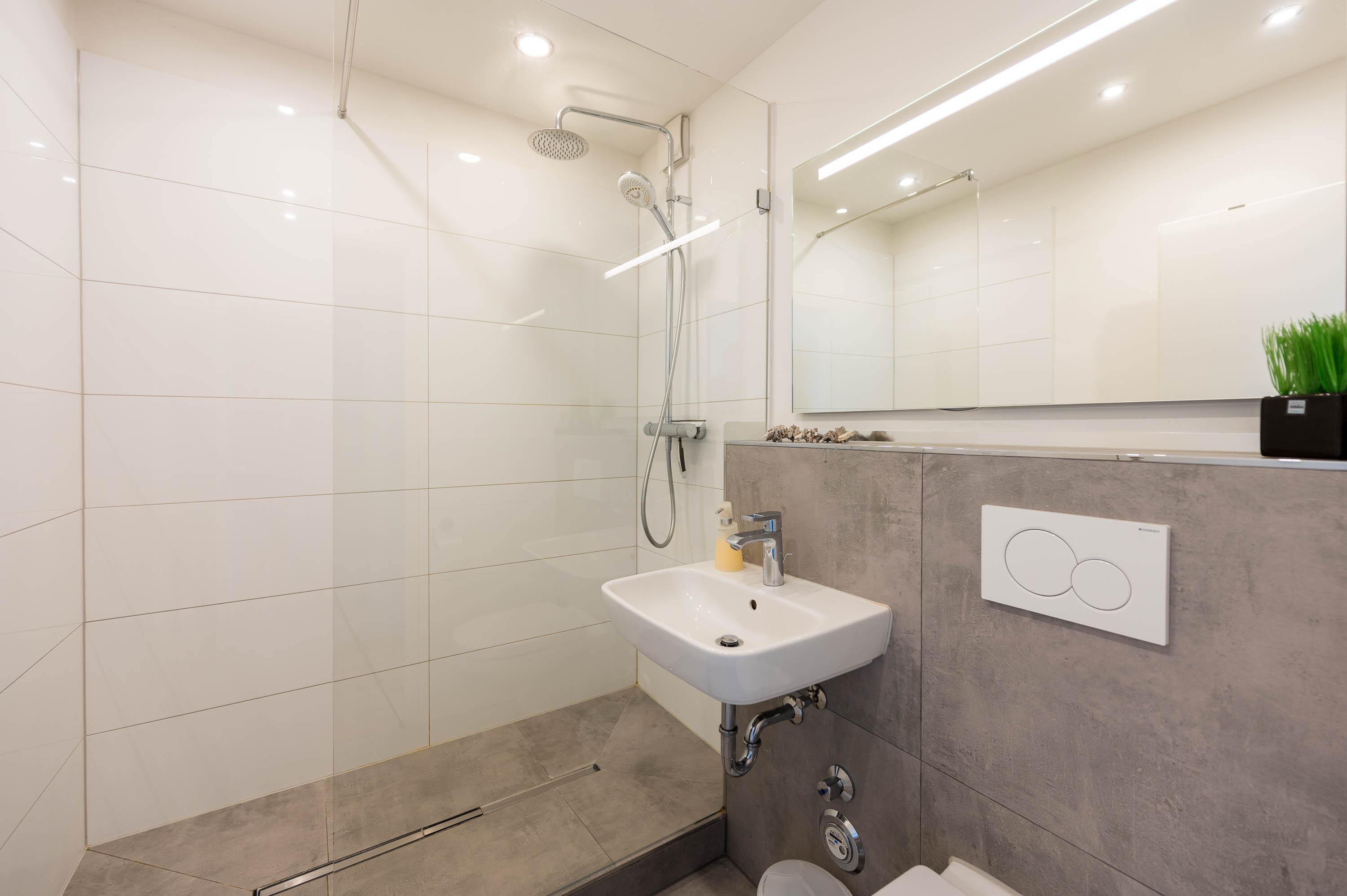 Das gepflegte Badezimmer besticht mit einer großen Dusche (Regenkopf- und Handbrause) und einem Handtuchheizkörper.