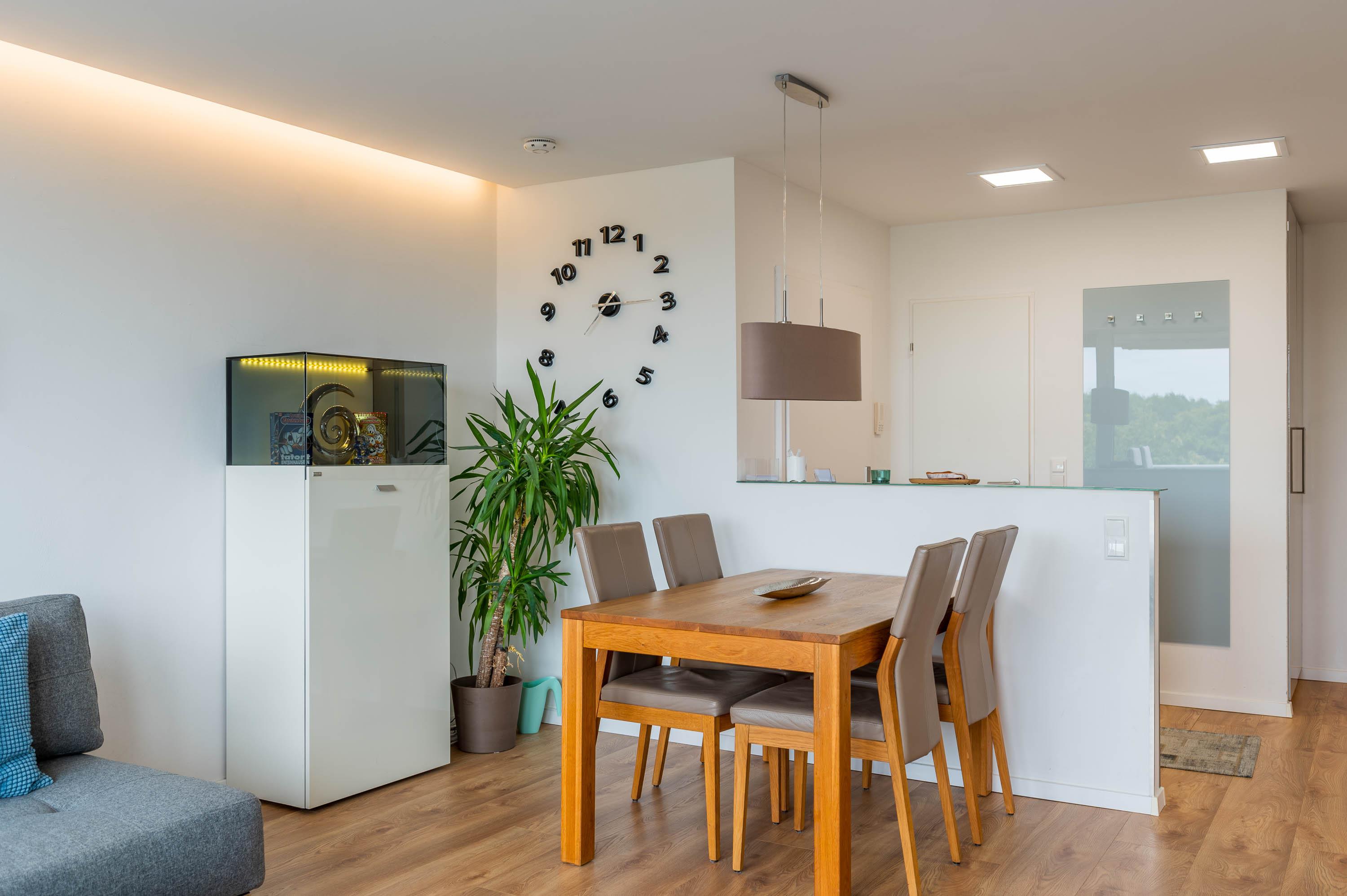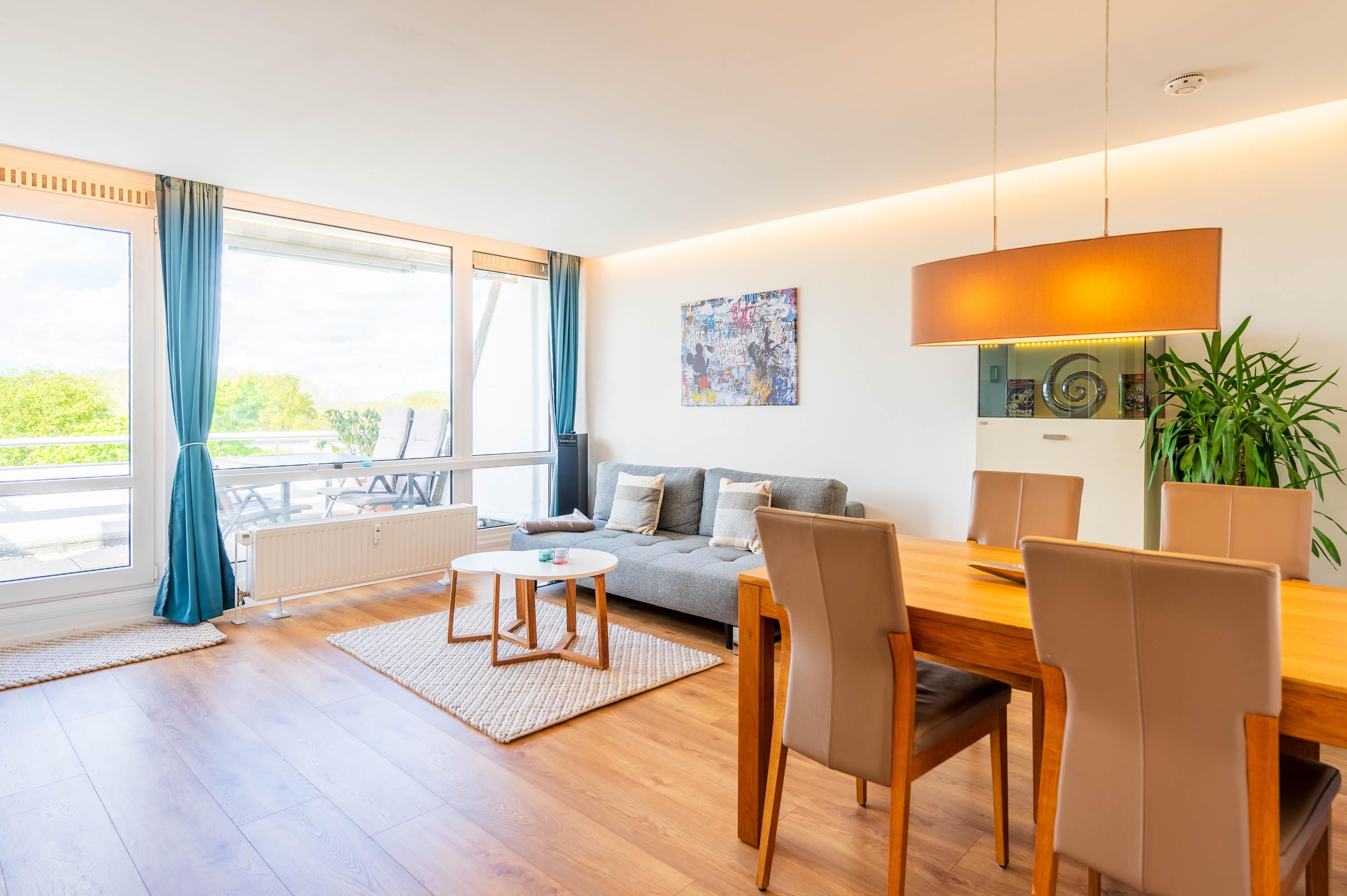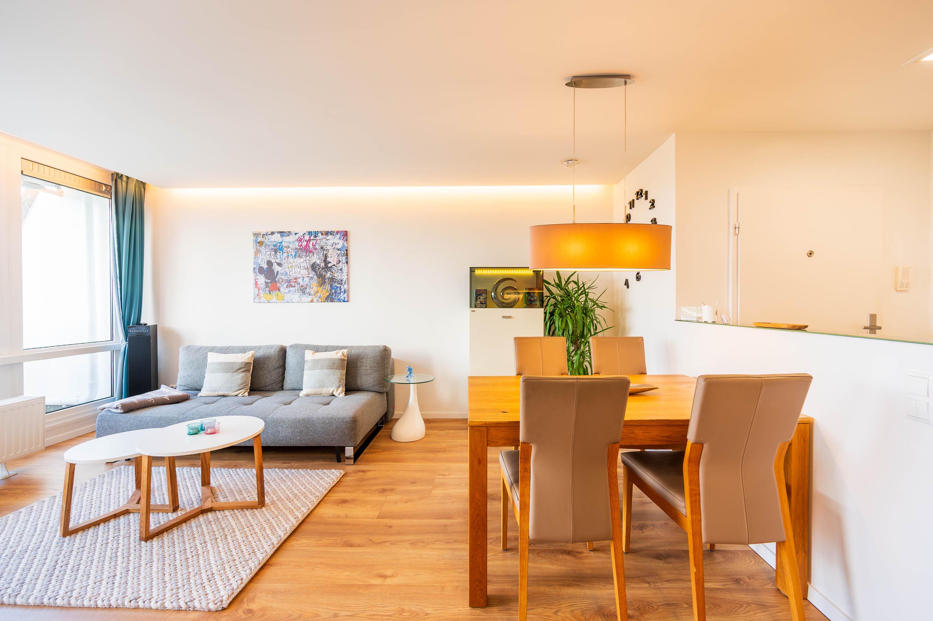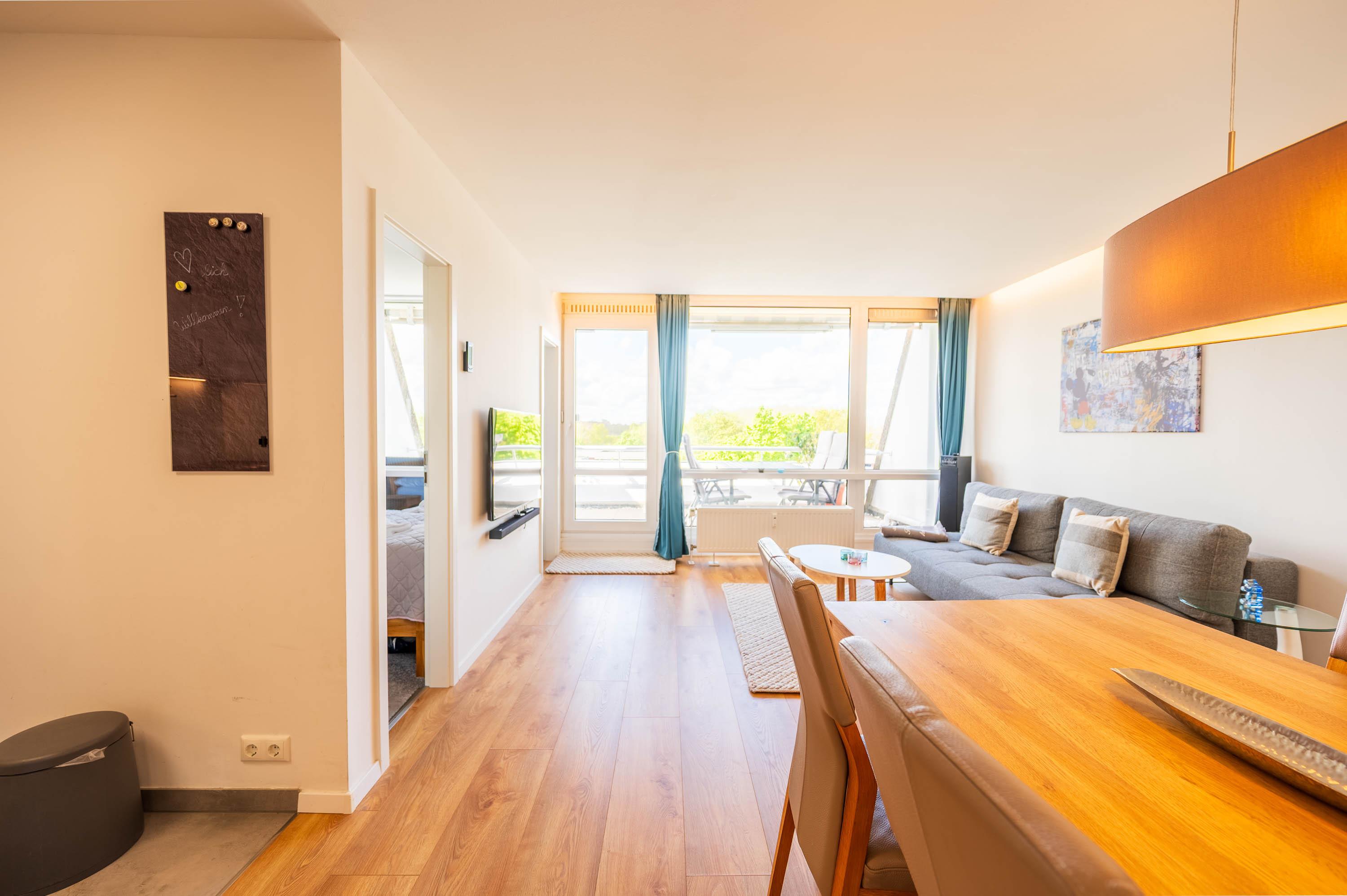 Diese komplett renovierte und modern eingerichtete Ferienwohnung ist durch die bodentiefe Fensterfront in südwestlicher Richtung komplett lichtdurchflutet und lädt mit dem hellen Laminat-Fußboden zum Wohlfühlen ein. Durch eine eingezogene halbhohe Wand wird der Eingangsbereich optisch geschickt vom Wohn- und Essbereich getrennt. Somit bekommt das Apartment einen loftartigen-Charakter. Im Flurbereich befinden sich eine Abstellkammer und ein Kleiderschrank.