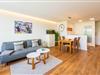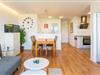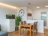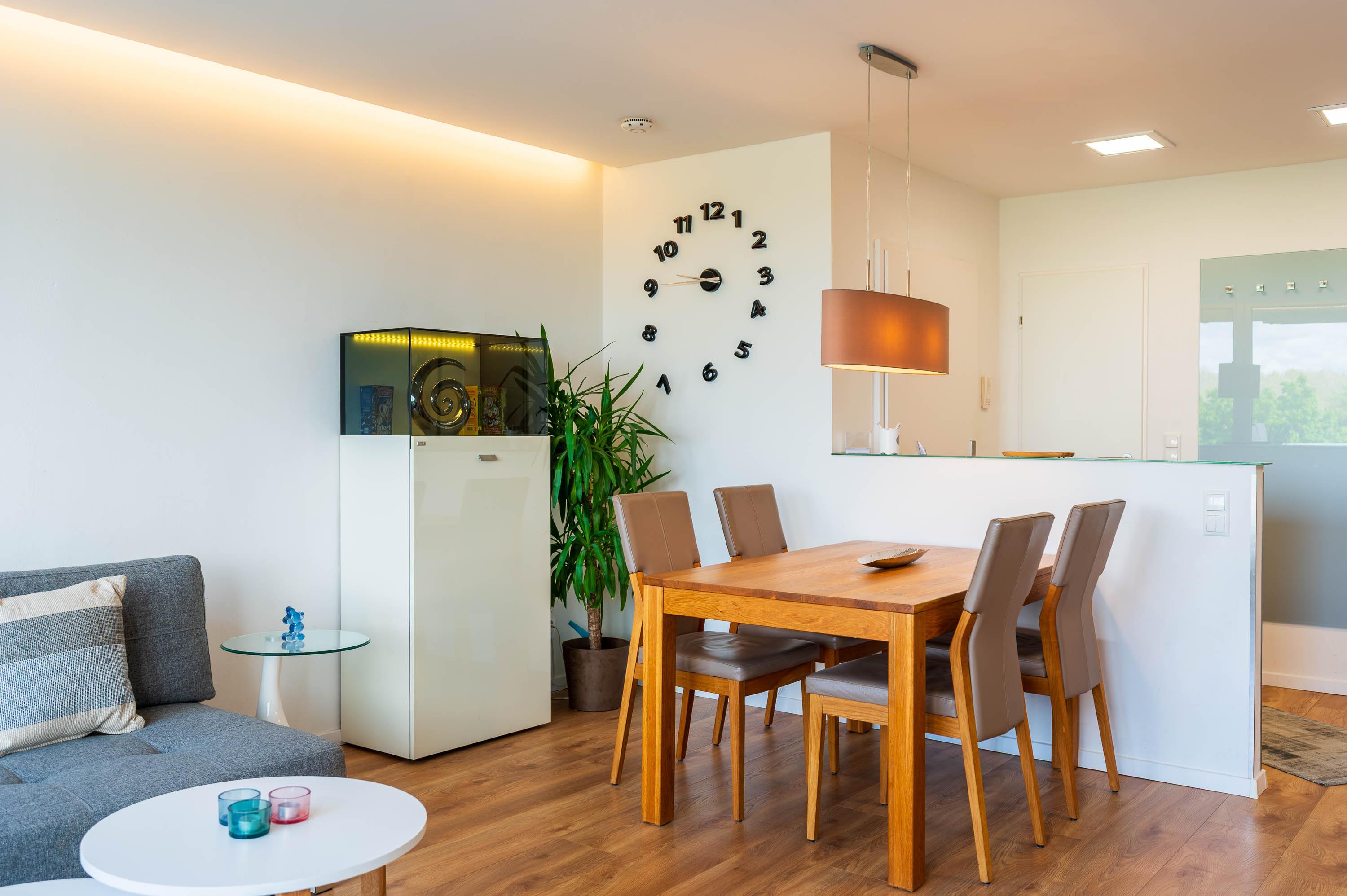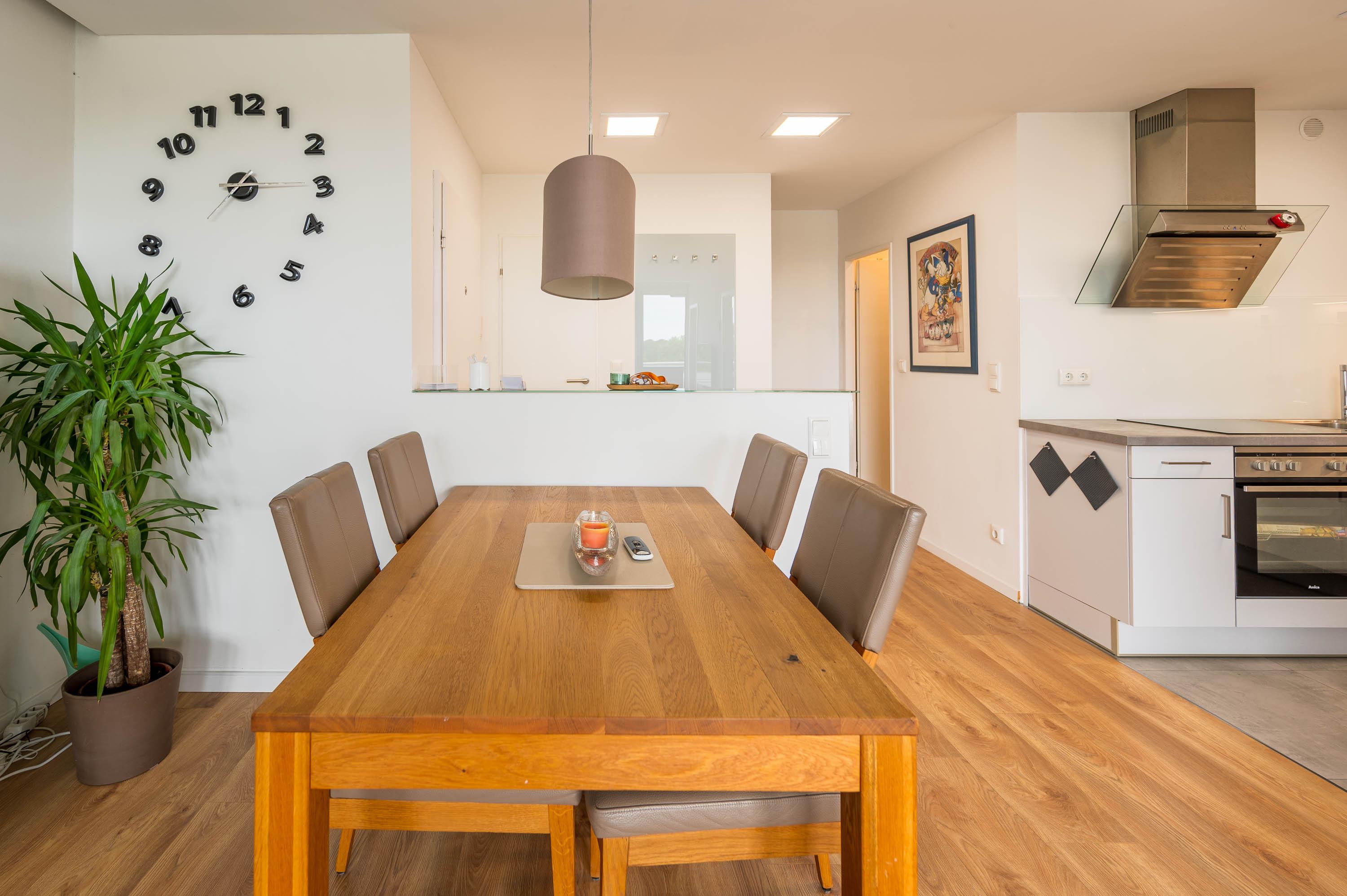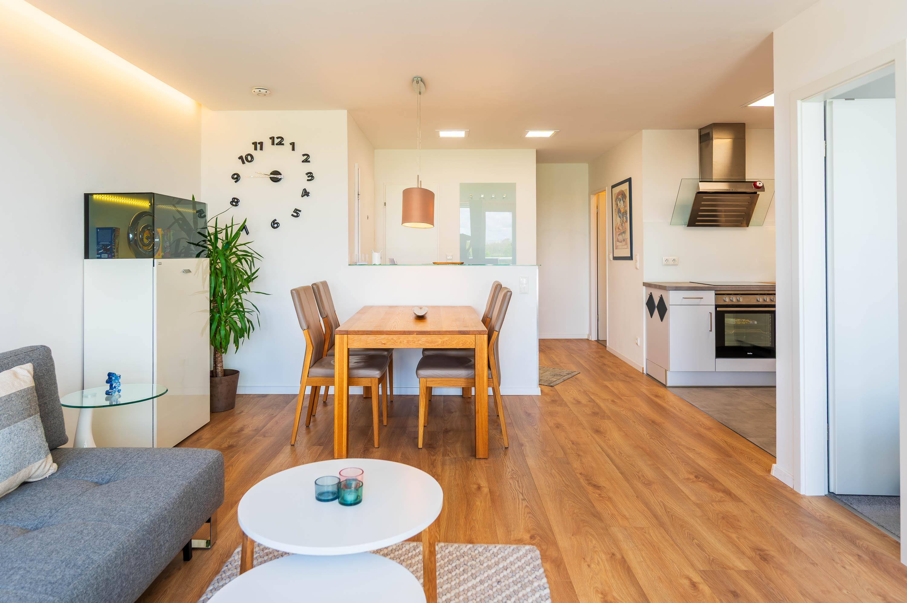 Im Wohnbereich bietet ein großer Holztisch mit vier bequemen Stühlen ausreichend Platz – perfekt für ein Essen in gemeinsamer Runde. Direkt gegenüber befindet sich die angrenzende Einbauküche. Die offene Küche mit Arbeitsfläche in Betonoptik ist mit hochwertigen Elektrogeräten ausgestattet. Ceranherd, Backofen und Geschirrspüler, Kühlschrank mit separatem Gefrierfach, Wasserkocher, Toaster und eine Kaffeemaschine bietet eine Ausstattung fast wie zu Hause.