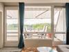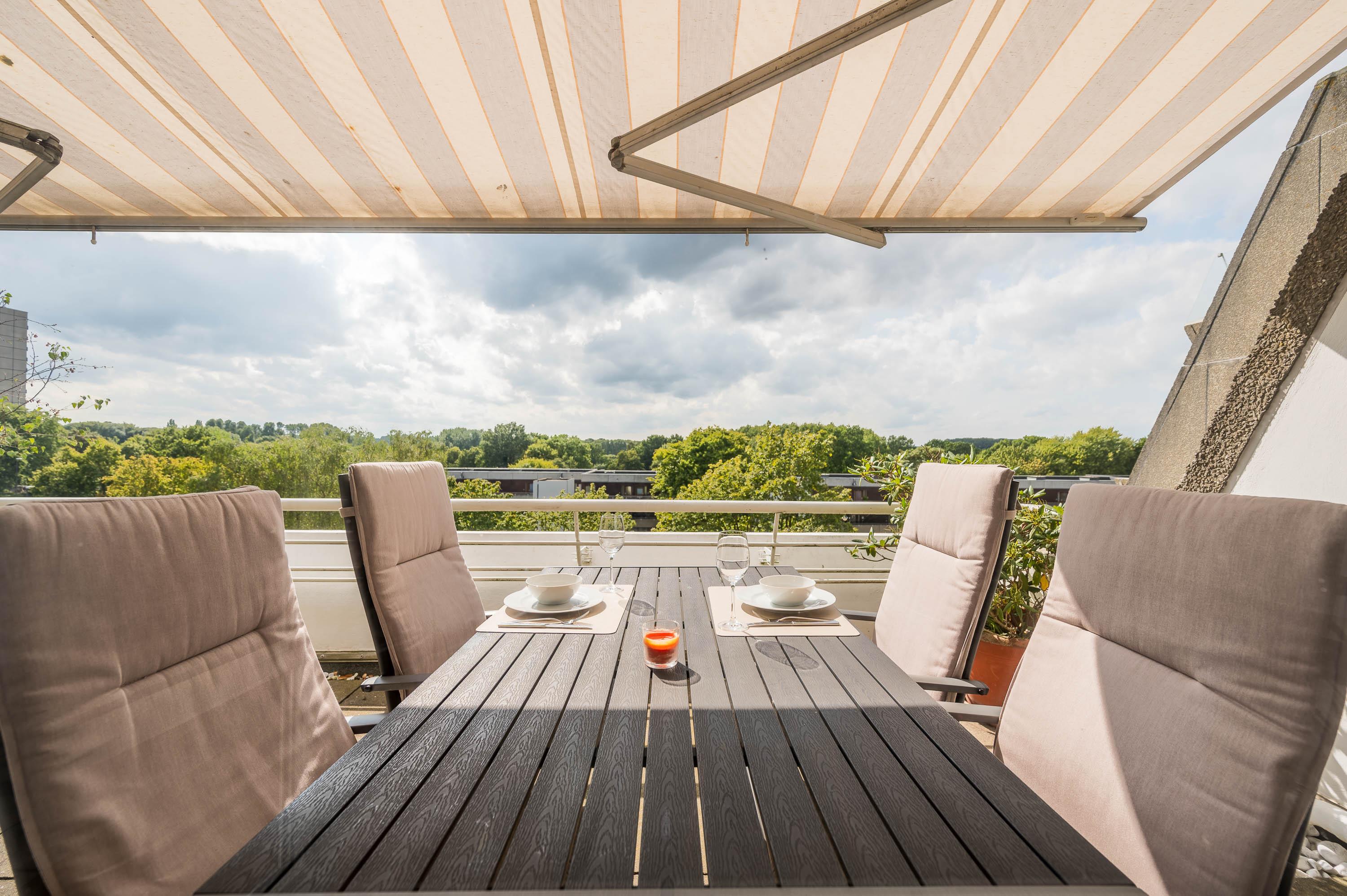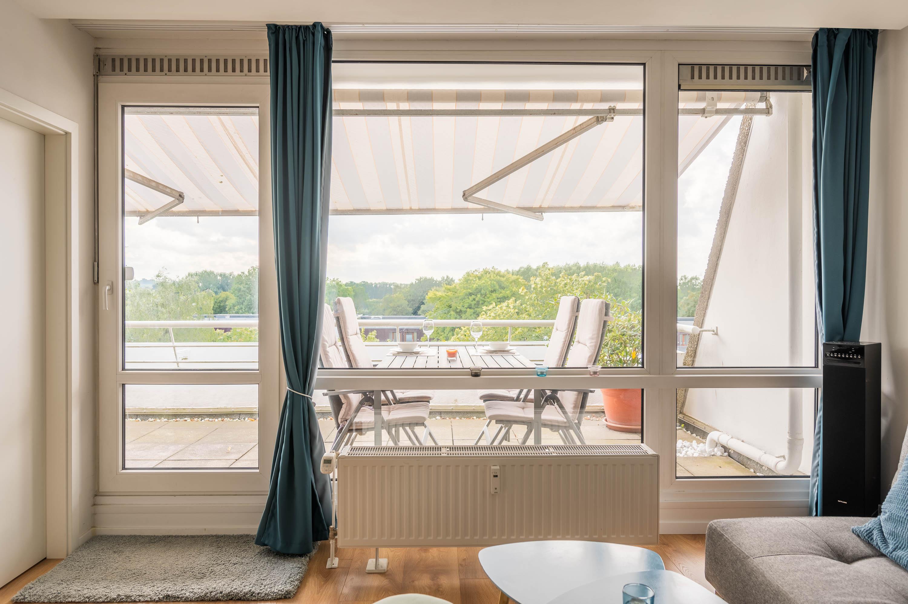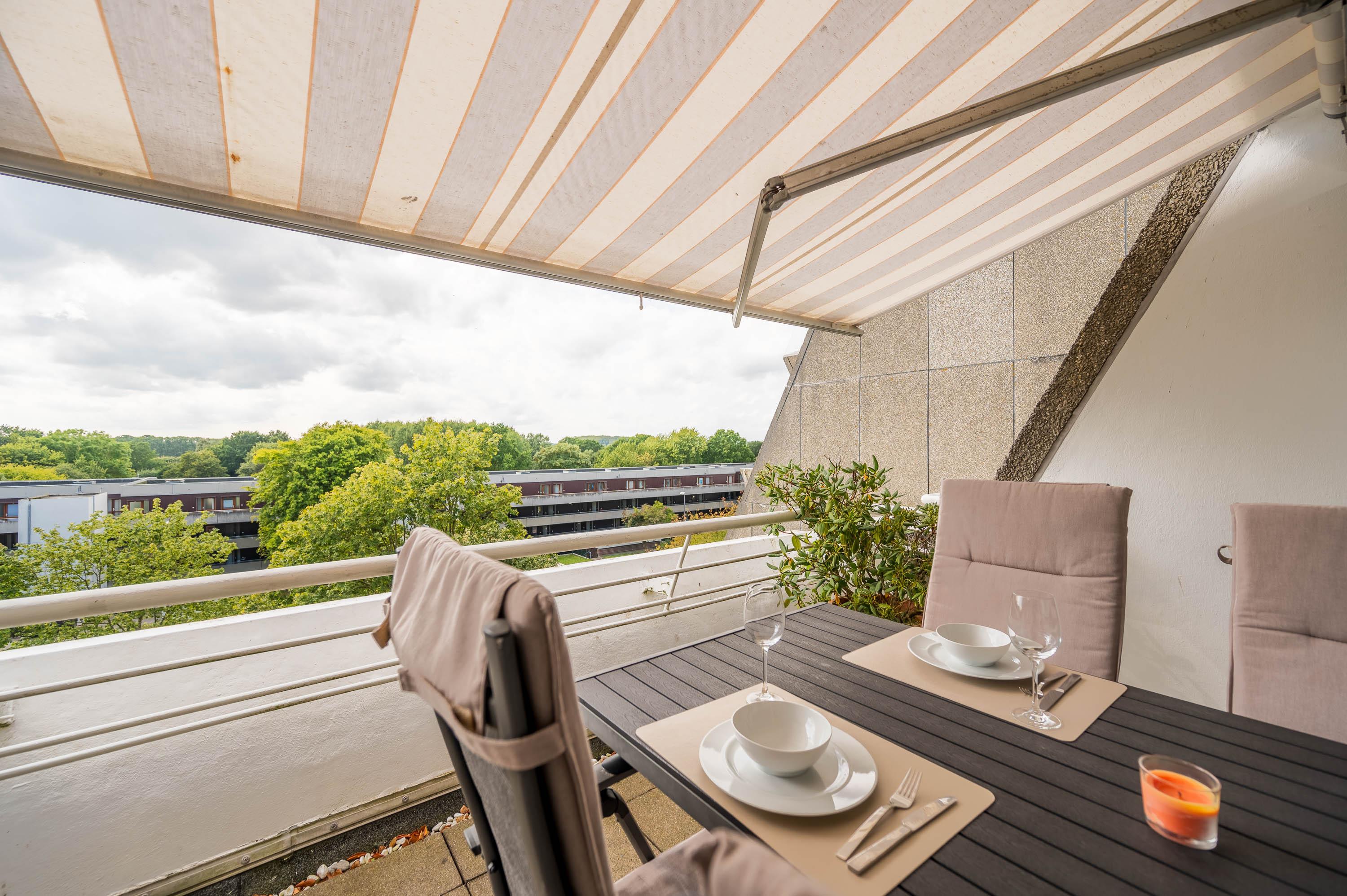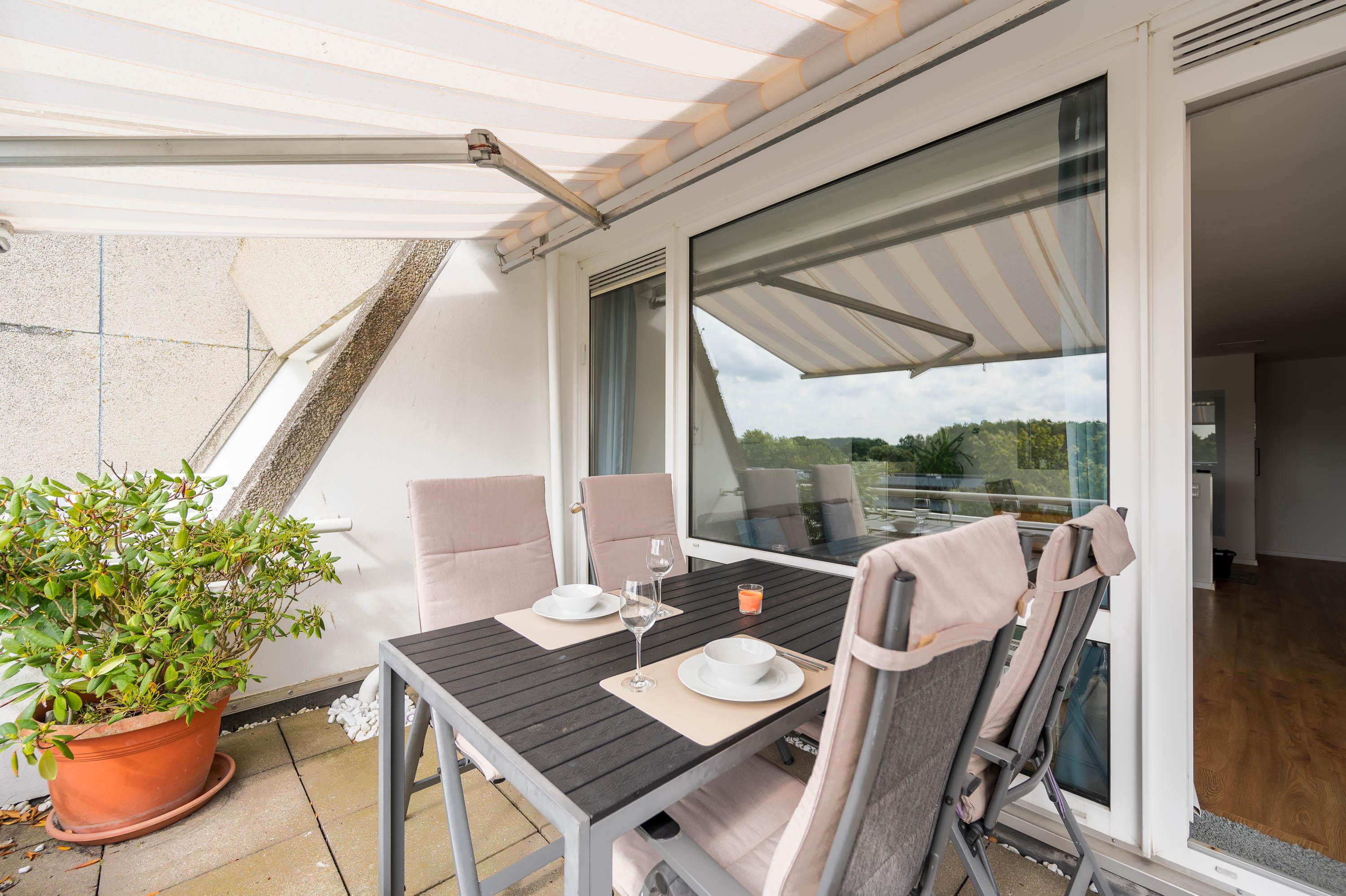 Der Balkon, welcher sich über die gesamte Breite des Apartments verläuft, ist mit Tisch und Stühlen sowie einer Markise ausgestattet. Durch die südwestliche Lage können Sie auch abends die Sonne in vollen Zügen genießen.