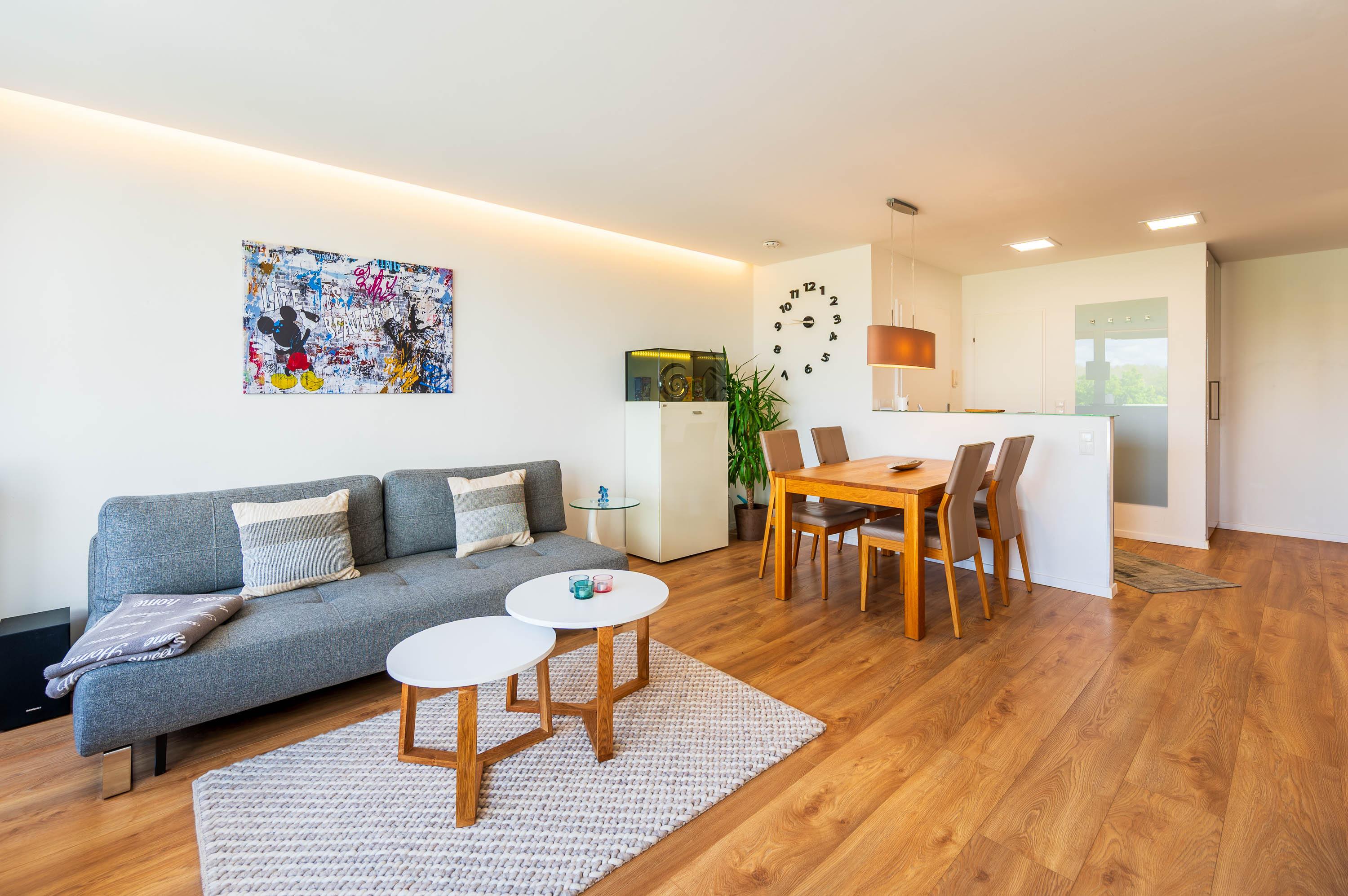 Im großzügig geschnittenen Wohnbereich finden Sie eine gemütliche Couch. Mit nur wenigen Handgriffen lässt sie sich in eine bequeme Schlafcouch (160 x 200) umwandeln und bietet weiteren Platz für bis zu 2 Personen. Von der Couch aus lassen gemütliche Fernsehabende keine Wünsche offen: Ein LCD-Fernseher mit USB- und Kabelanschluss bietet die Möglichkeit Ihr Heimkino auch im Urlaub zur Verfügung zu haben. Die Ferienwohnung ist außerdem mit kostenlosem WLAN und einer Stereoanlage ausgestattet.