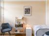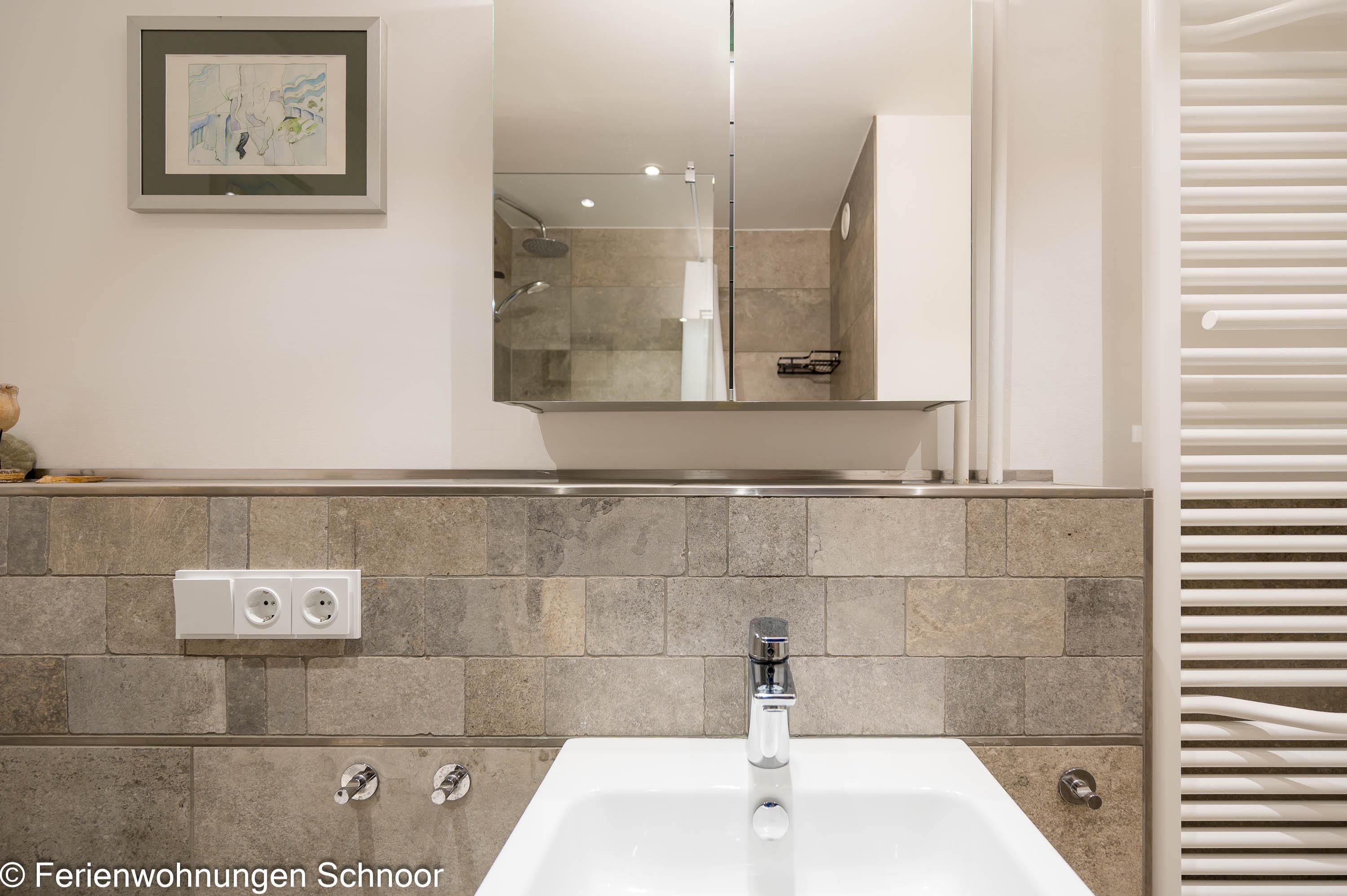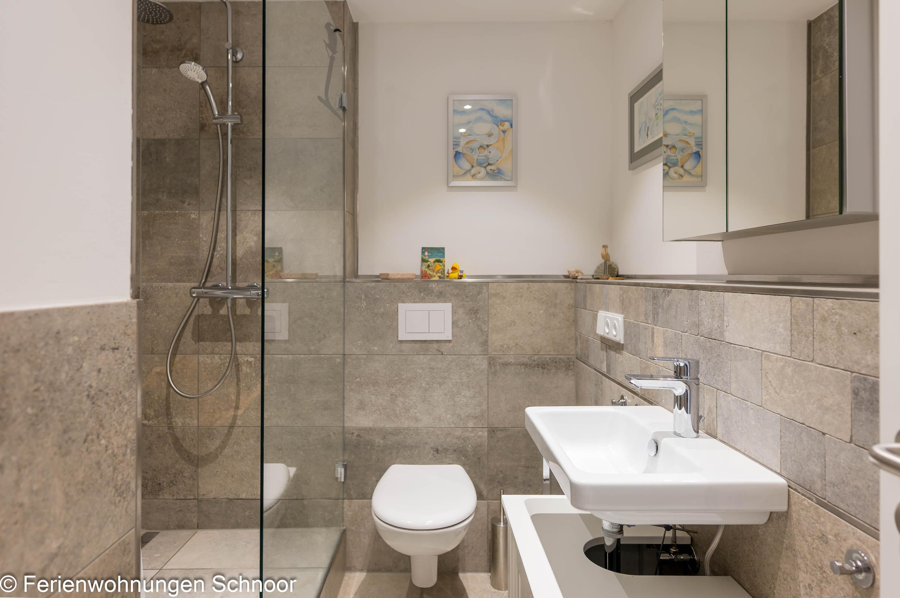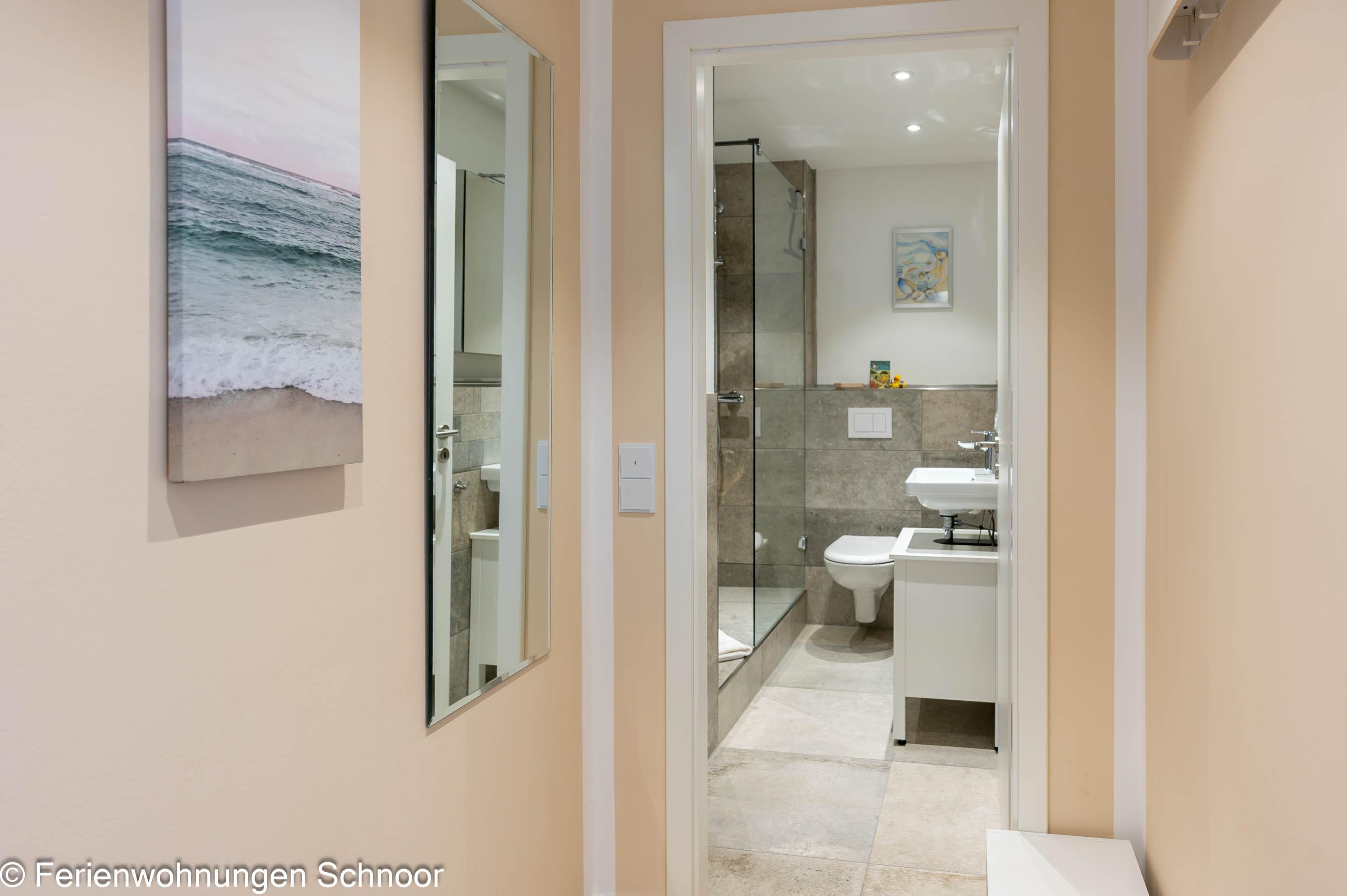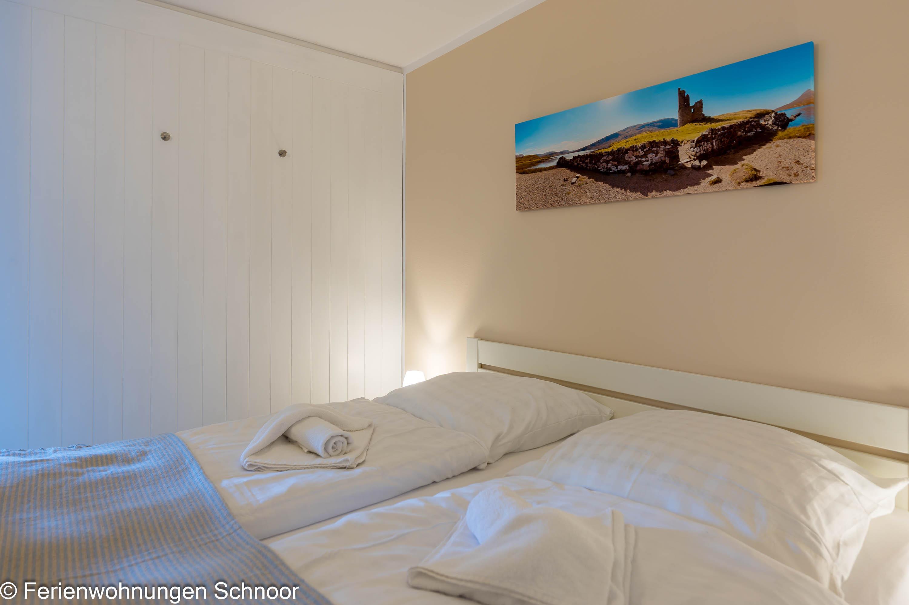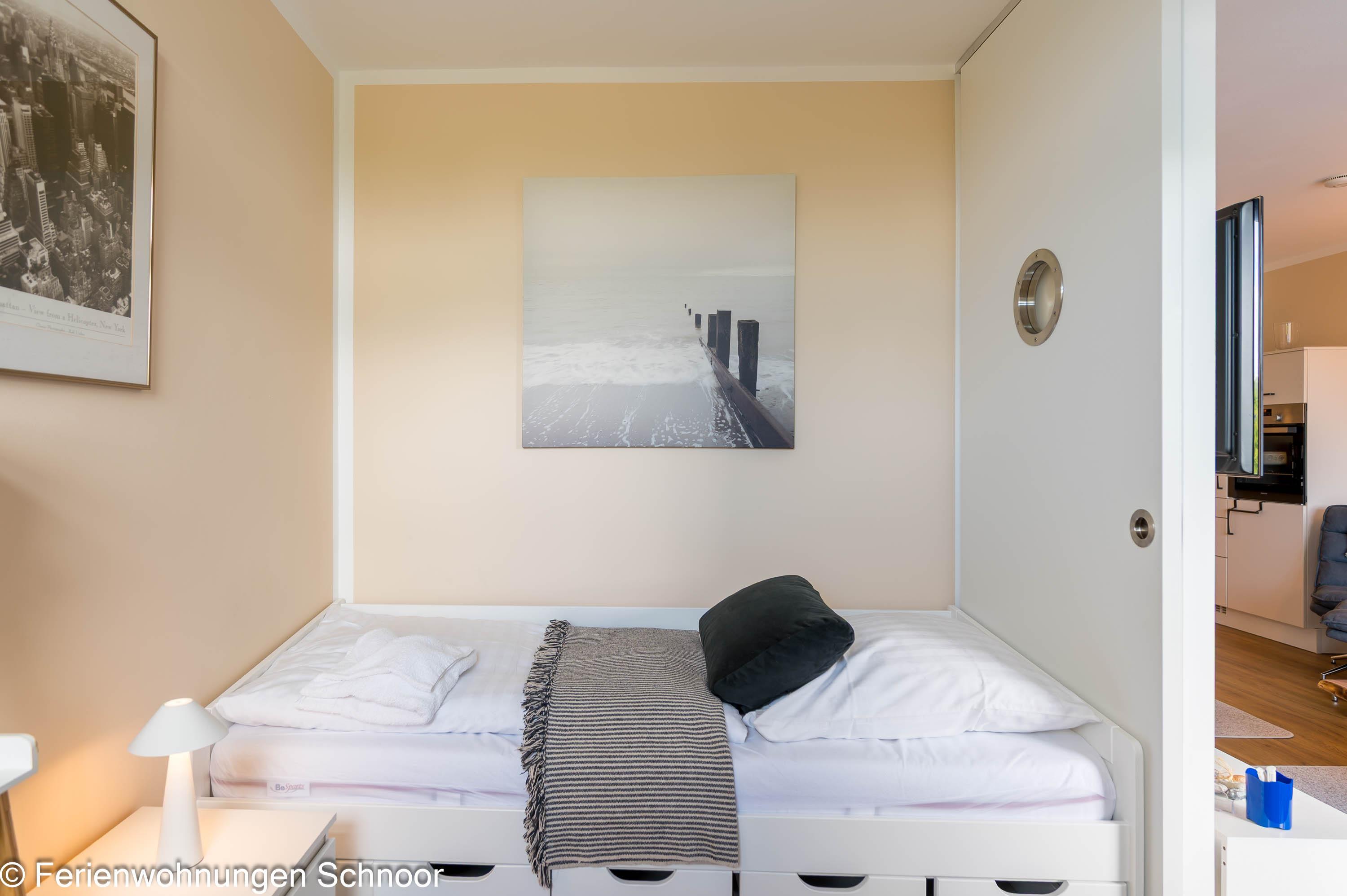 Der Schlafbereich mit einem gemütlichen Doppelbett (160x200) ist durch eine Wand vom Wohnraum abgetrennt. In einem separaten Zimmer gibt es einen Schreibtisch und ein Einzelbett (90x200) für eine dritte Person. Dieser Raum kann mit Plissees abgedunkelt werden. Das moderne Badezimmer verfügt über eine große Walk-in-Dusche, einen großen Spiegel und eine Handtuchheizung.