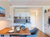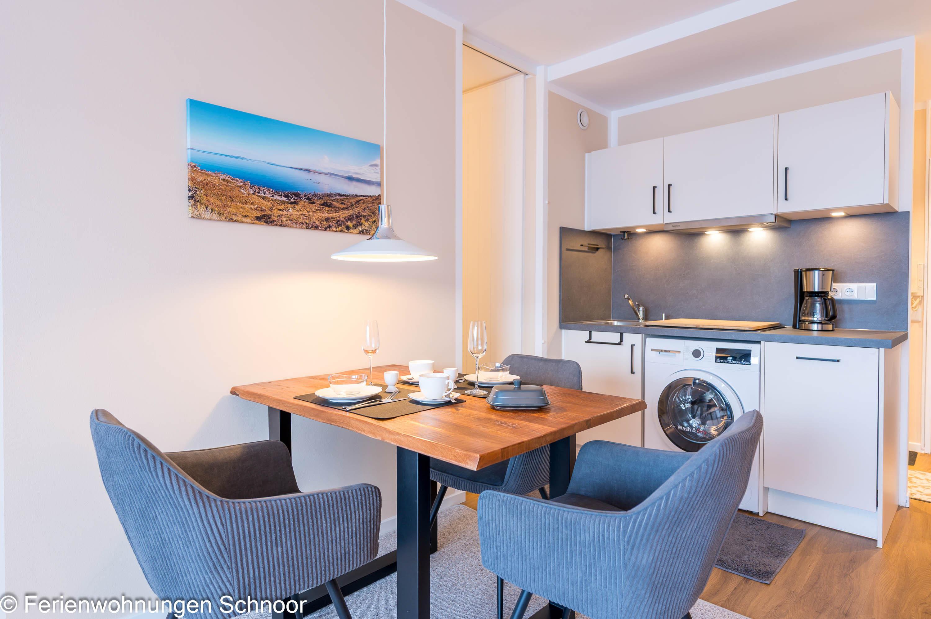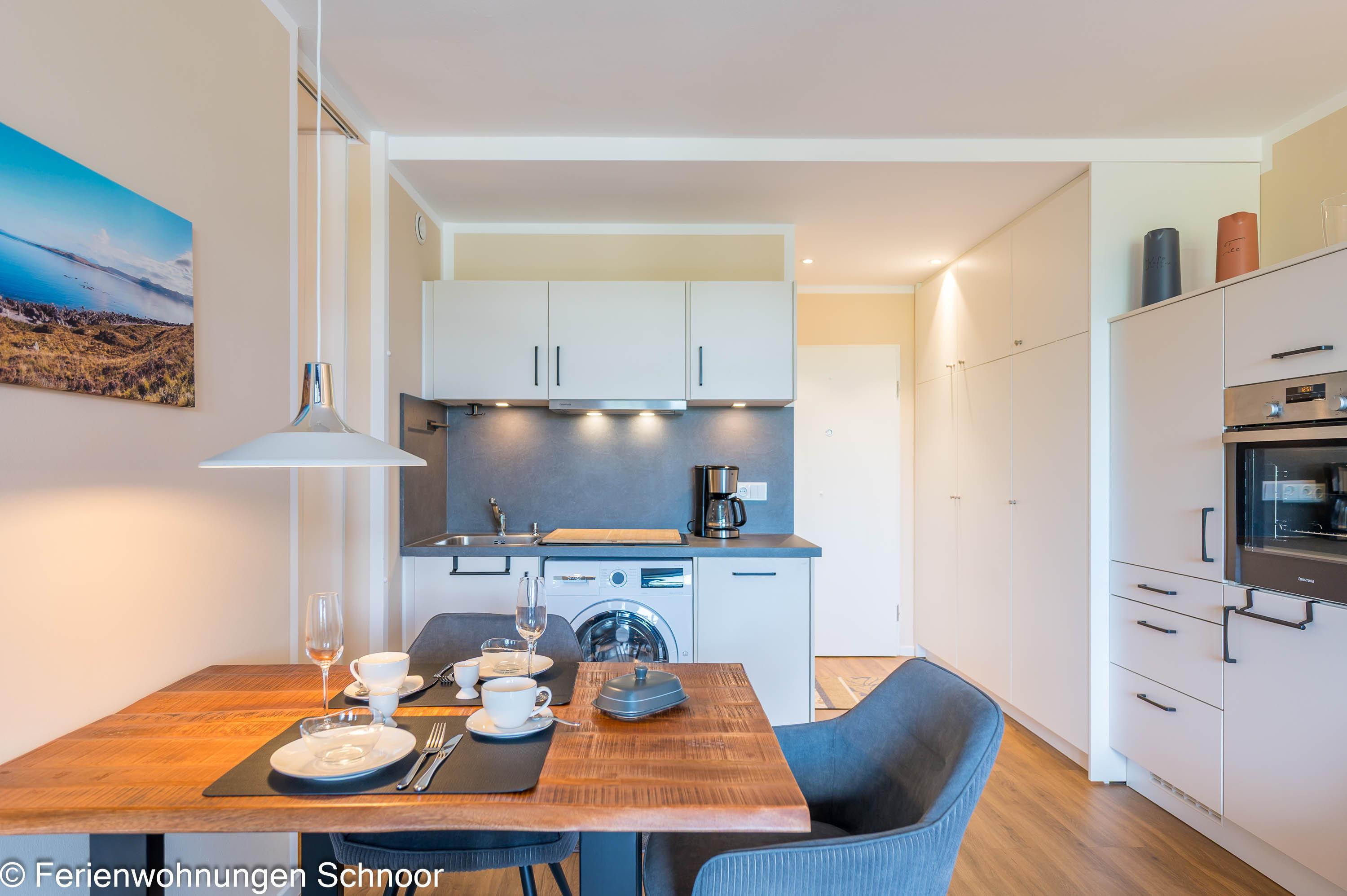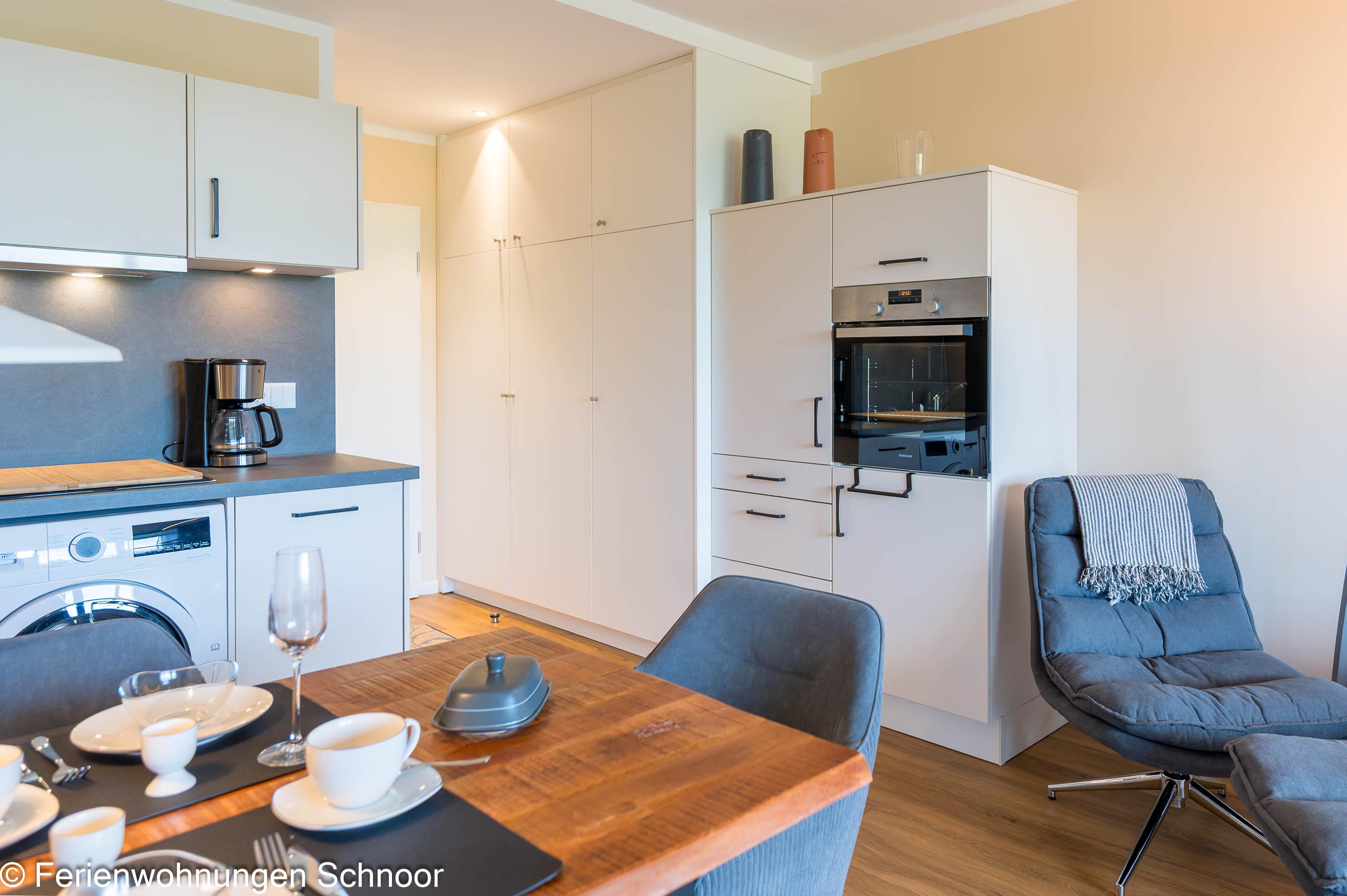 Der offene Wohn- und Essbereich ist lichtdurchflutet und verfügt über eine komfortable Couch, einen Sessel, einen LCD-Fernseher und einen Esstisch für drei Personen. Durch Gardinen kann der Raum abgedunkelt werden. Die angrenzende Küche ist mit einem Cerankochfeld, einem separaten Backofen auf Griffhöhe, einer Kühl- Gefrierkombination und einem Geschirrspüler ausgestattet. Auch eine Kaffeemaschine, ein Toaster und ein Wasserkocher sind vorhanden.