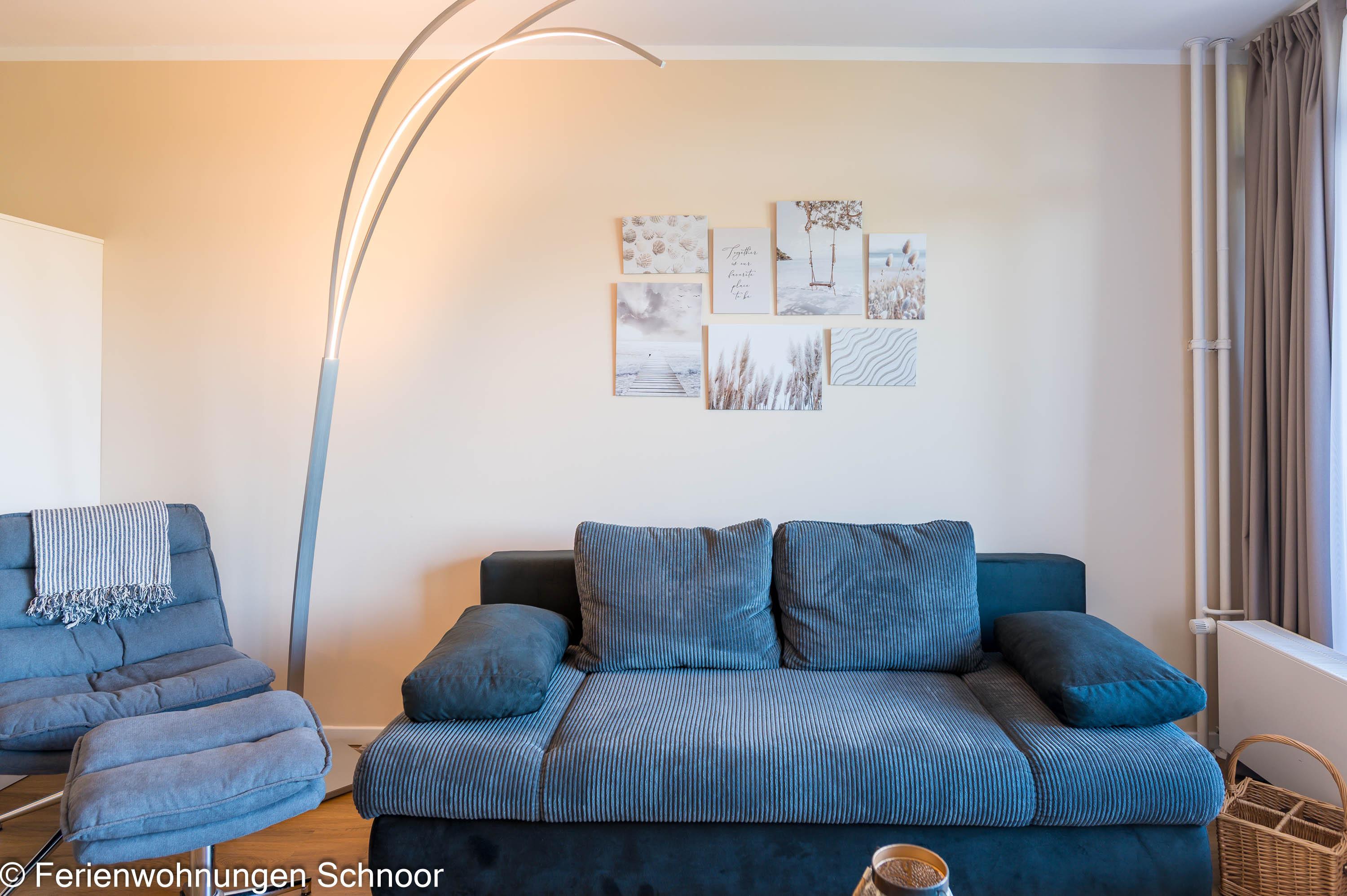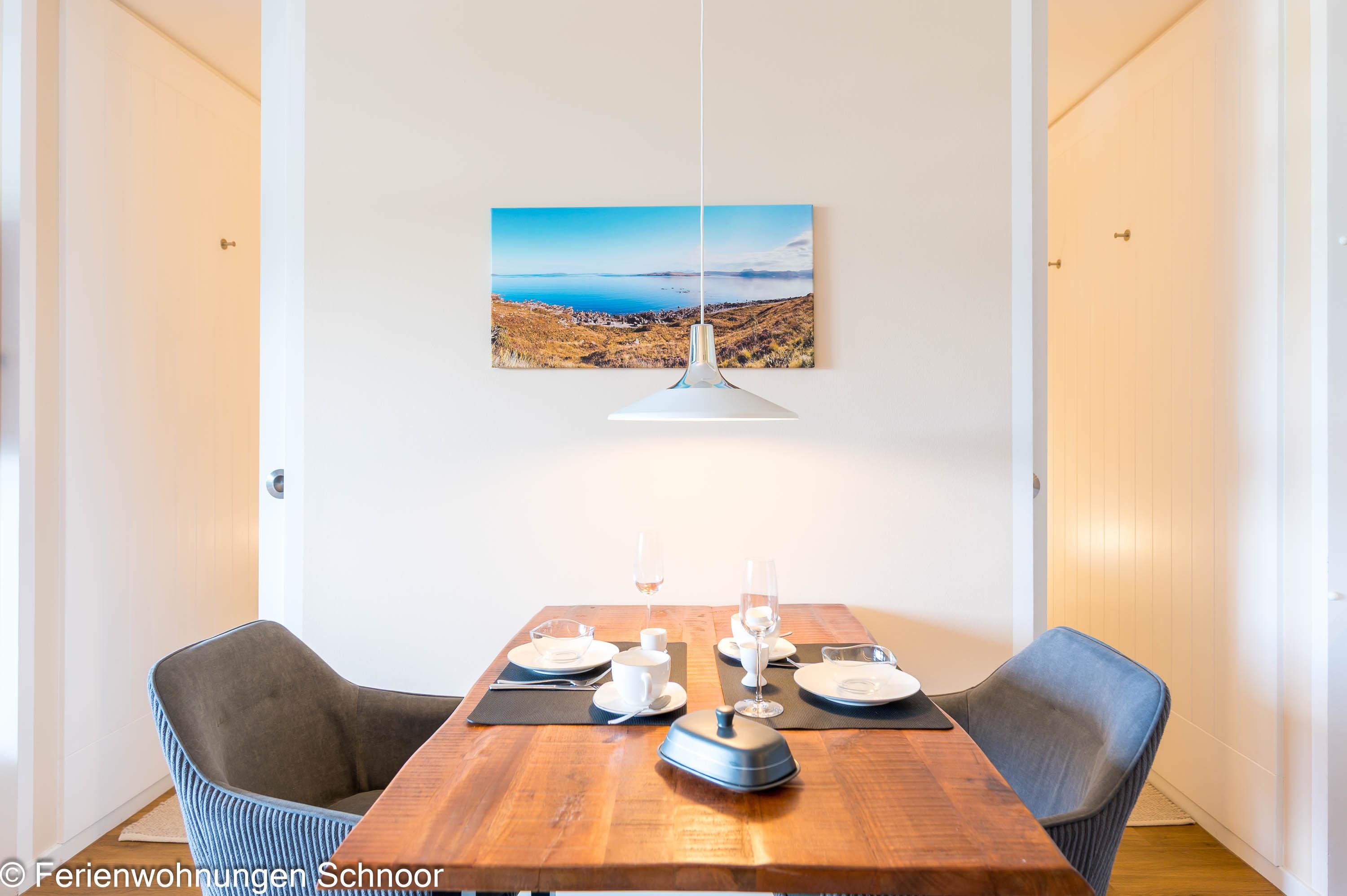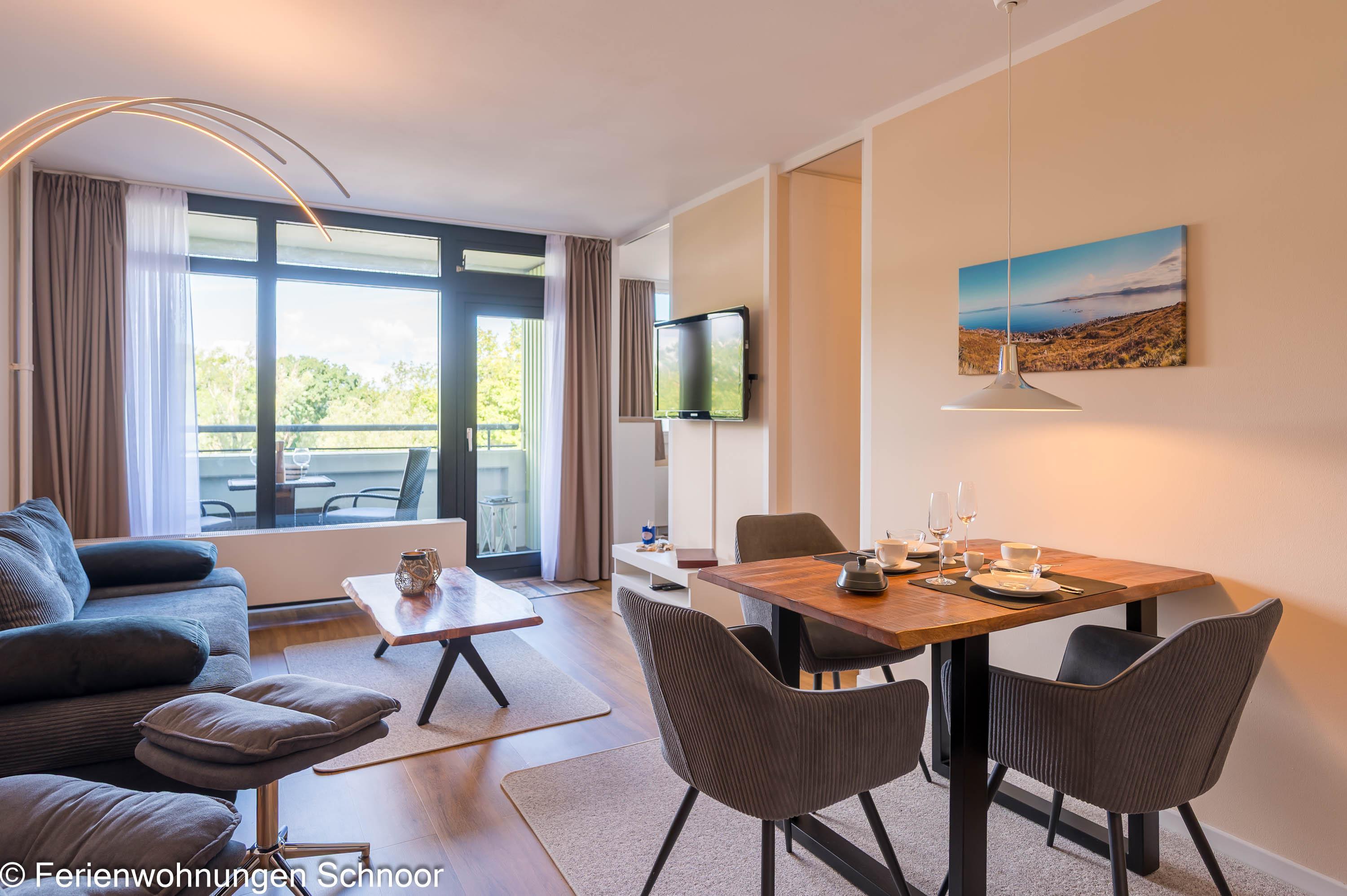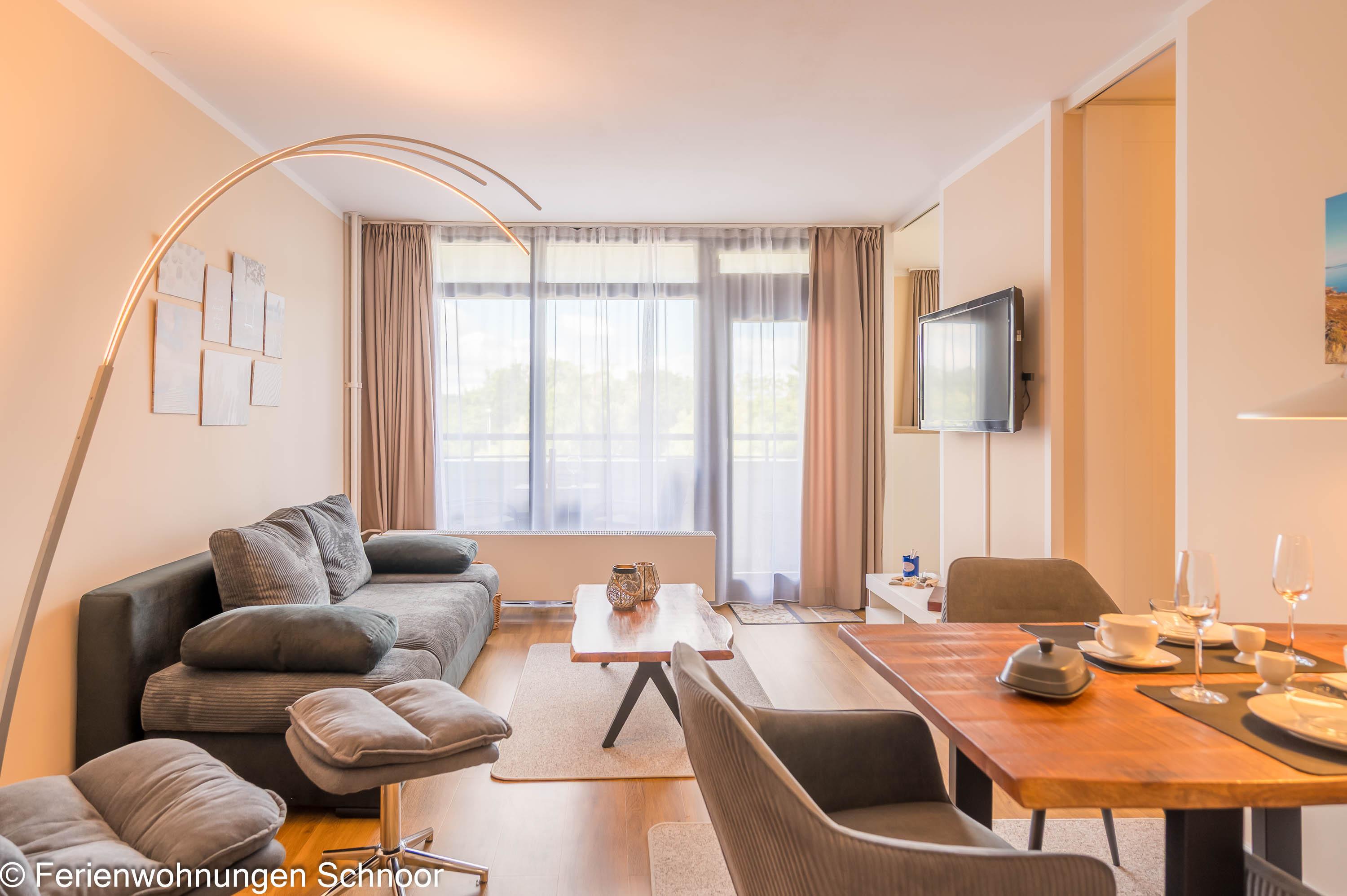 Der offene Wohn- und Essbereich ist lichtdurchflutet und verfügt über eine komfortable Couch, einen Sessel, einen LCD-Fernseher und einen Esstisch für drei Personen. Durch Gardinen kann der Raum abgedunkelt werden. Die angrenzende Küche ist mit einem Cerankochfeld, einem separaten Backofen auf Griffhöhe, einer Kühl- Gefrierkombination und einem Geschirrspüler ausgestattet. Auch eine Kaffeemaschine, ein Toaster und ein Wasserkocher sind vorhanden.