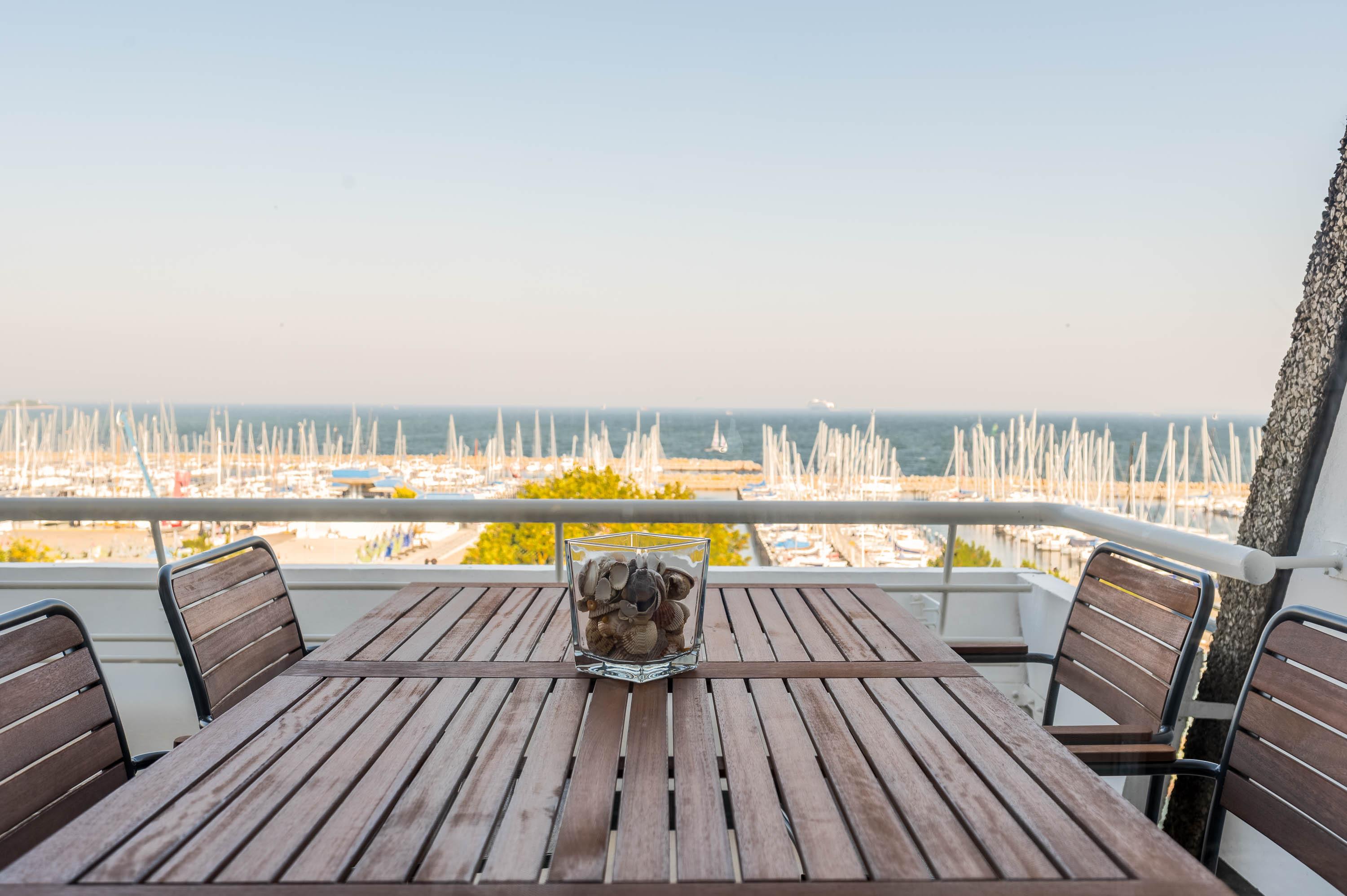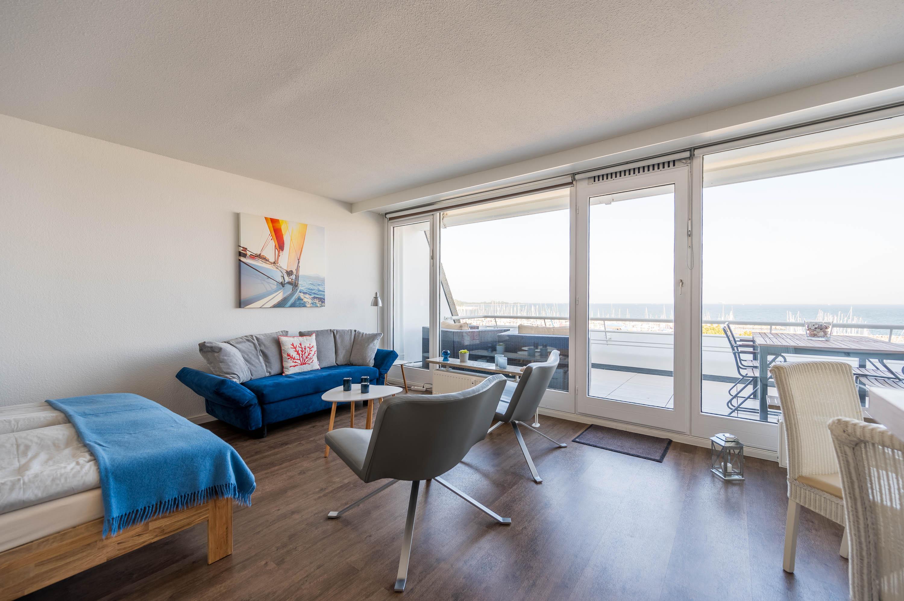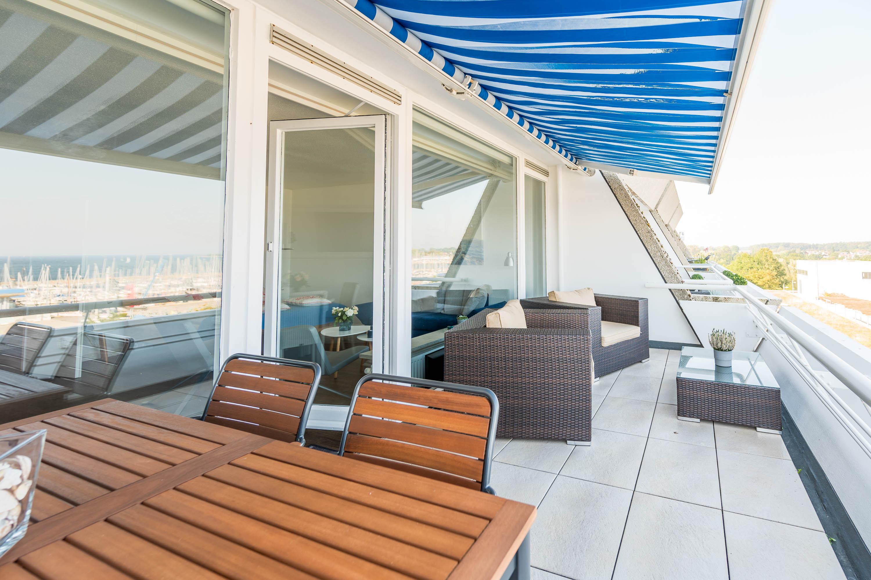 Die Unterkunft lässt sich durch Rollos abdunkeln. Mit ein paar Handgriffen lässt sich die Couch in ein Schlafsofa mit der Liegefläche von 135x200cm umbauen. Hier kann eine Person zusätzlich übernachten. Der 12qm² große Balkon verfügt über einen robusten Gartentisch sowie vier Stühle und zwei Loungesesseln. Von hier lässt sich wunderbar der Hafen und das Treiben auf der Ostsee beobachten. Vor der Morgen- und Mittagssonne schützt eine ausfahrbare Markise.
