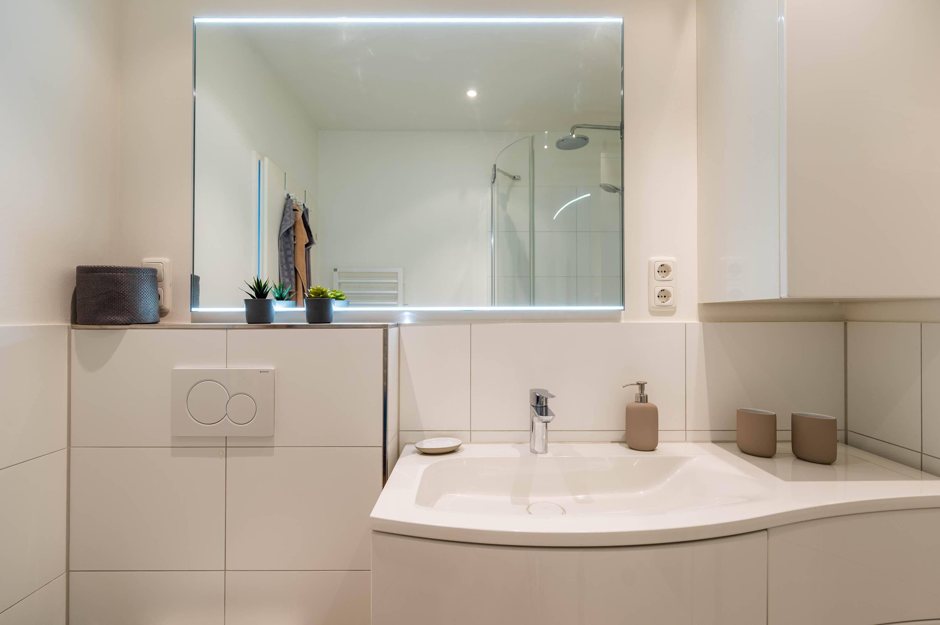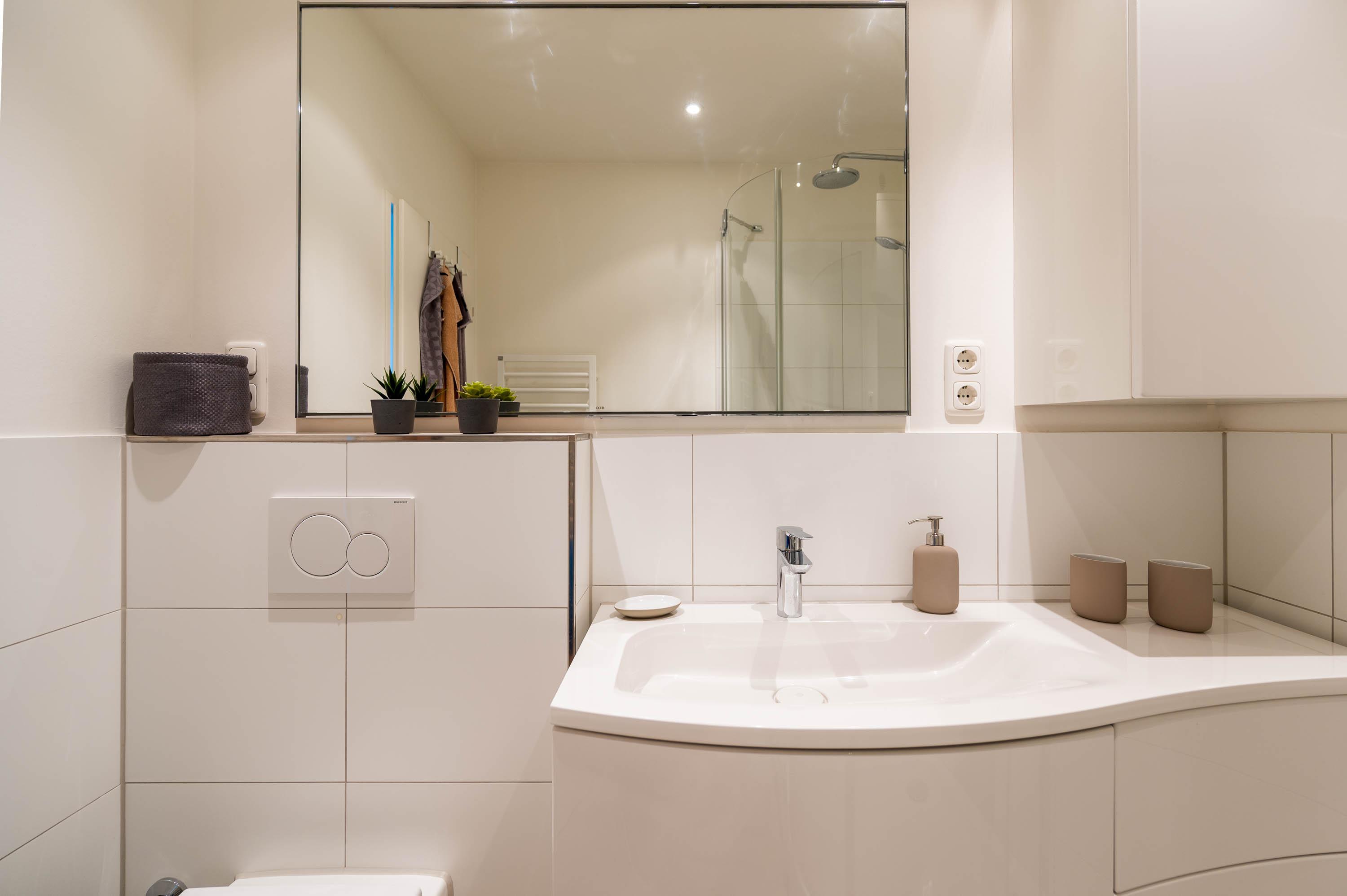 Am Eingangsbereich befindet sich eine kleine Abstellkammer, eine Garderobe und ein großer Kleiderschrank sowie das moderne Badezimmer mit Dusche, WC und genügend Stauraum. Abseits des Badezimmers wurde in der gesamten Ferienunterkunft ein Design Fußboden verlegt, der dem Apartment eine gemütliche Atmosphäre verleiht.