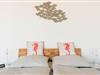 Ein runder Holztisch mit Rattan Stühlen stehen für gemütliche Abende für Sie zur Verfügung. Nebenan befindet sich der offene Küchenbereich. Die Küche ist vollwertig mit einem Kühlschrank mit Gefrierfach, Ceran-Kochfeld, Backofen, Wasserkocher, Toaster, einer[nbsp] Kaffeemaschine und Waschmaschine ausgestattet. Das Doppelbett hat eine Maße von 160x200cm.