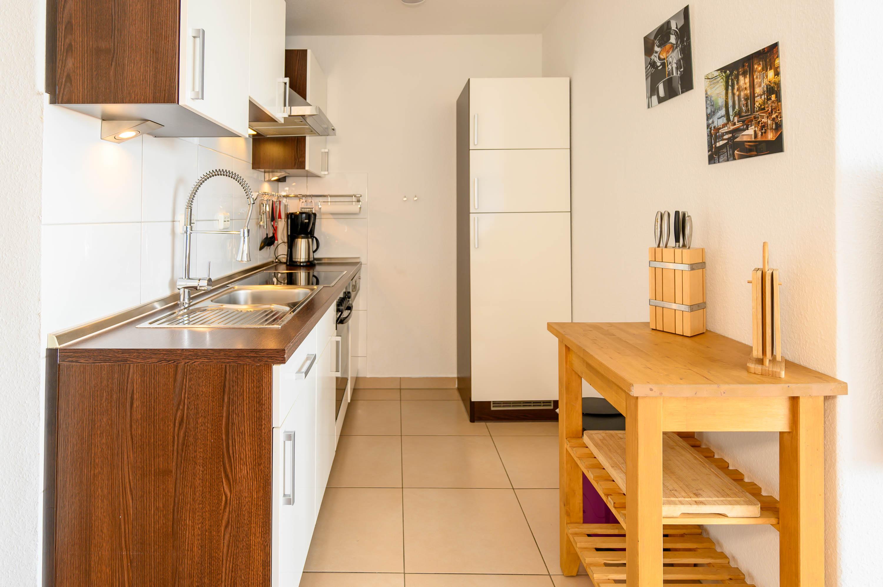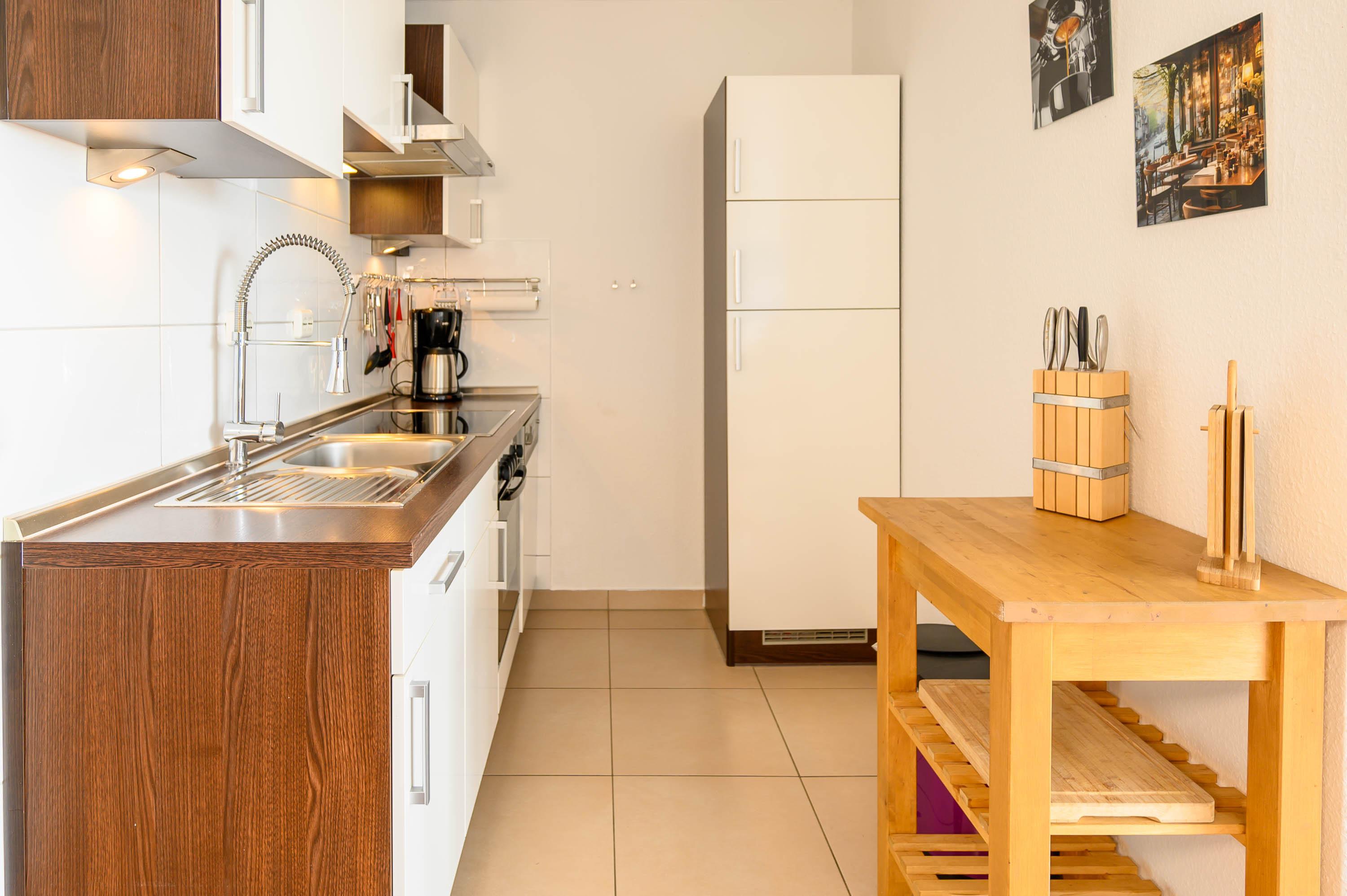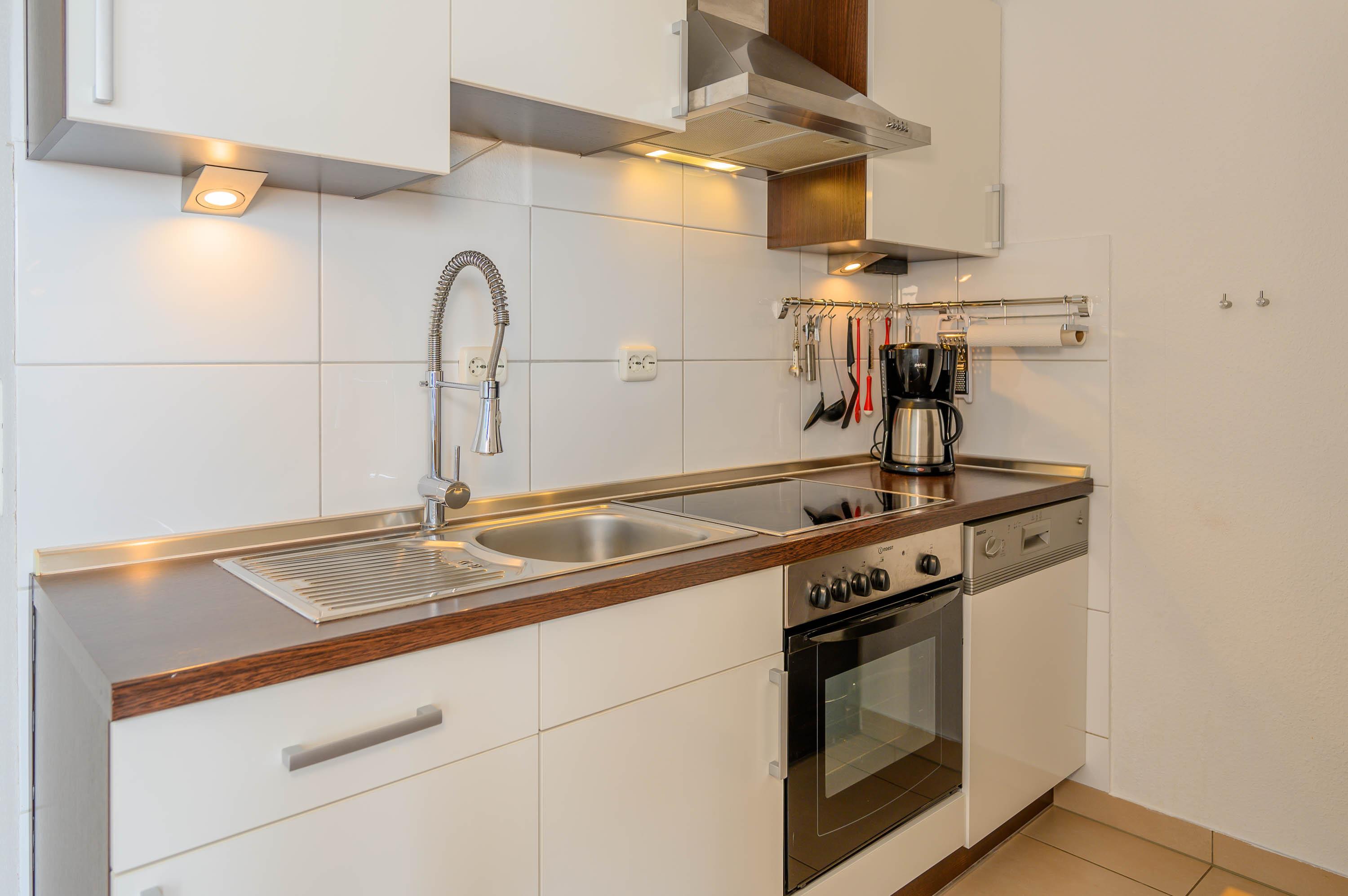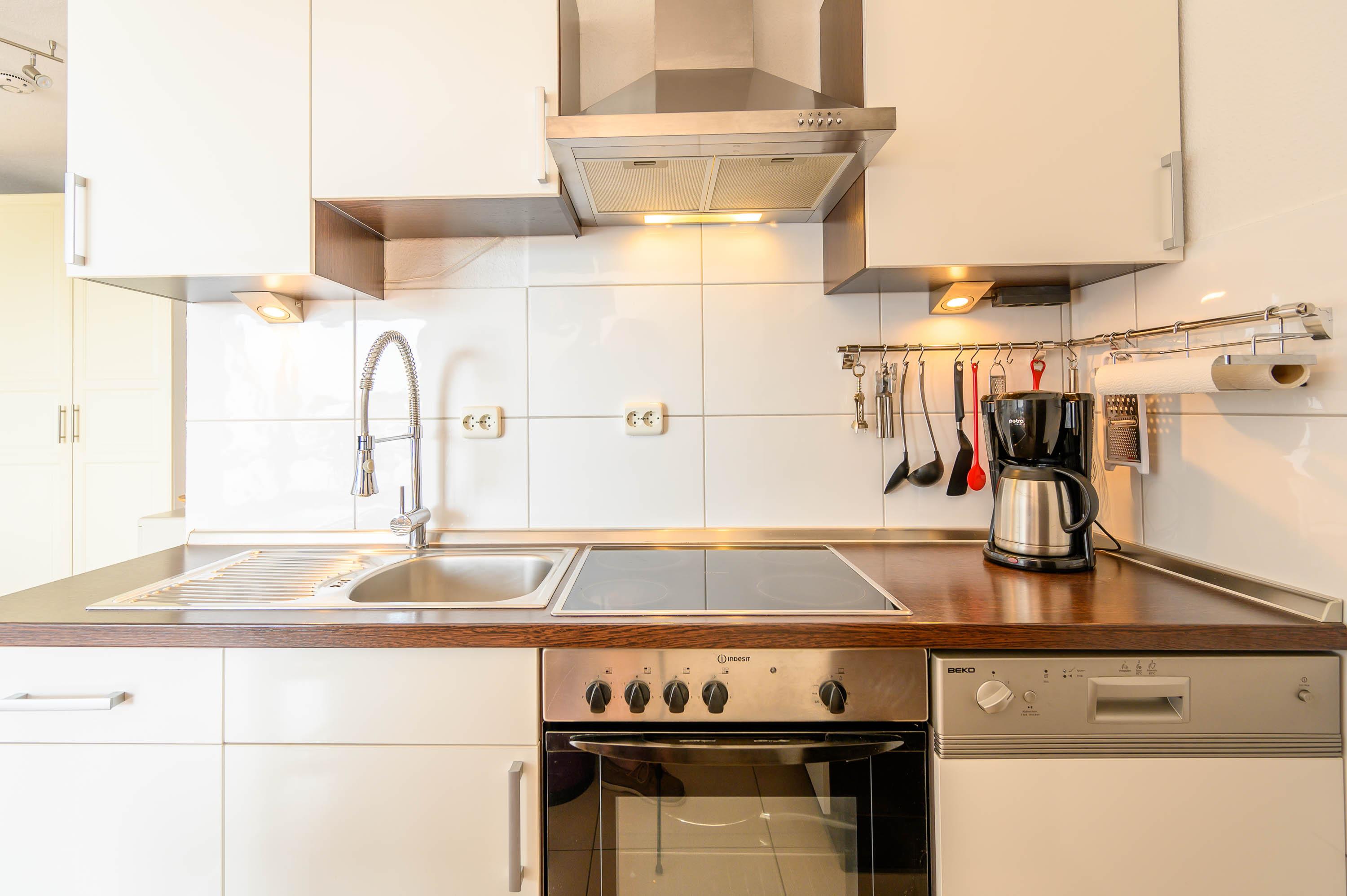 Die geschmackvolle Küche ist komplett eingerichtet, und hat alles, was man zum Kochen braucht: Es befindet sich ein großer Kühlschrank mit separatem Gefrierfach, sowie eine Geschirrspülmaschine und ein Ceranherd mit Backofen. Gläser und Porzellan sind für 6 Personen vorhanden.