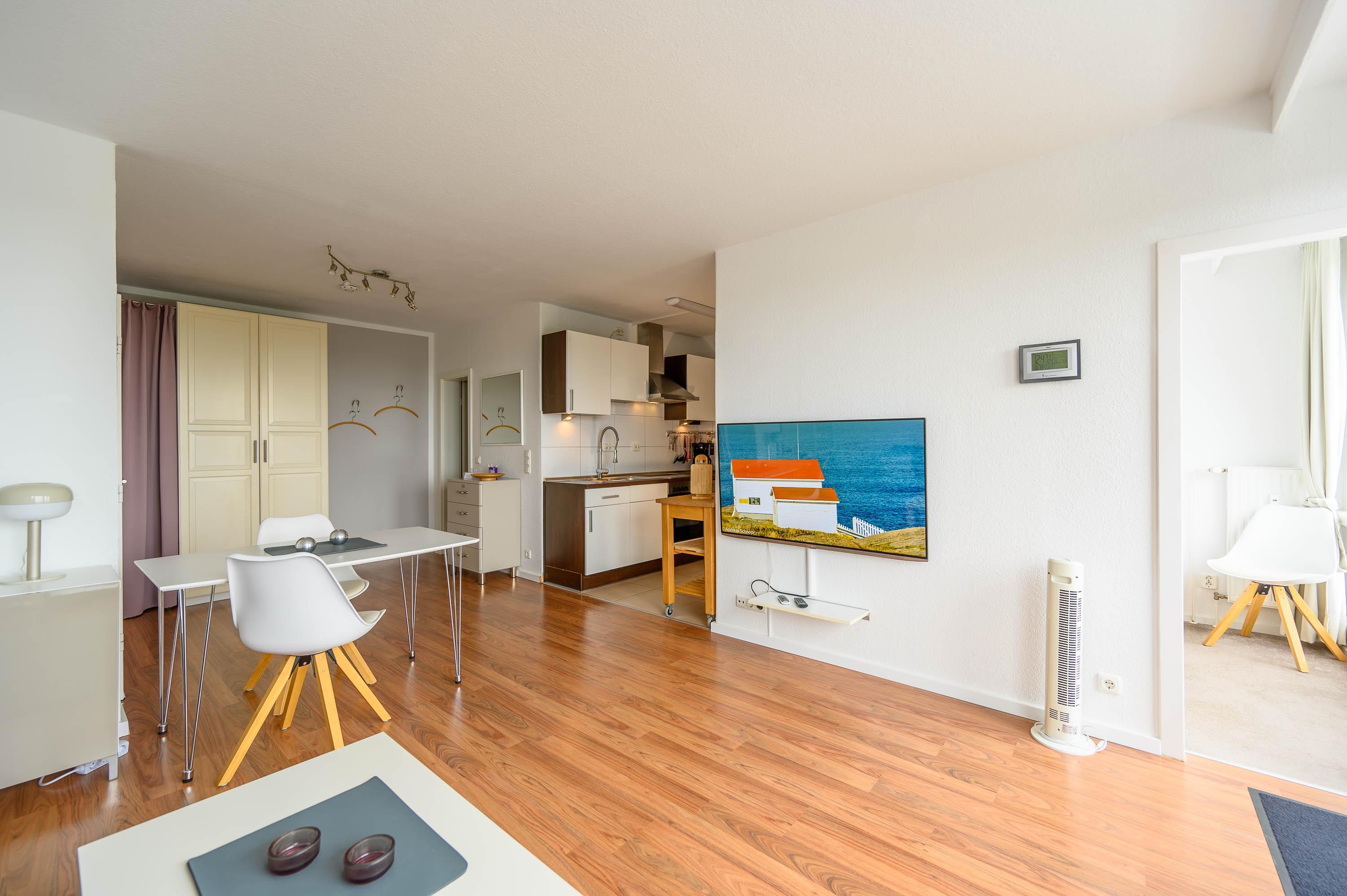Die bodentiefe Fensterfront des kombinierten Wohn-, und Essbereiches lässt einen auf den 9qm großen Balkon blicken. Er ist mit Hochlehner-Stühlen, einem Tisch und einer Markise ausgestattet. Die freie Aussicht zu den Salzwiesen ist ruhig und Sie können den ganzen Tag die Sonne in vollen Zügen genießen (Süd-West-Lage).