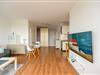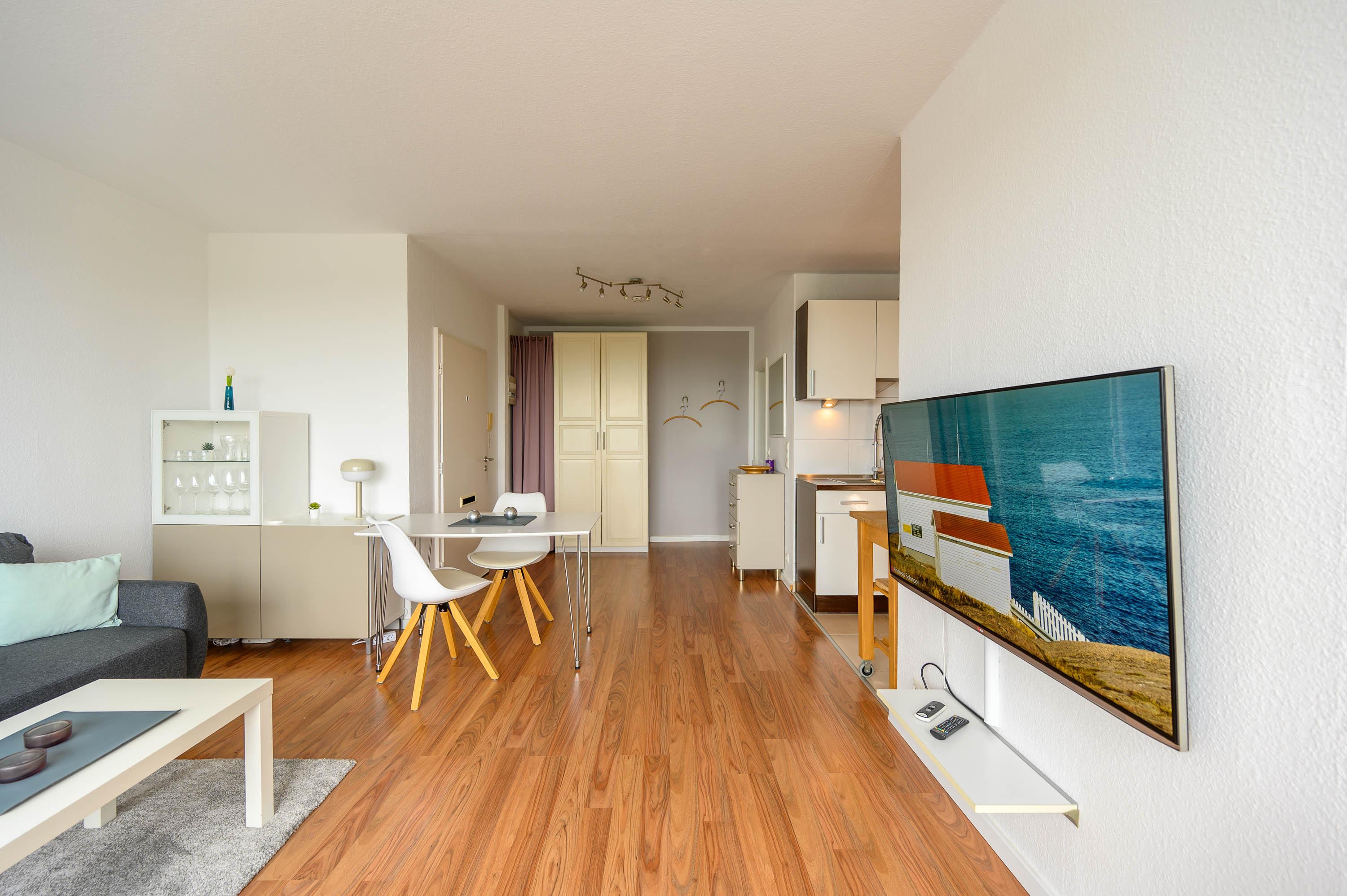 In der 3. Etage (kein Fahrstuhl) in dem terrassenförmig angelegtem Olympiazentrum liegt diese Ferienwohnung mit 1,5 Zimmern. Auf 46qm bietet sie Platz für bis zu drei Personen. Der lichtdurchflutete Wohn-, und Essbereich ist hell und modern eingerichtet. Neben einem Tisch mit Stühlen befindet sich in dem mit Laminat ausgelegtem Bereich auch eine gemütliche Couch. Das Sofa lässt sich mit wenigen Handgriffen in eine bequeme Schlafcouch (Liegefläche von 160x200 cm) umwandeln und bietet Platz für bis zu 3. Personen. Bei Bedarf lässt sich das Appartment natürlich mit Gardinen abdunkeln. Neben einem 40 Zoll Flachbild-Fernseher und einer Stereoanlage, steht Ihnen kostenlos WLAN zur Verfügung. Ein Kleiderschrank sorgt für genügend Verstaumöglichkeiten.