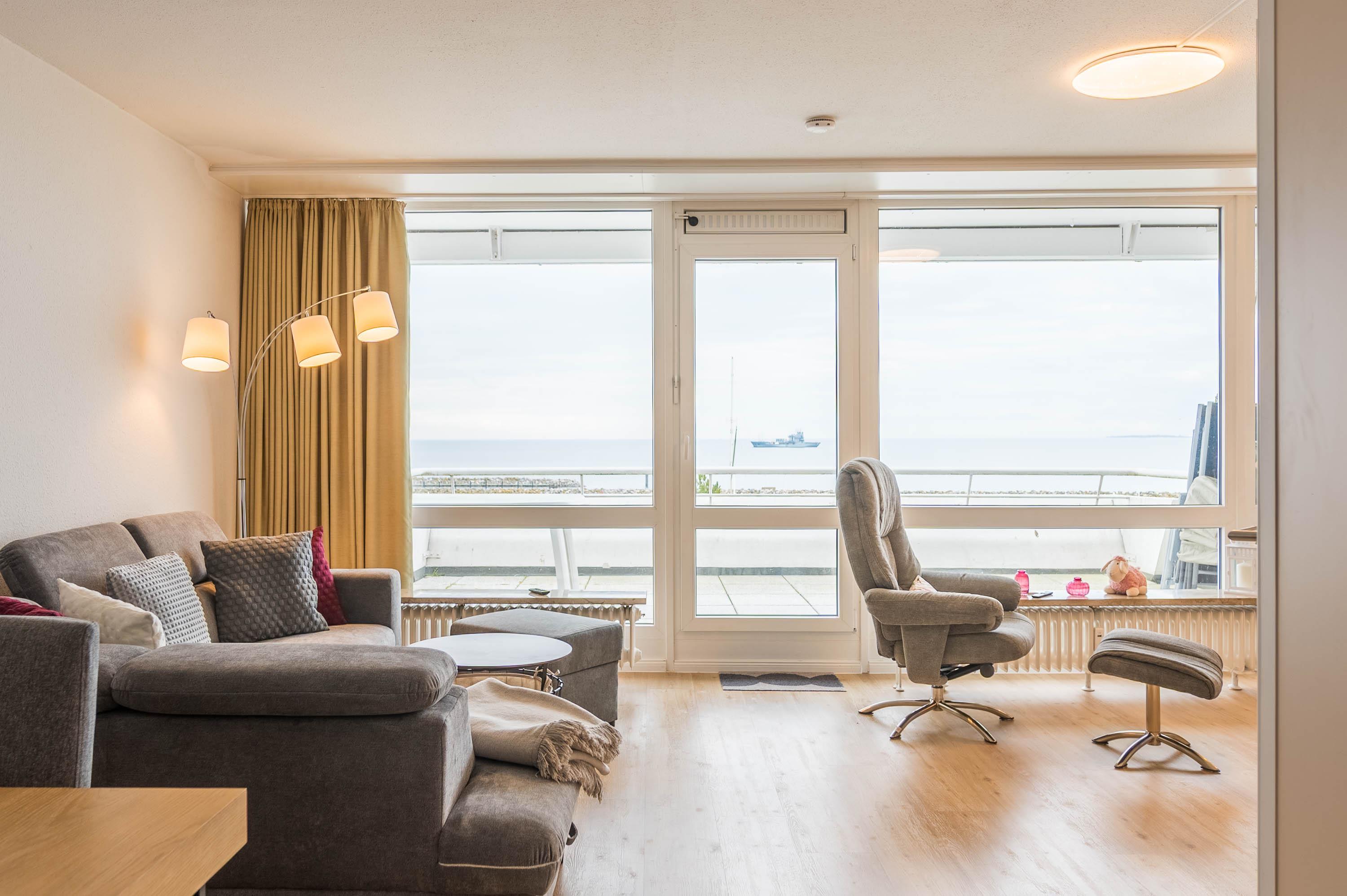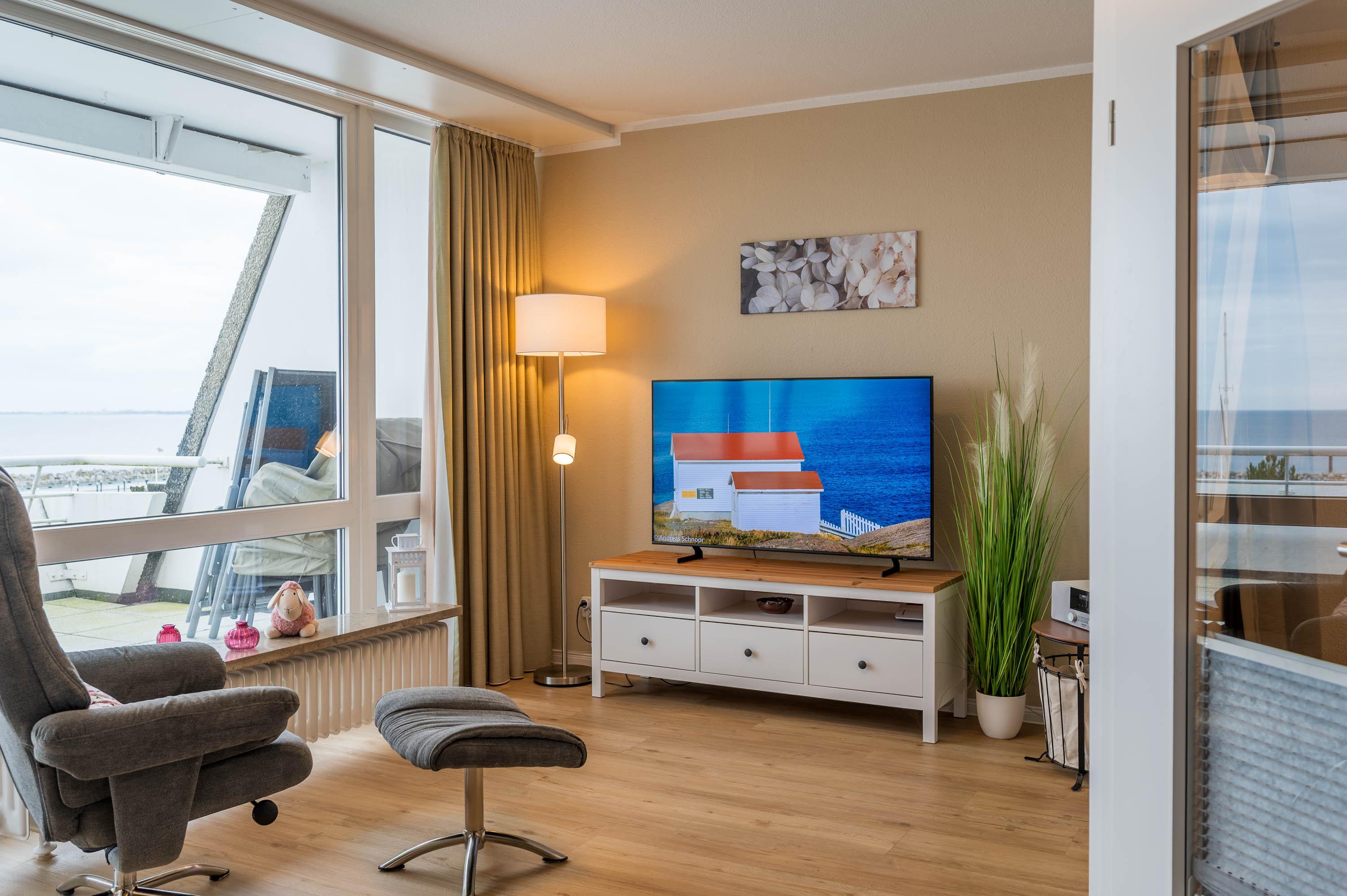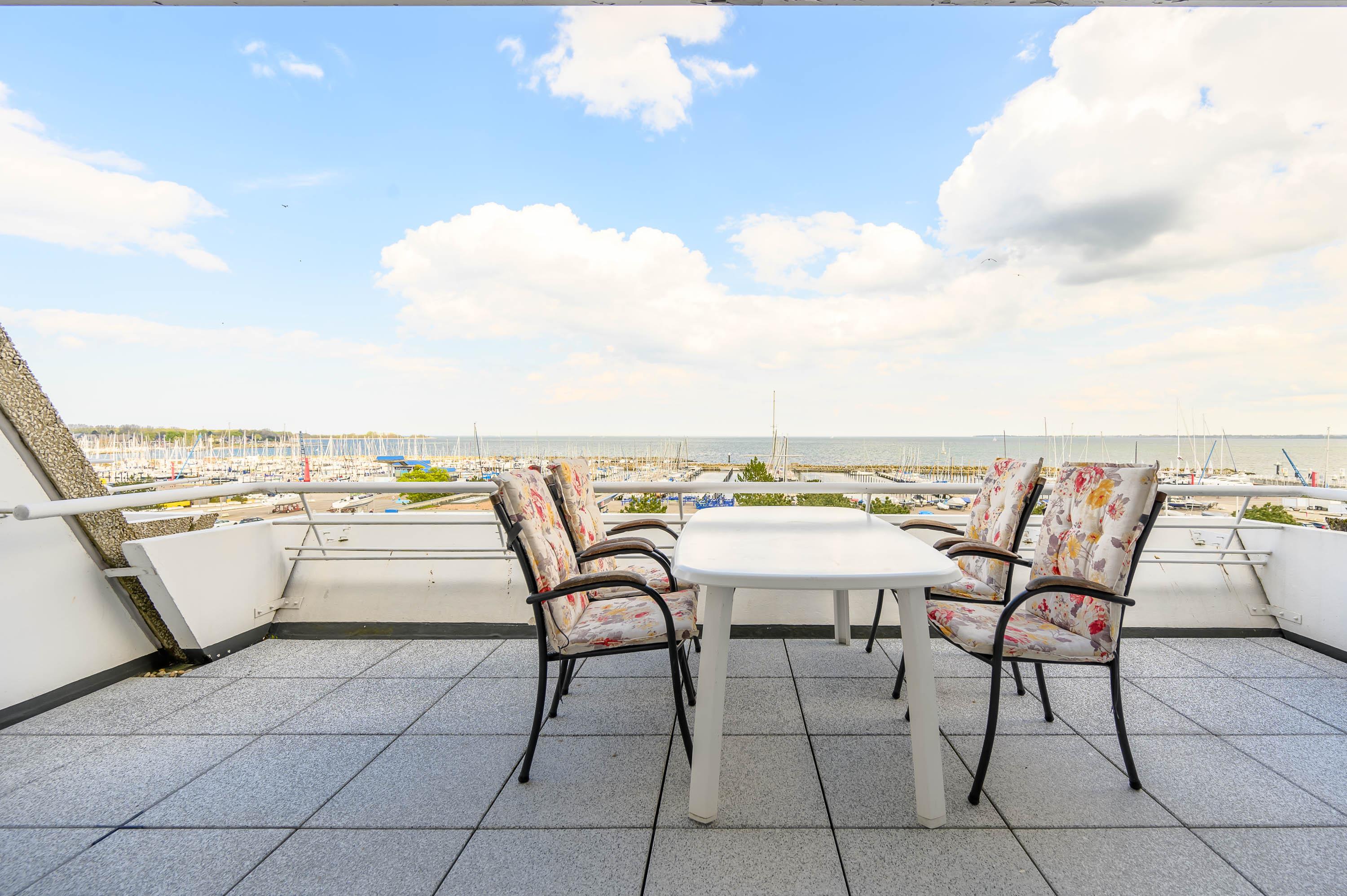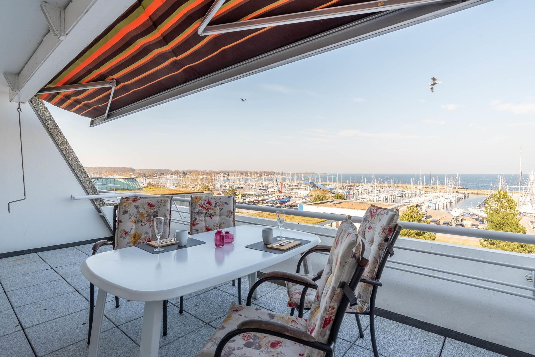 Reinkommen, staunen und sich wohlfühlen lautet hier das Motto für Ihren Urlaub. Das 1,5-Zimmerappartement ist hell und freundlich im maritimen Stil ausgestattet und besticht durch den traumhaften Blick auf die Ostsee, den Segelhafen, den Strand und Schiffe, Schiffe, Schiffe. Es ist immer was los und zu bestaunen und zu gucken - sehen und erleben Sie es selbst. Ein bequemes Sofa lädt zu gemütlichen Abenden ein und lässt sich mit wenigen Handgriffen zur Schlafgelegenheit für eine 3. Person umbauen. Im Schlafzimmer befindet sich das Doppelbett (180 x 200). Die Einbauküche Herd, Backofen, Geschirrspüler und Kühlschrank lädt zu gemeinsamen Kochaktionen mit Meeresblick ein. Ein Esstisch mit 4 Stühlen, ein Sessel mit Fußhocker, ein Sideboard und mit einem 60 Zoll TV vervollständigen das runde Gesamtbild der Wohnung. Im Flur befinden sich ein Einbauschrank und das neue und moderne Badezimmer ist mit Dusche, Waschbecken, WC und einer Waschmaschine ausgestattet. Der große Balkon lädt - ausgestattet mit Markise, Stühlen und einem Tisch - zum gemütlichen Frühstück bei romantischen Sonnenaufgang ein - lassen Sie sich zu jeder Zeit verzaubern und die Seele baumeln beim Panoramablick auf die Ostsee.