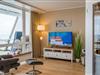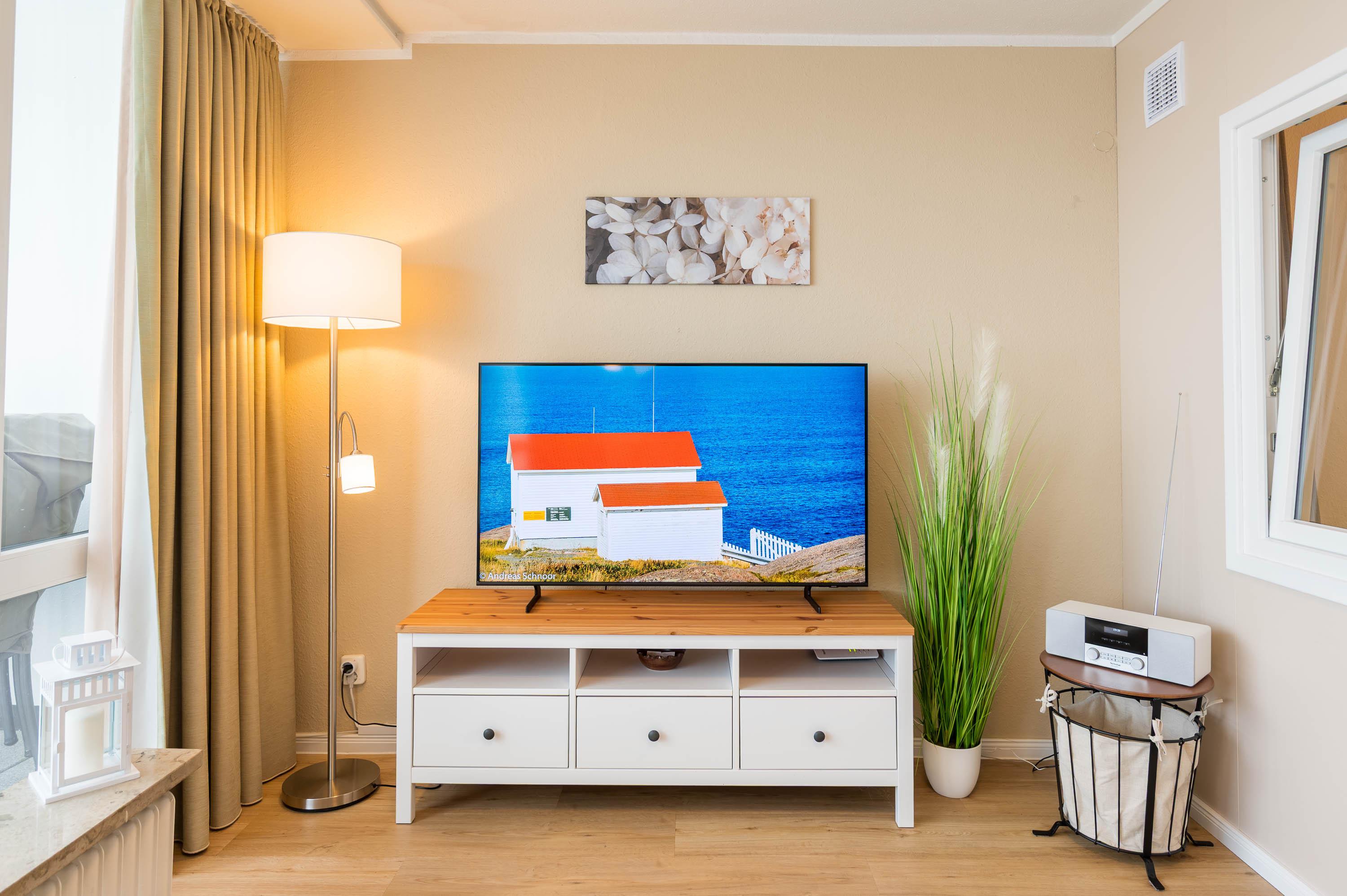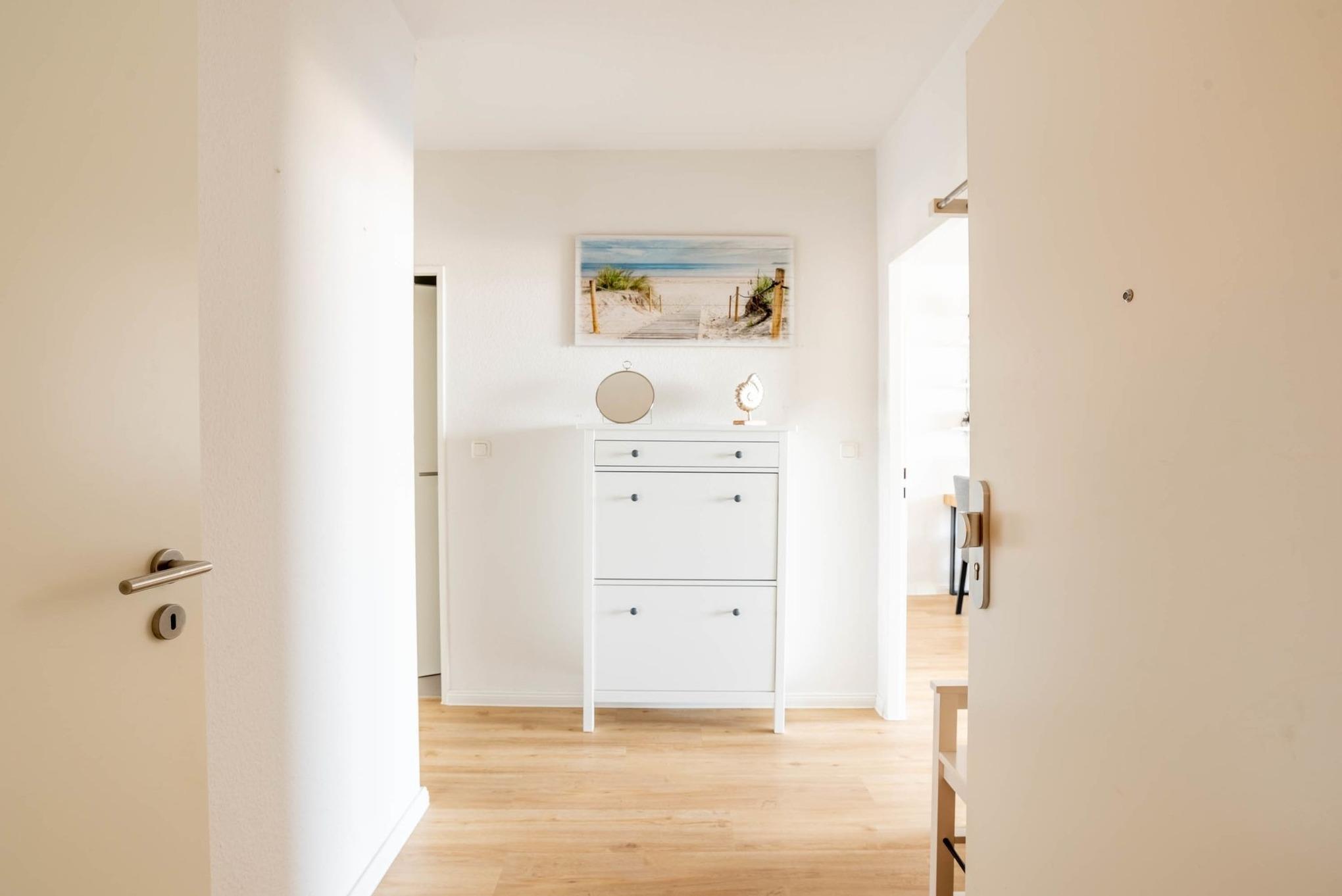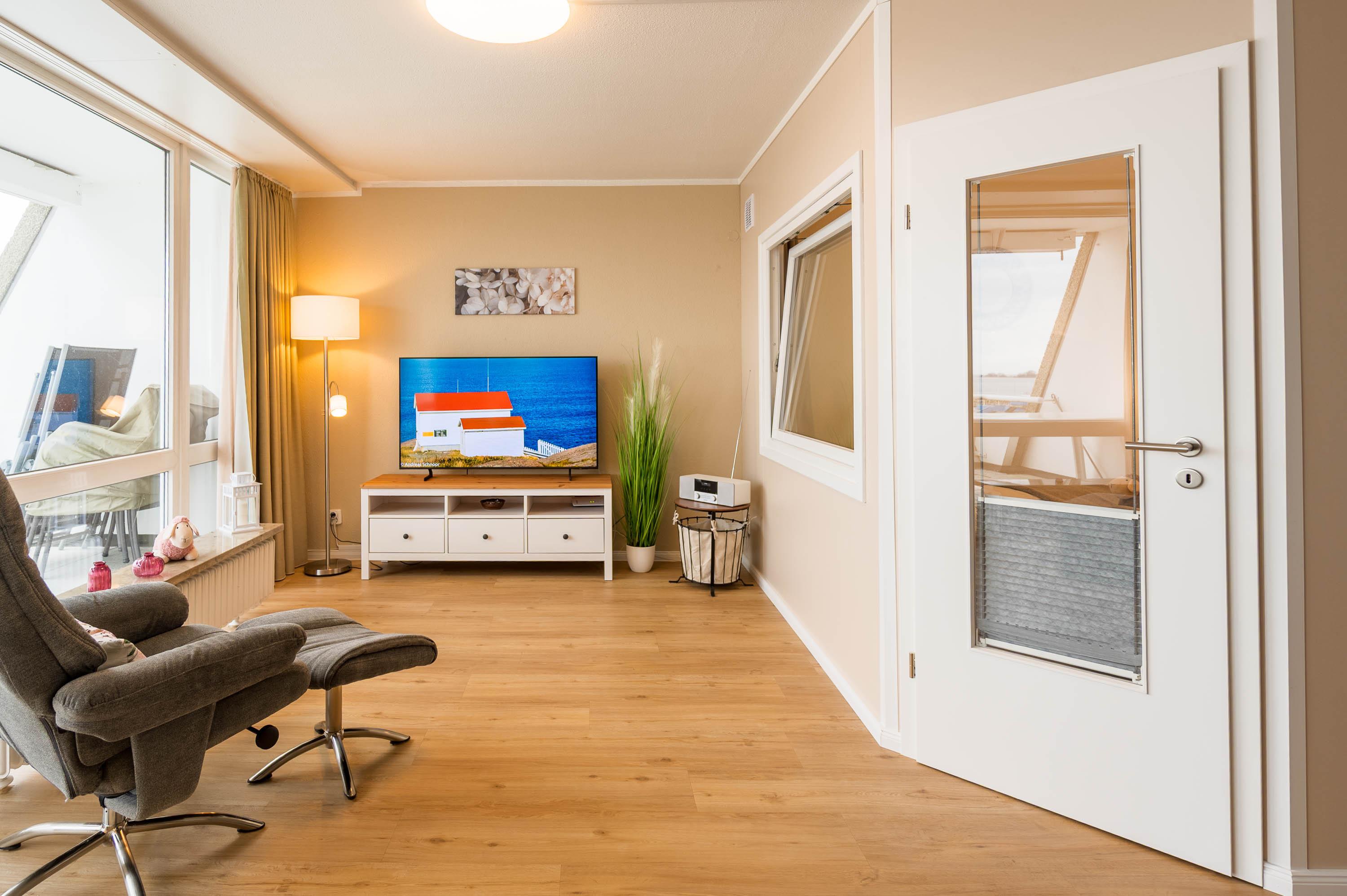Reinkommen, staunen und sich wohlfühlen lautet hier das Motto für Ihren Urlaub. Das 1,5-Zimmerappartement ist hell und freundlich im maritimen Stil ausgestattet und besticht durch den traumhaften Blick auf die Ostsee, den Segelhafen, den Strand und Schiffe, Schiffe, Schiffe. Es ist immer was los und zu bestaunen und zu gucken - sehen und erleben Sie es selbst. Ein bequemes Sofa lädt zu gemütlichen Abenden ein und lässt sich mit wenigen Handgriffen zur Schlafgelegenheit für eine 3. Person umbauen. Im Schlafzimmer befindet sich das Doppelbett (180 x 200). Die Einbauküche Herd, Backofen, Geschirrspüler und Kühlschrank lädt zu gemeinsamen Kochaktionen mit Meeresblick ein. Ein Esstisch mit 4 Stühlen, ein Sessel mit Fußhocker, ein Sideboard und mit einem 60 Zoll TV vervollständigen das runde Gesamtbild der Wohnung. Im Flur befinden sich ein Einbauschrank und das neue und moderne Badezimmer ist mit Dusche, Waschbecken, WC und einer Waschmaschine ausgestattet. Der große Balkon lädt - ausgestattet mit Markise, Stühlen und einem Tisch - zum gemütlichen Frühstück bei romantischen Sonnenaufgang ein - lassen Sie sich zu jeder Zeit verzaubern und die Seele baumeln beim Panoramablick auf die Ostsee.