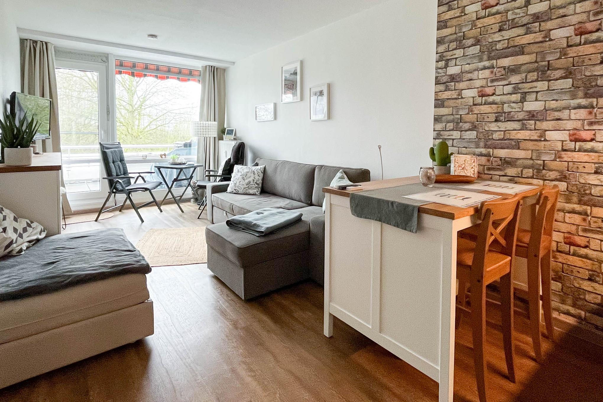Die 1 Zimmer-Wohnung ist freundlich eingerichtet und lässt sich bei Bedarf mit Gardinen abdunkeln. Zum Übernachten steht Ihnen eine hochwertige Schlafcouch (Liegefläche von 160x 200 cm) zur Verfügung. Die Couch lässt sich mit wenigen Handgriffen wieder in ein schickes Sofa umbauen und bietet somit Platz für ein gemütliches Beisammensein. Ein Flatscreen-Fernseher ist in diesem Apartment vorhanden.