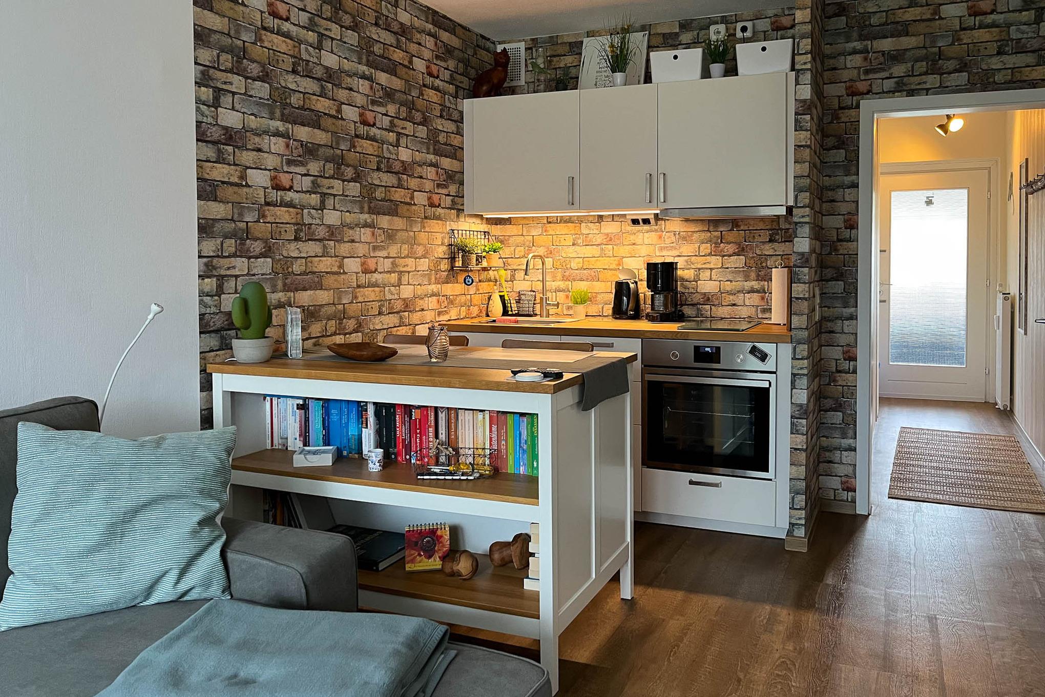 Die offene Küche ist mit allem ausgestattet, was Sie für den täglichen Bedarf benötigen: Von der Kaffeemaschine über die Induktionskochplatten, Toaster, Kühlschrank mit Gefrierfach bis hin zum Wasserkocher und ausreichend Geschirr sollte es Ihnen an nichts fehlen. An der Küchenzeile schließt sich der Essbereich mit einem Tisch und zwei Stühlen an. Das gepflegte Badezimmer mit Dusche besticht durch einen Handtuchheizkörper und einer Dusche.
