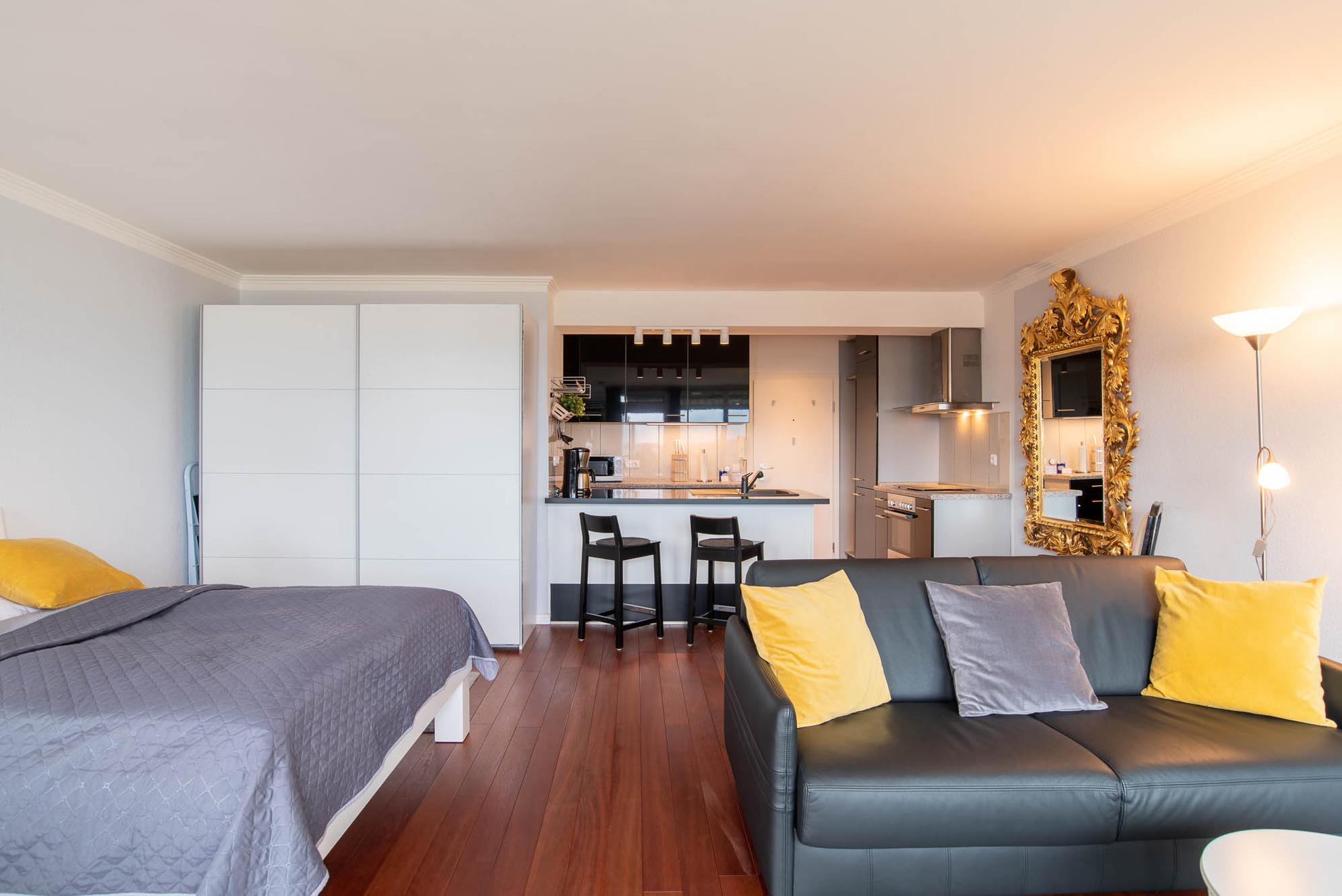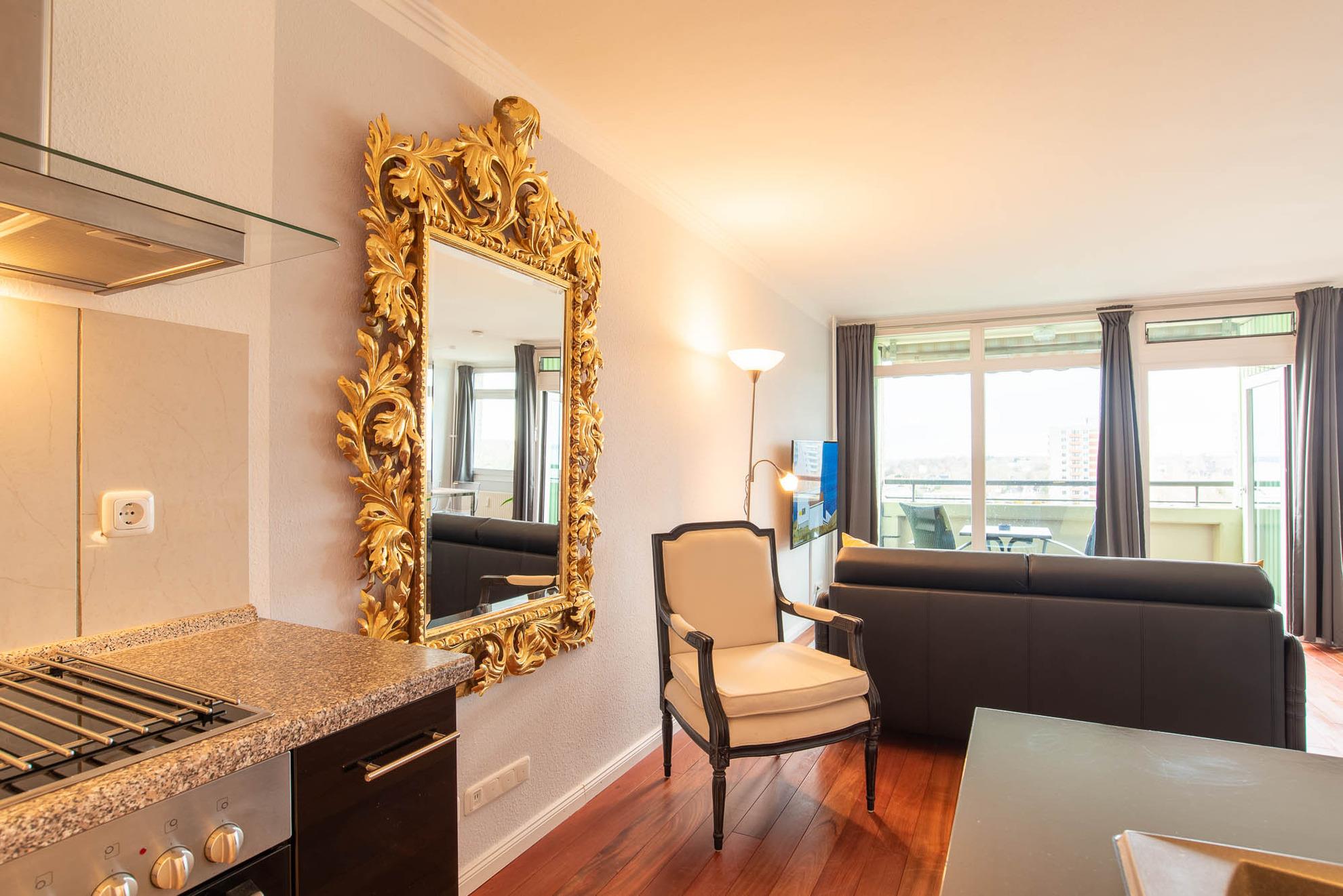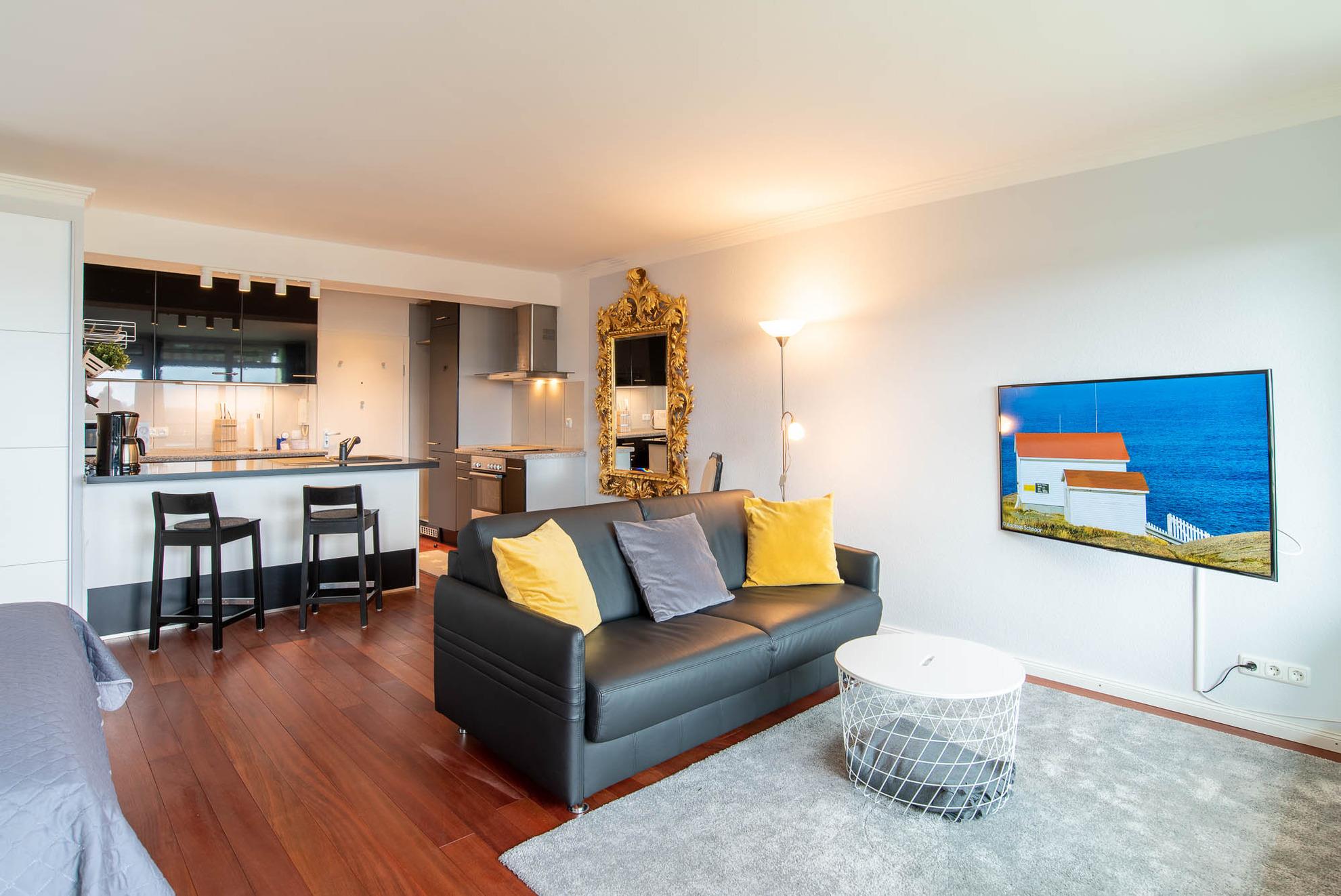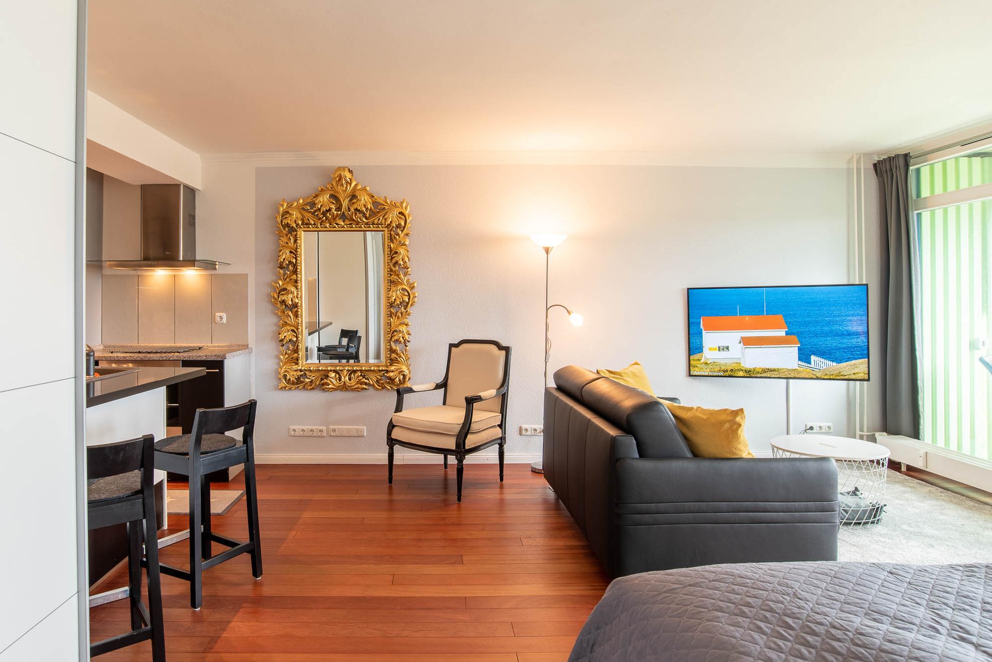 Im ganzen Appartment ist ein hochwertiger, schöner Holzfußboden verlegt worden, der sofort ins Auge sticht. Ein weiterer Eyecatcher und das Accessoire der Wohnung ist der imposante Spiegel aus Gold. Er trennt den Küchenbereich vom gemütlichen Wohnbereich. Die Wohnecke besteht aus einer bequemen Ledercouch, die sich auch zu einer Schlafmöglichkeit (140x200cm) für eine dritte Person umbauen lässt. Ein großer Flachbild-Fernseher, ein Sessel und ein Teppich runden den Bereich ab, dass er zum Wohlfühlen einlädt.