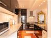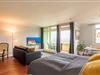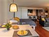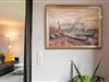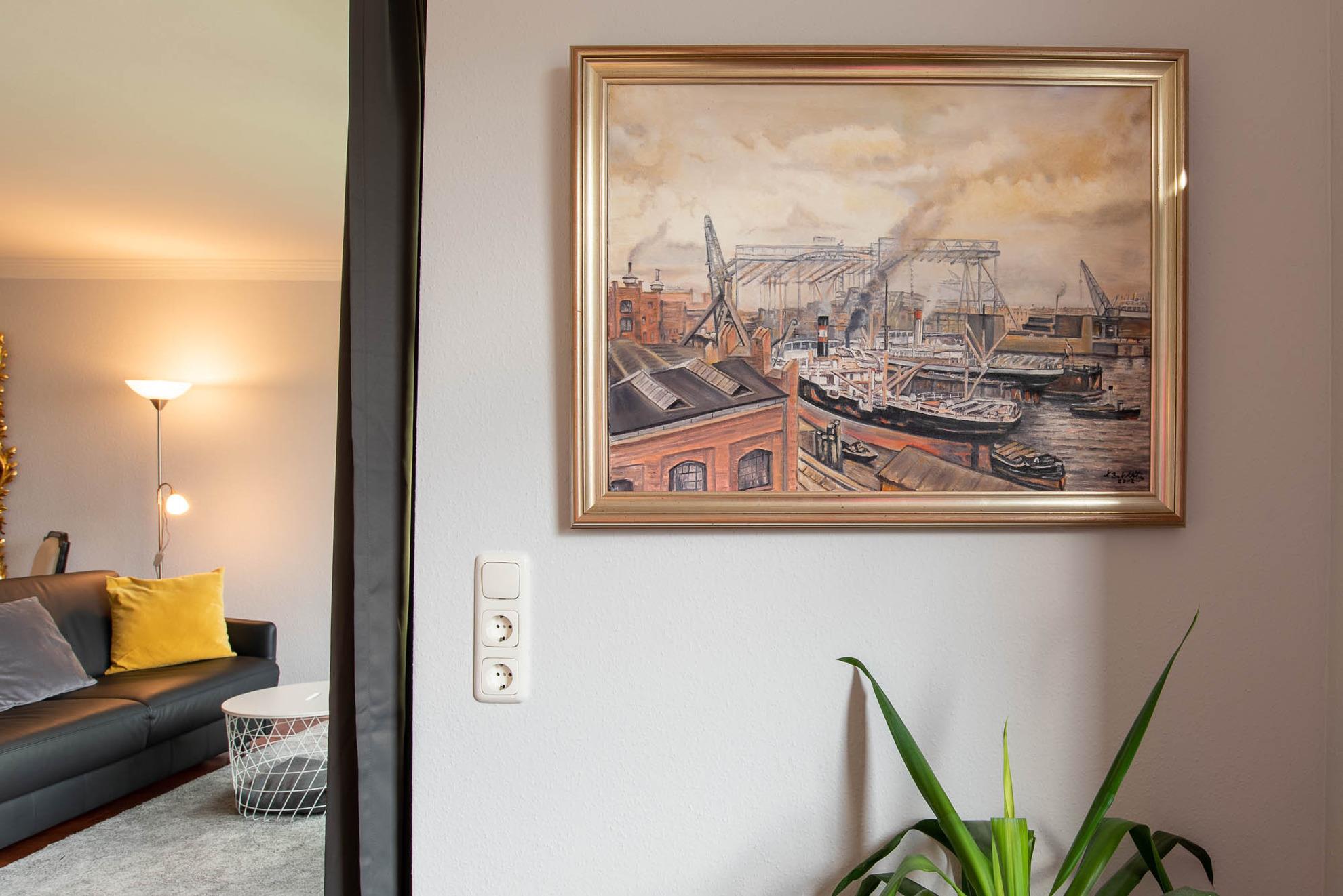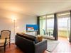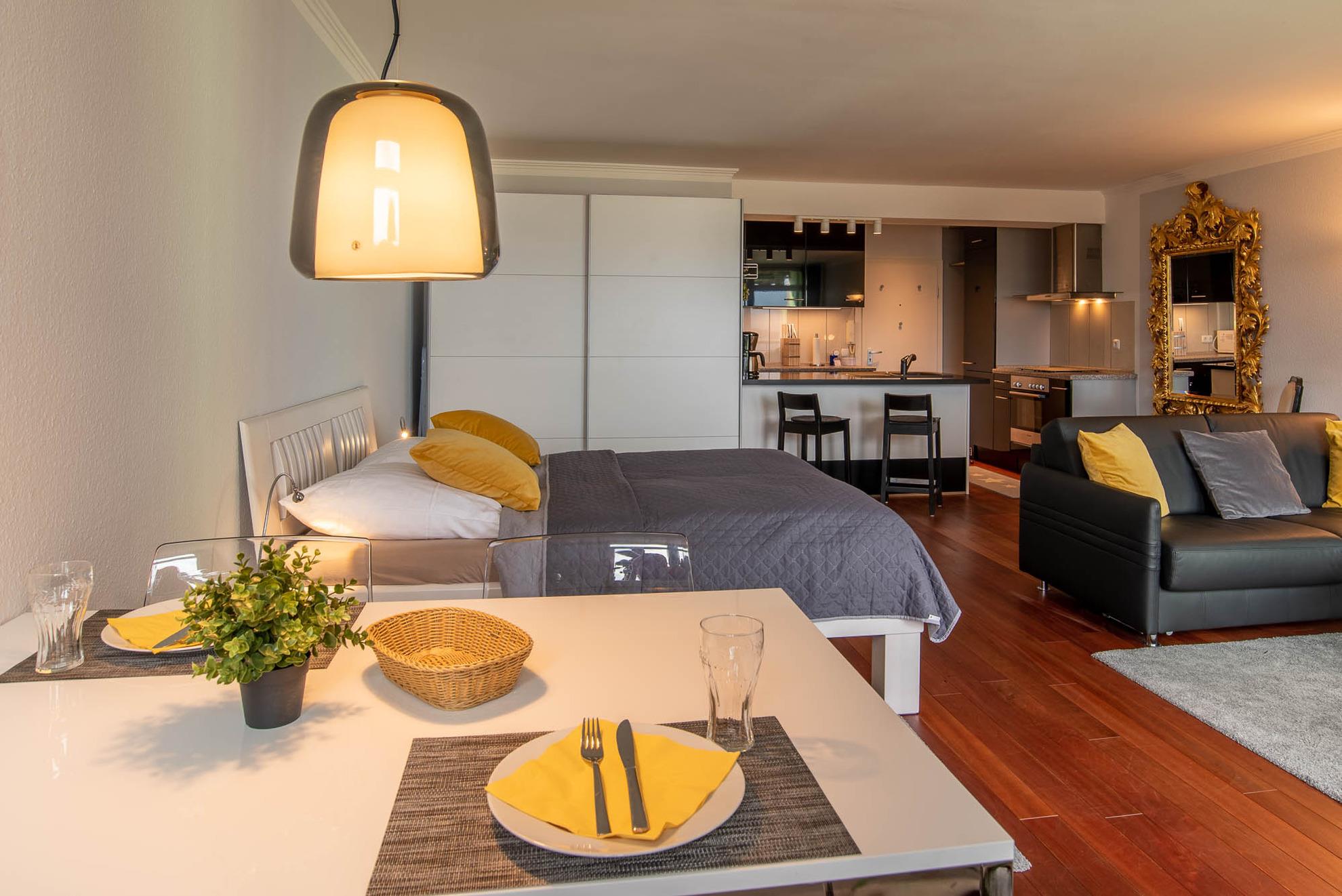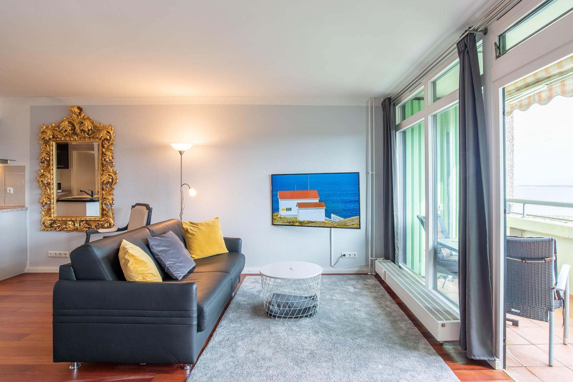 Im ganzen Appartment ist ein hochwertiger, schöner Holzfußboden verlegt worden, der sofort ins Auge sticht. Ein weiterer Eyecatcher und das Accessoire der Wohnung ist der imposante Spiegel aus Gold. Er trennt den Küchenbereich vom gemütlichen Wohnbereich. Die Wohnecke besteht aus einer bequemen Ledercouch, die sich auch zu einer Schlafmöglichkeit (140x200cm) für eine dritte Person umbauen lässt. Ein großer Flachbild-Fernseher, ein Sessel und ein Teppich runden den Bereich ab, dass er zum Wohlfühlen einlädt.