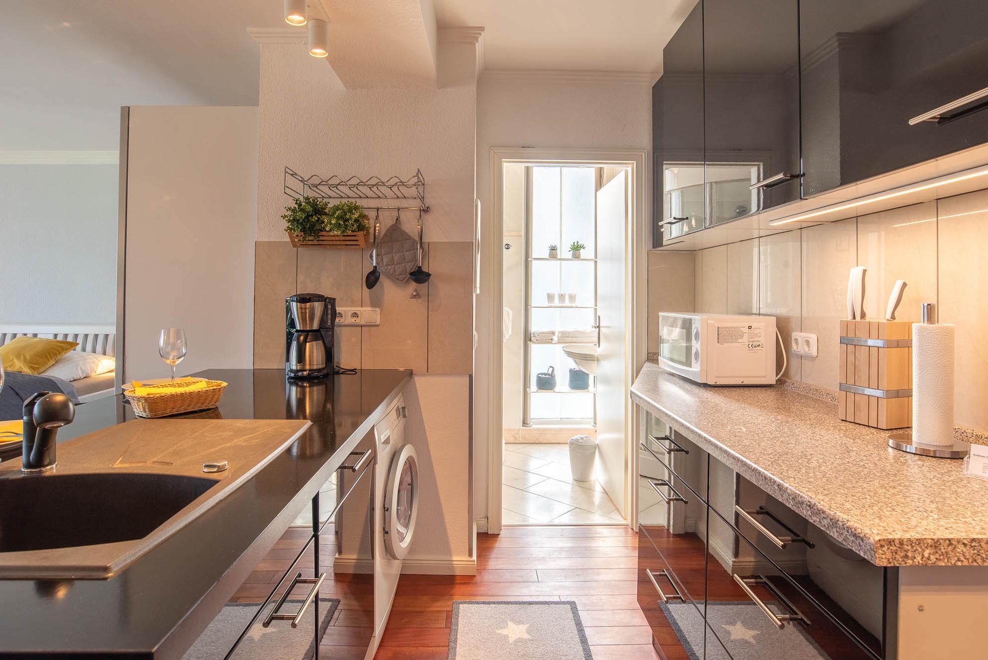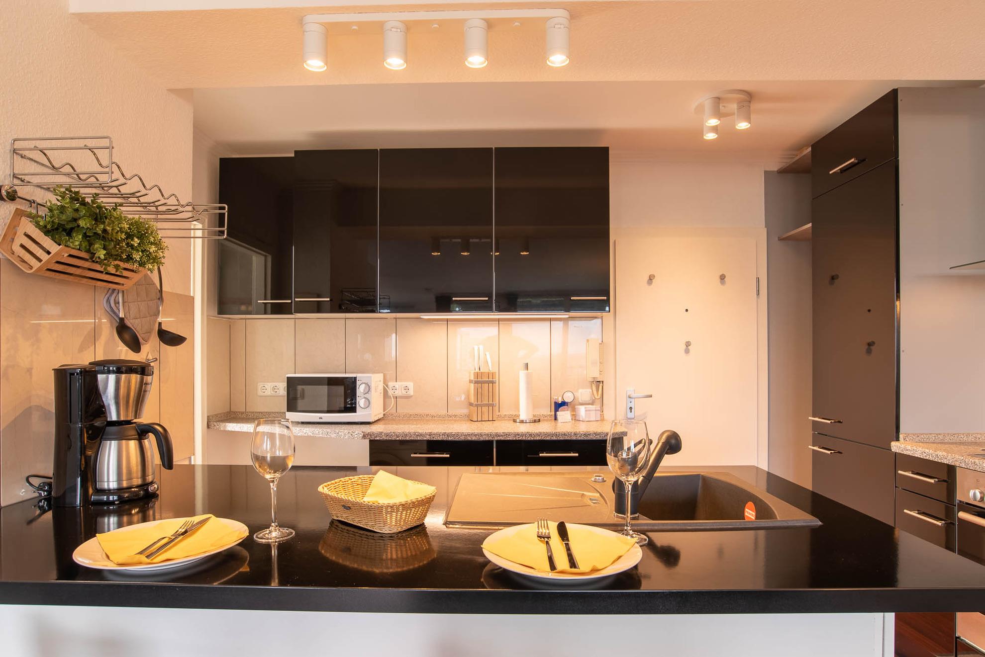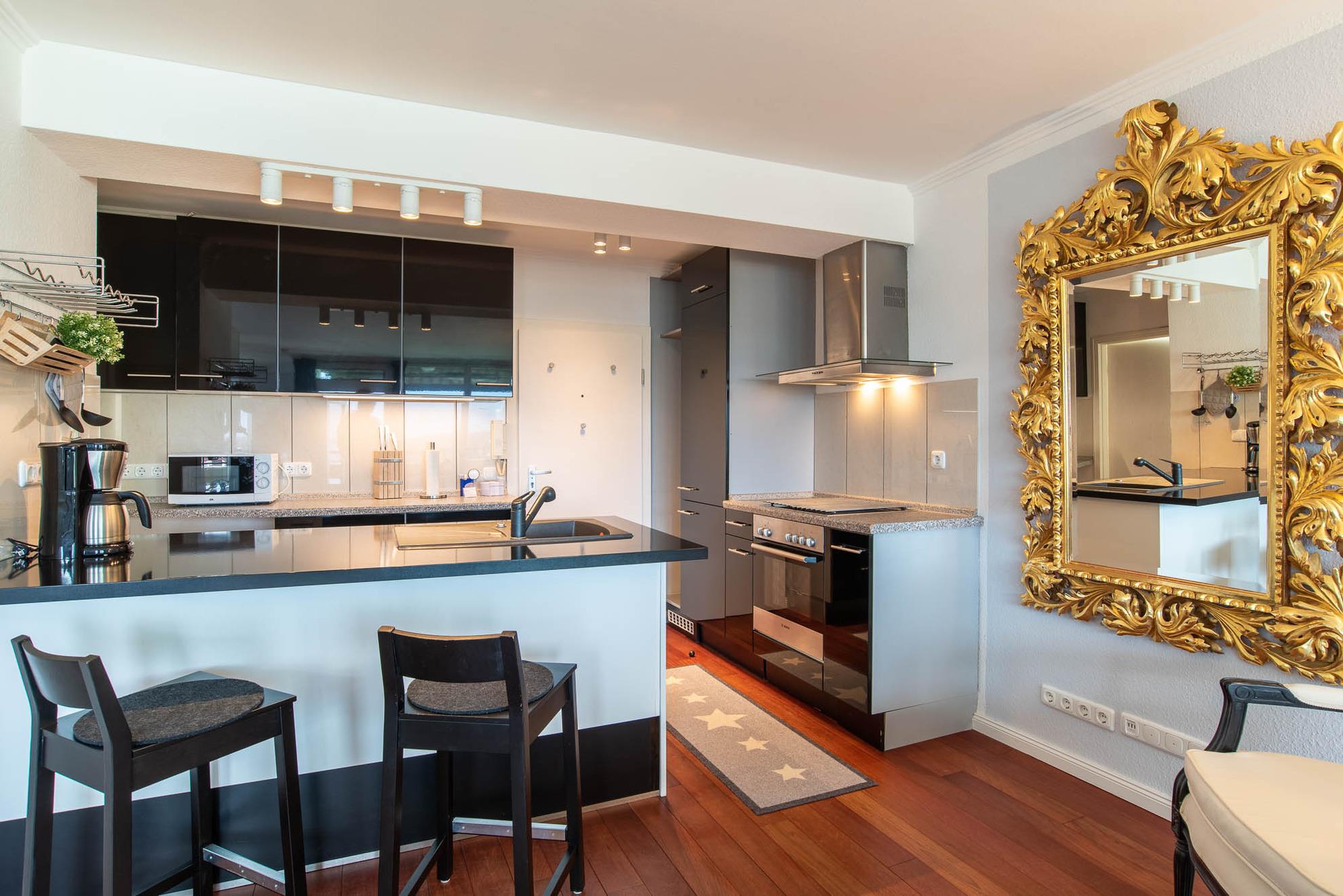 Beim Betreten dieser Wohnung erleben Sie direkt den Charme einer Loftwohnung: Im Eingangsbereich befindet sich eine moderne Hochglanzküche. Im chicen schwarz glänzt diese Küchenlandschaft nicht nur durch ihr Äußeres. Neben der funktionalen Grundausstattung, wie einem großen Kühlschrank mit Gefrierfach, einer Geschirrspülmaschine, einer Mikrowelle und einer Waschmaschine, verfügt diese geräumige, offene Küche über eine Kochinsel mit Barhockern. Hier können Sie gemütliche Kochabende in toller Atmosphäre stattfinden lassen. Aber auch ein Esstisch mit 4 Stühlen steht Ihnen zur Verfügung. Dieser befindet sich im kleinen Erker der Ferienwohnung.