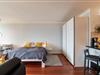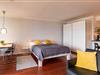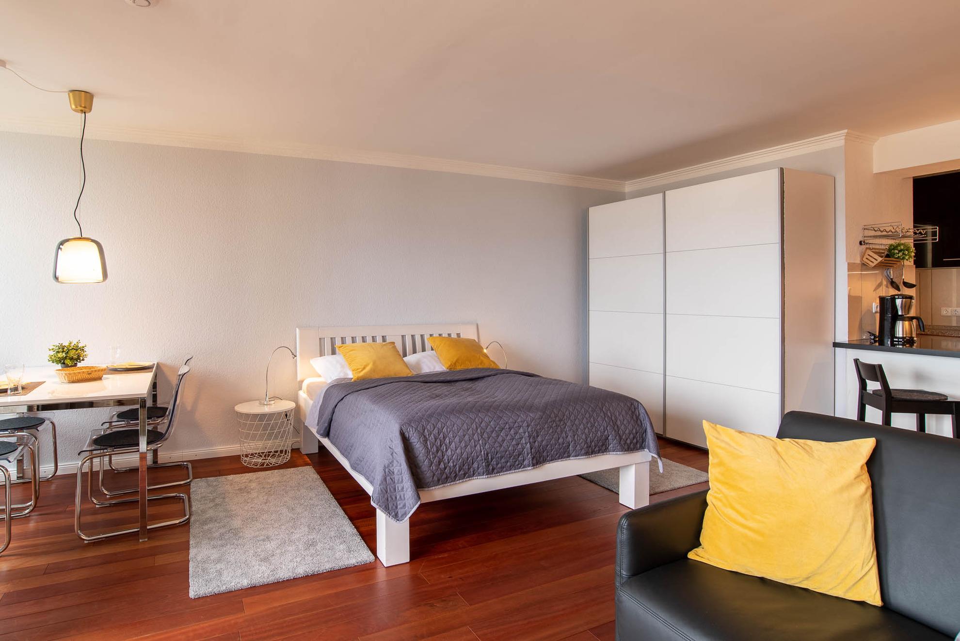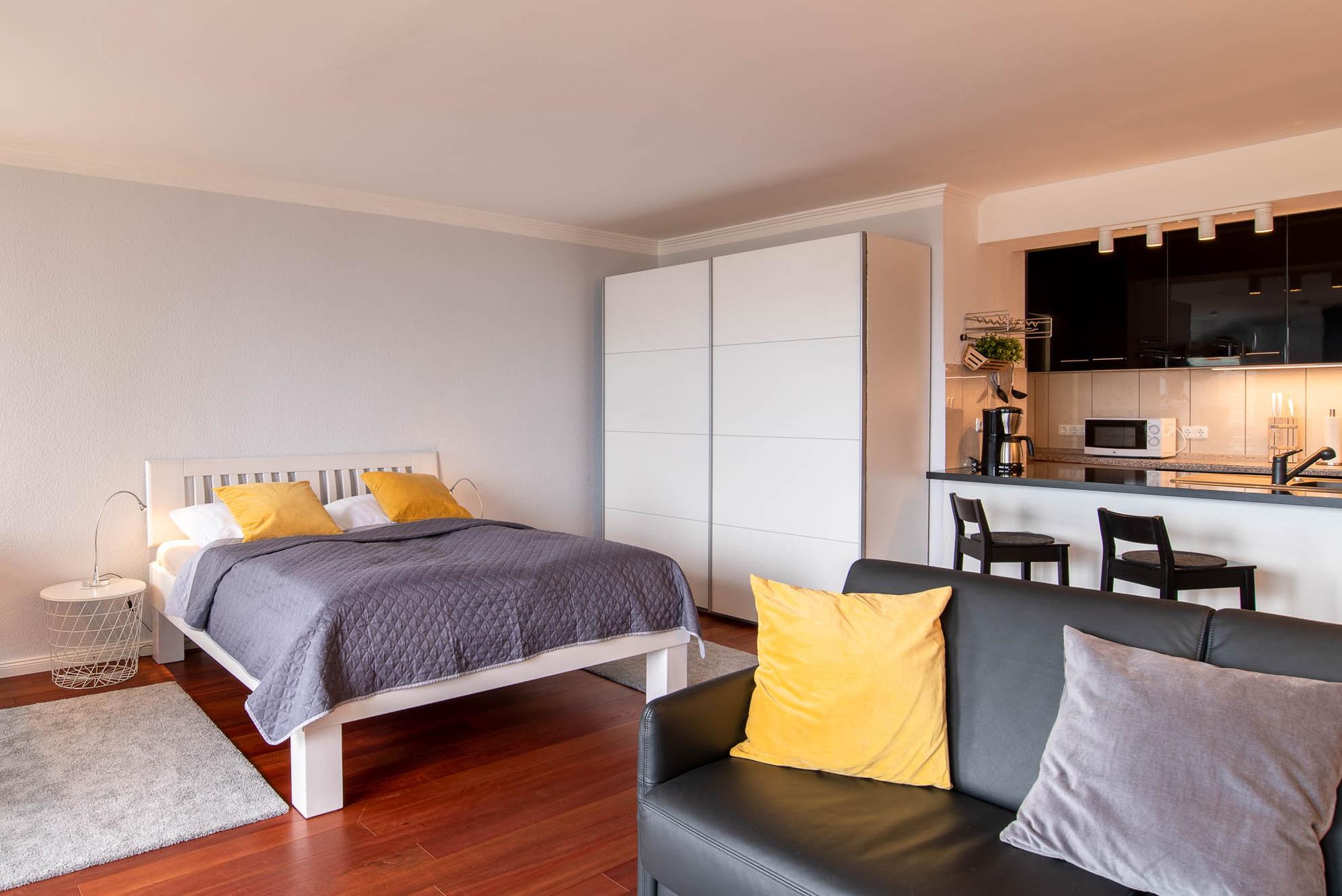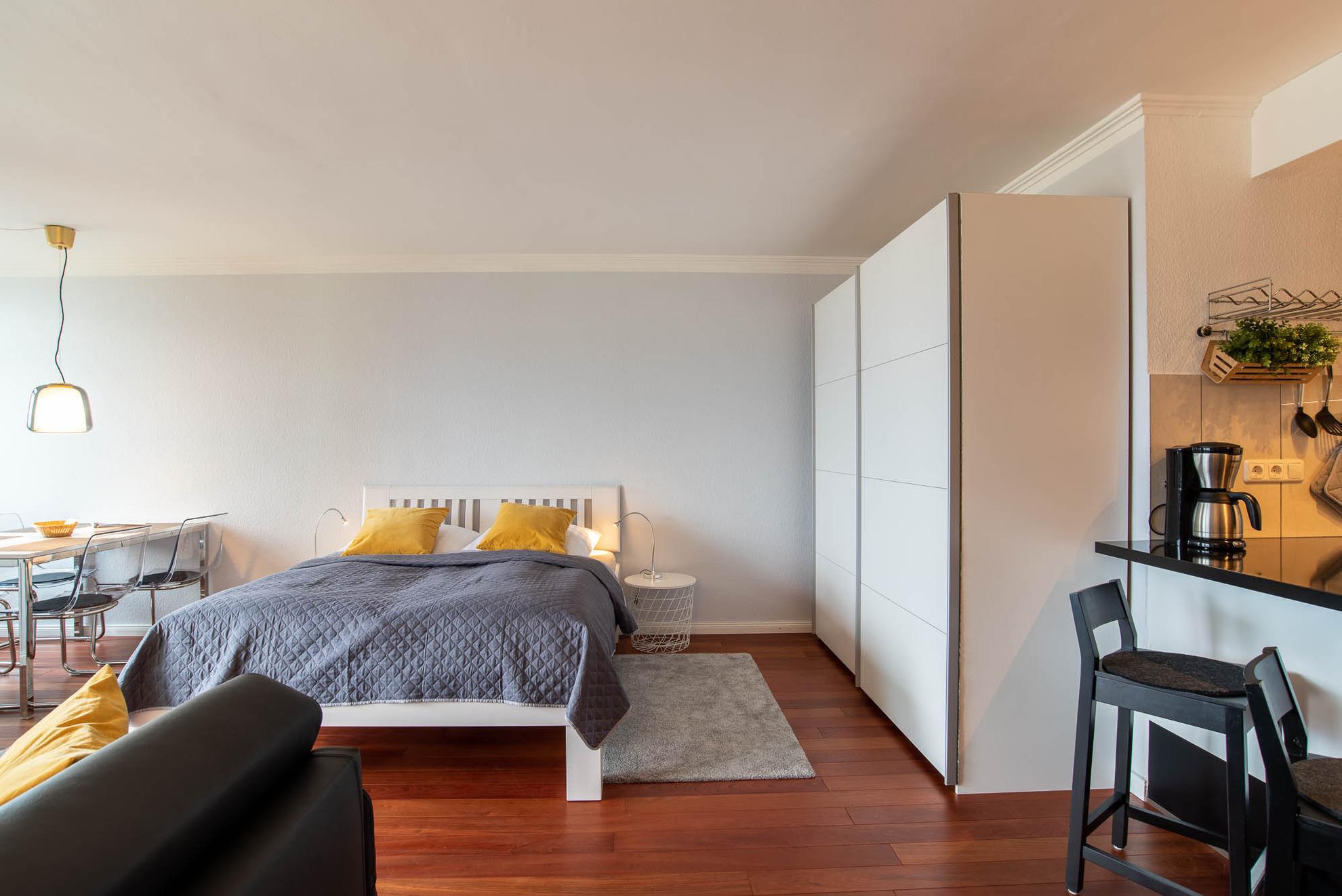Gegenüber befindet sich der Schlafbereich mit einem Bett in den Maßen von 160cm x 200cm und einem großen Kleiderschrank. Das Appartement lässt sich mit Vorhängen verdunkeln.