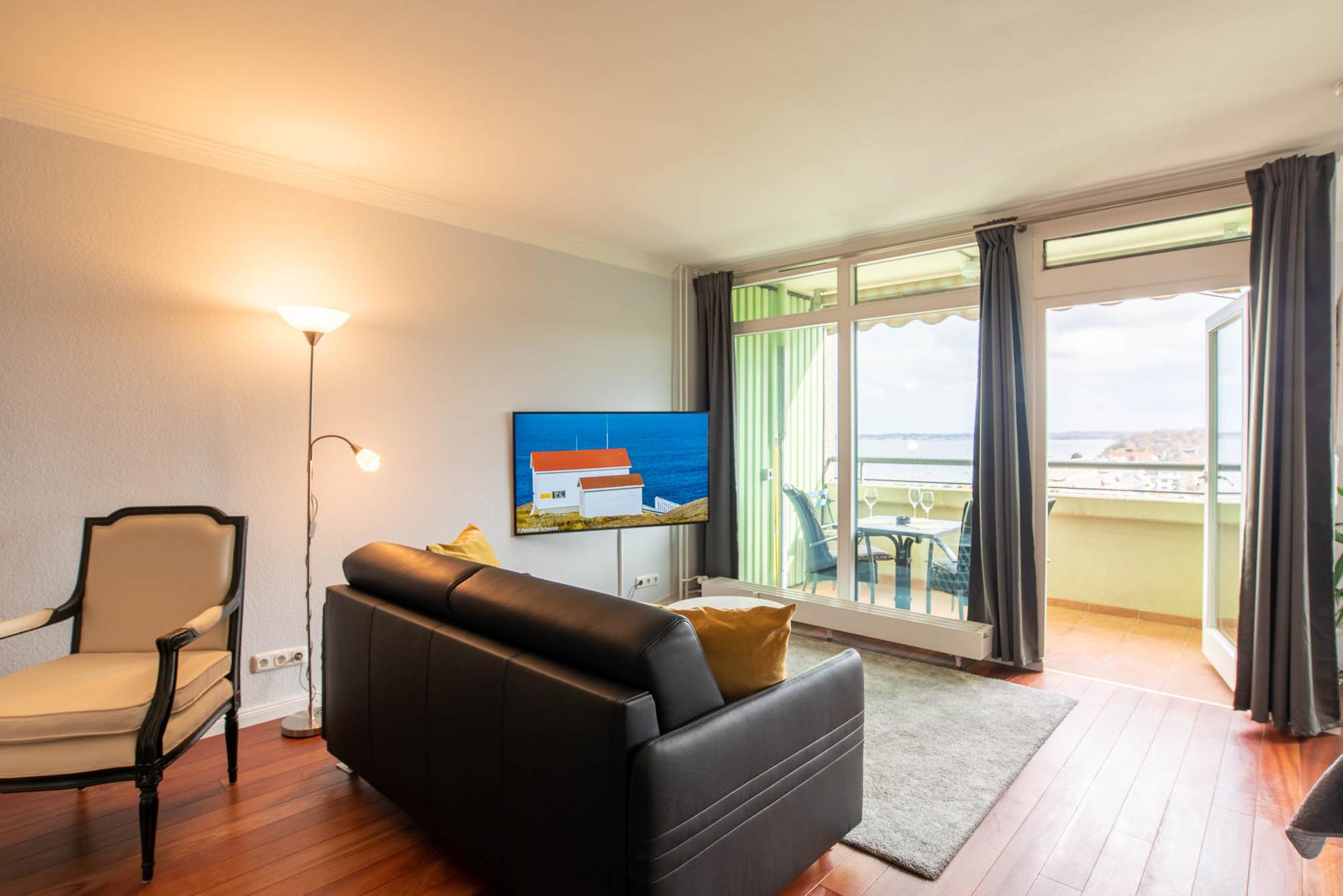 Vom angrenzenden Balkon der Ferienwohnung aus haben Sie einen großartigen Rundumblick über den Hafen und die Kieler Förde. Lassen Sie Ihren Blick schweifen vom Meer zu Ihrer Linken bis in die Natur mit den Salzwiesen zu Ihrer Rechten. 2 Gartenstühle sowie ein Tisch sind vorhanden.