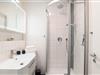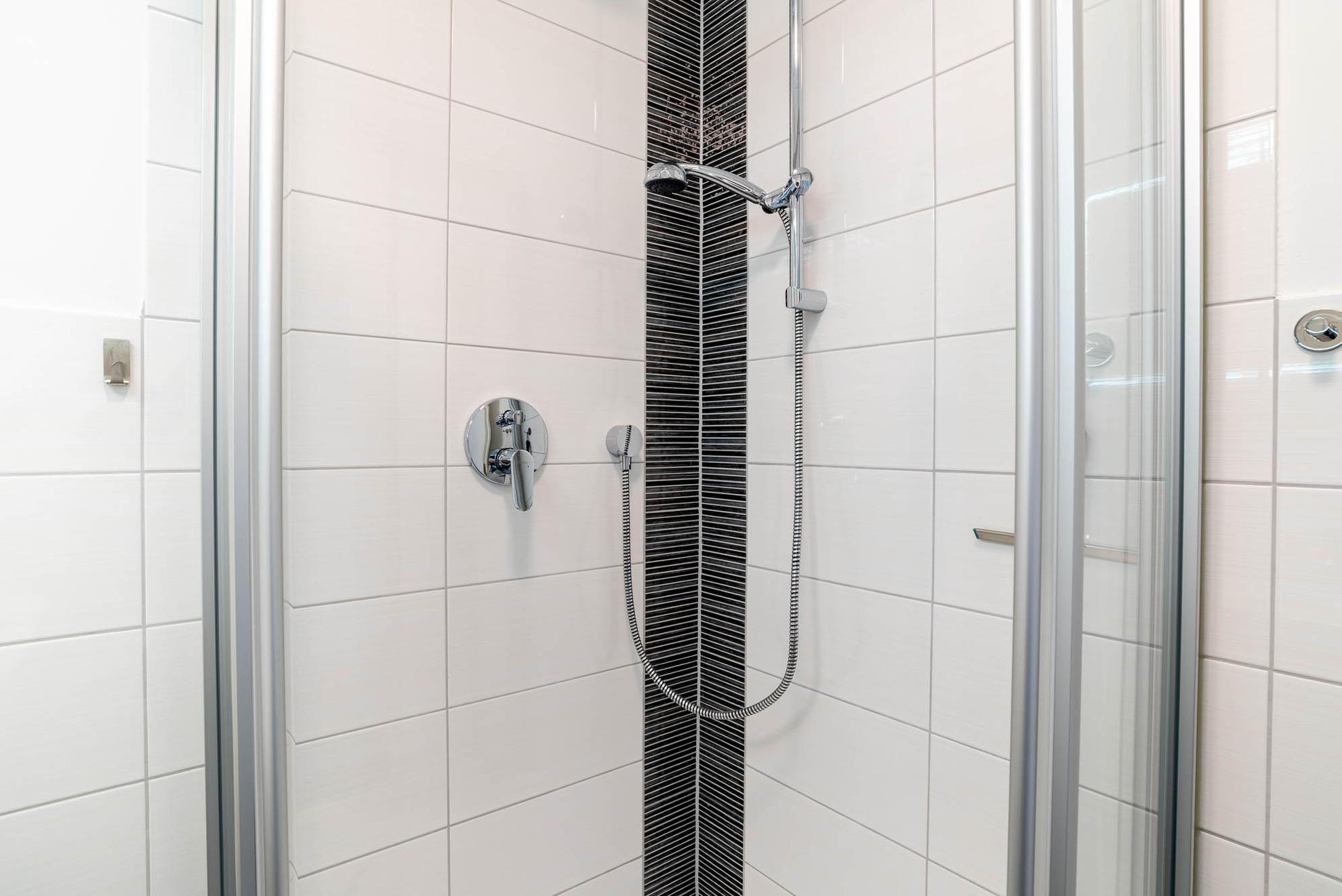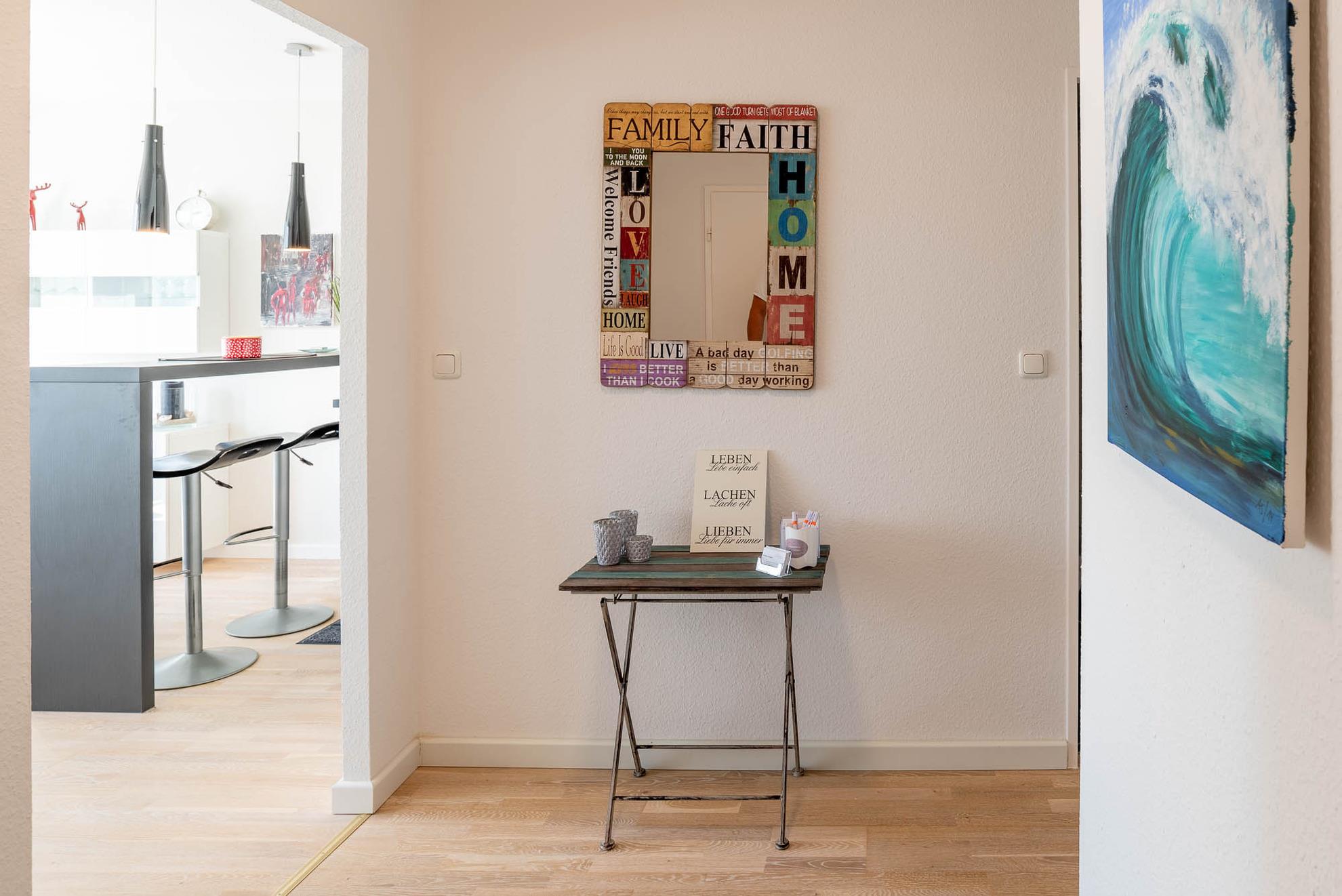 Über den Flur gelangen Sie neben einer kleinen Abstellkammer auch in das moderne Badezimmer. Ein großer Spiegel sowie Waschbeckenunterschrank geben Ihnen auch hier die Möglichkeit Ihre Utensilien zu verstauen.
