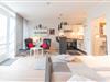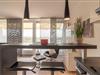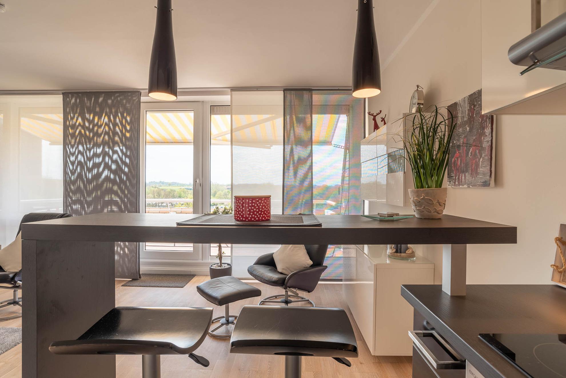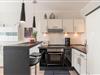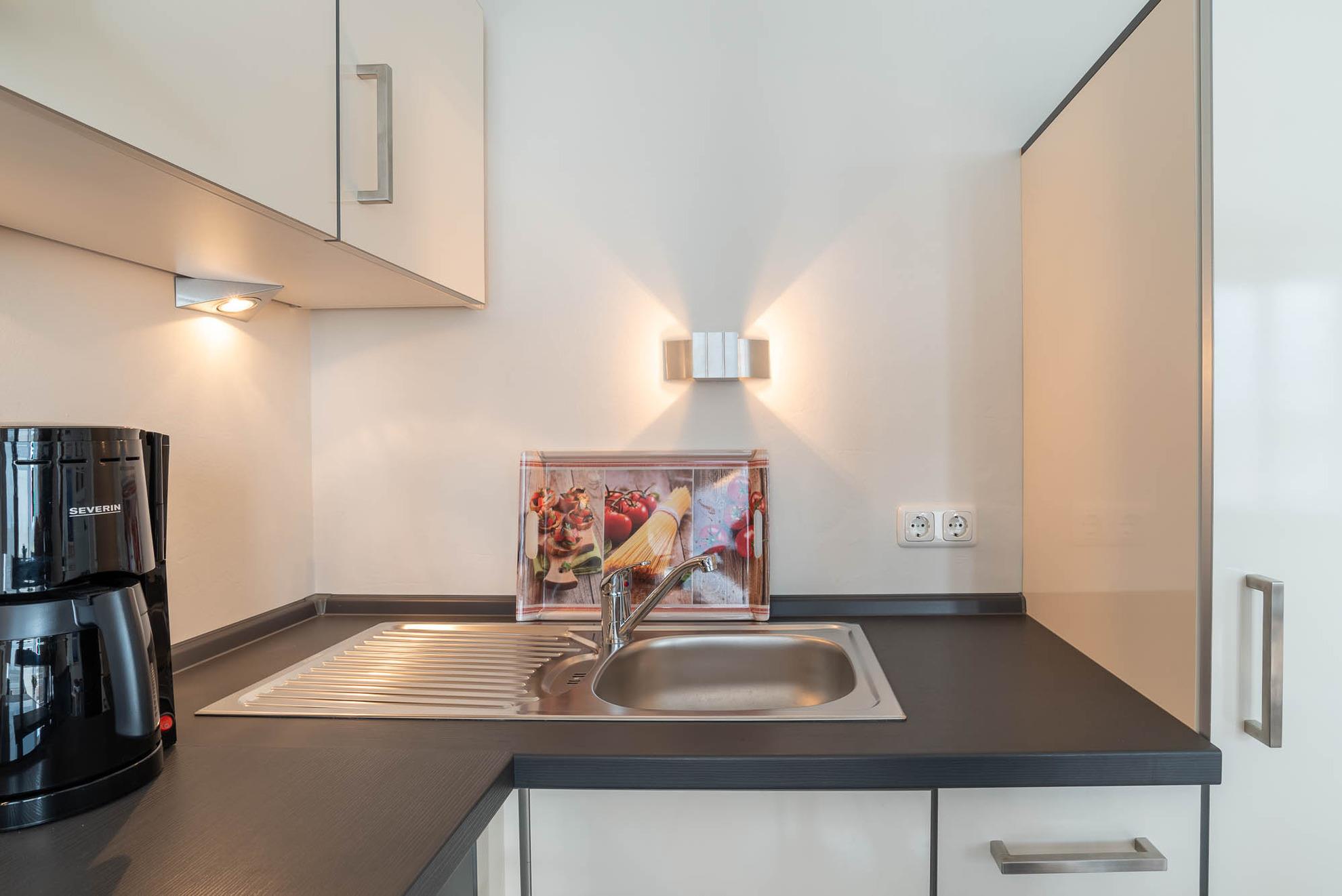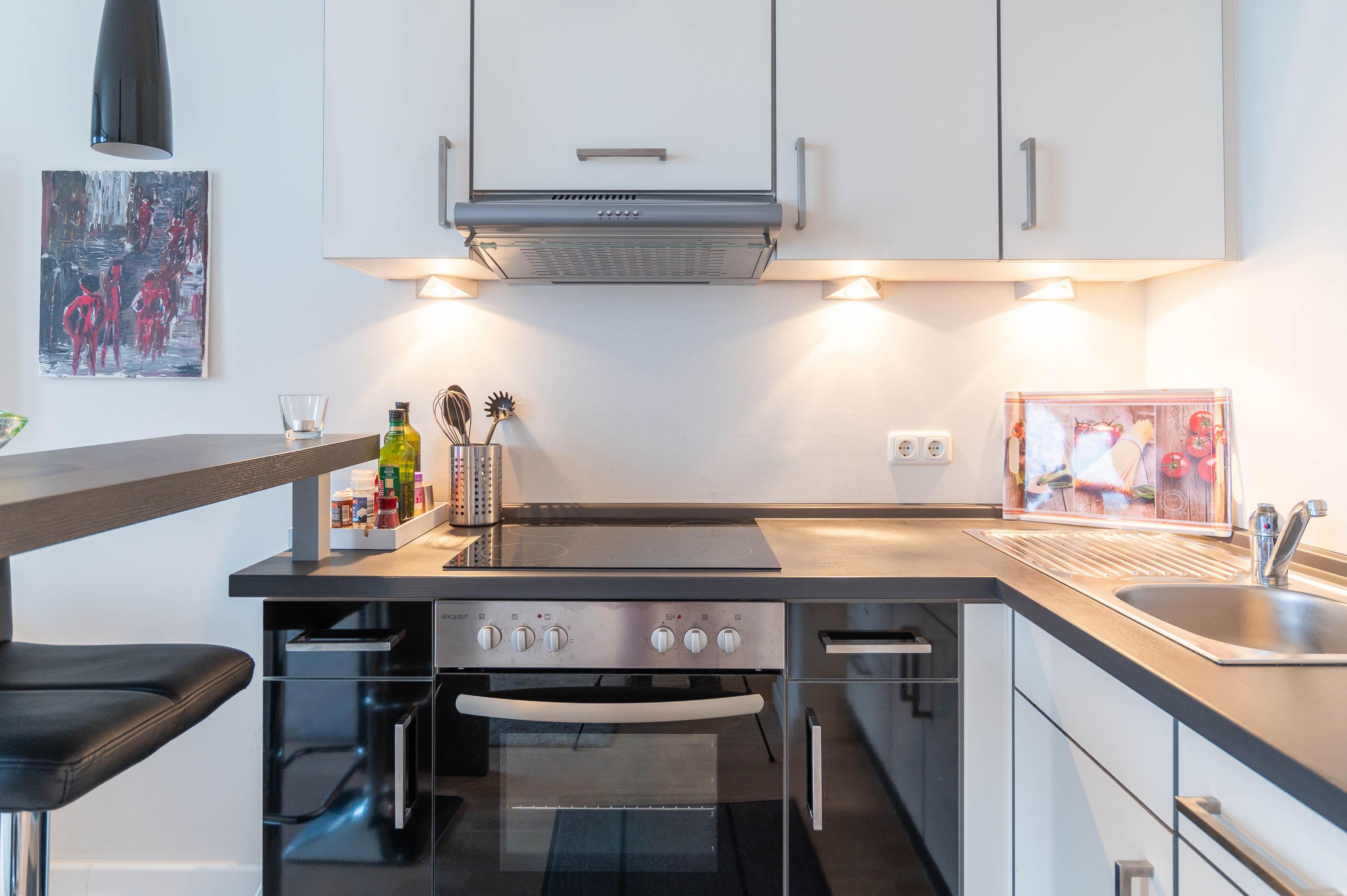 Die offene Küchenzeile wird optisch durch einen Küchentresen und zwei Barhockern vom Rest der Wohnung getrennt. Die moderne Küche ist komplett eingerichtet, und hat alles, was Sie zum Kochen brauchen: Es befindet sich in der Küche ein Ceran-Kochfeld mit Backofen und ein Kühlschrank mit Gefrierfach. Gläser, Porzellan, Töpfe und Besteck sind für 4 Personen vorhanden.