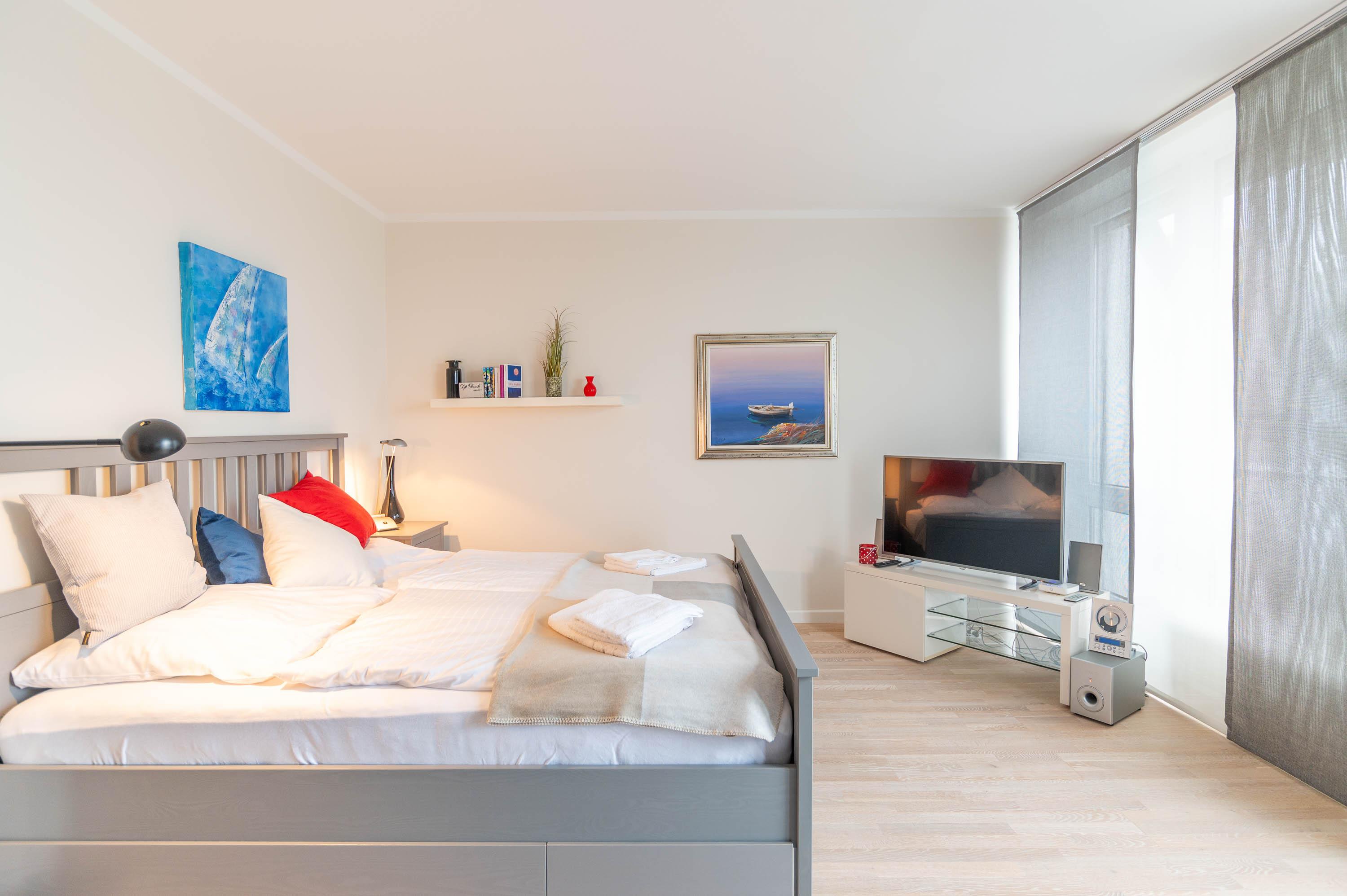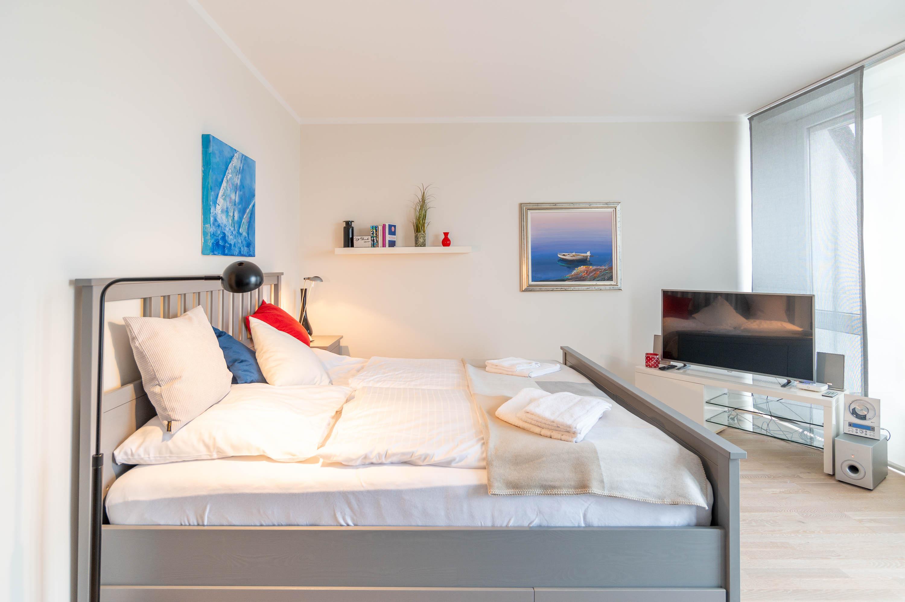 Die bodentiefe Fensterfront sowie der helle Fußboden mit Parkettboden lässt die 1-Zimmer Ferienwohnung erstrahlen. Im gemütlichen Wohnbereich befindet sich zwei Sessel, sowie ein bequemes 180x200m Bett.