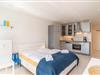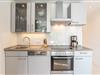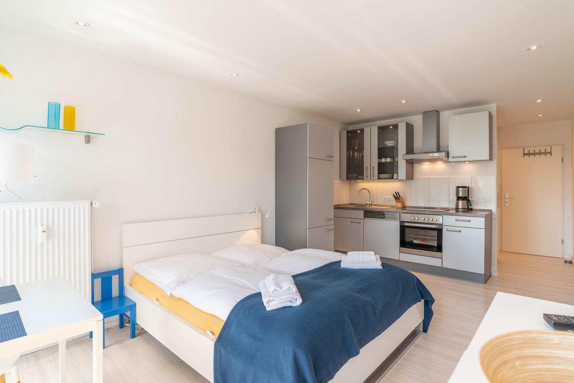 Die angrenzende offene Einbauküche besticht mit ihrer guten Ausstattung: Ein Geschirrspüler, ein Kühlschrank, ein Cerankochfeld mit vier Kochfeldern, sowie ein Backofen findet sich in der gepflegten Küchenzeile. Hinzu kommen eine Kaffeemaschine, Toaster, Wasser-, und Eierkocher. Einem gemütlichen Frühstück kann nichts im Wege stehen. Hierfür steht im Appartment ein kleiner Tisch mit zwei Stühlen. Auch der Balkon ist mit Gartenmöbeln ausgerüstet.