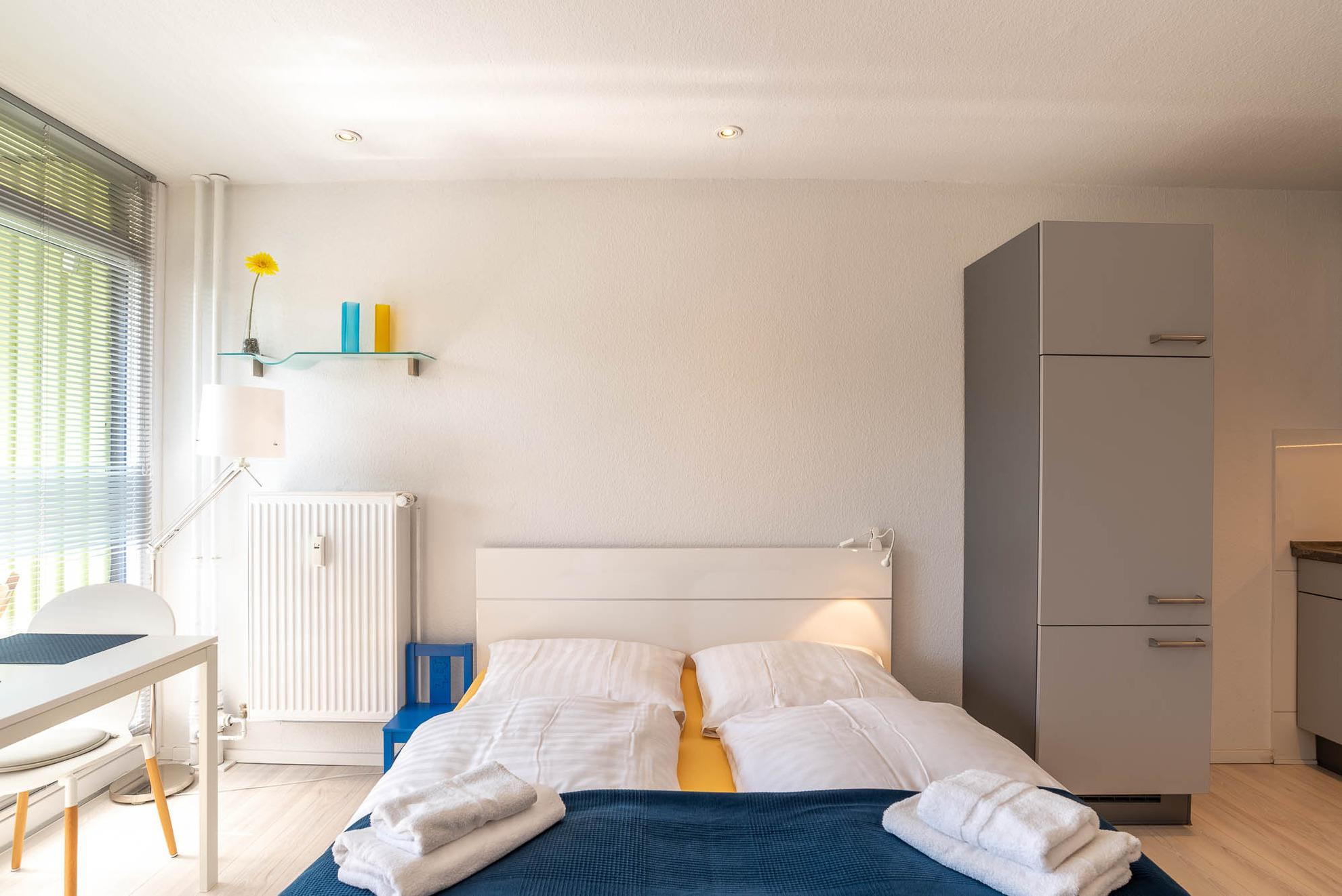 Im freundlichen Appartment befindet sich ein bequemes Doppelbett (Liegefläche von 160x200 cm). An der Wand gegenüber ist ein LCD- Fernseher angebracht.