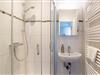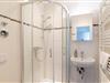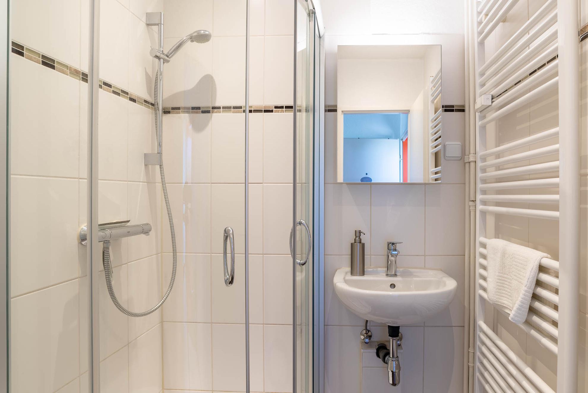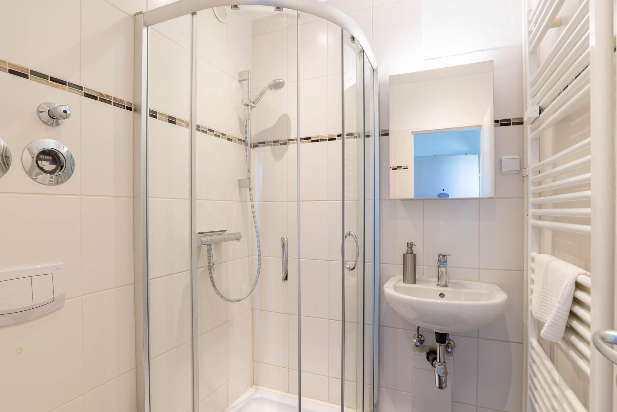 Das separate Badezimmer mit Eckdusche befindet sich in einem gepflegten und modernen Zustand.