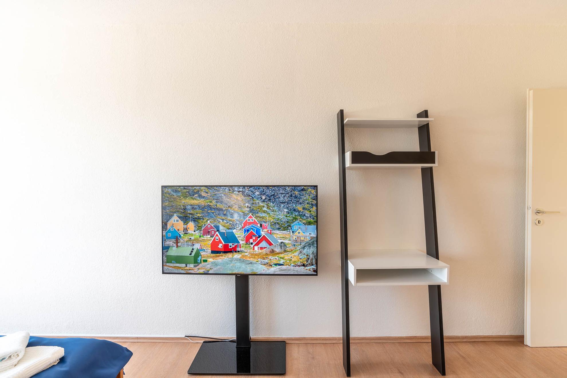 Ein Esstisch mit drei Stühlen bietet eine angenehme Sitz-, und Aufenthaltsmöglichkeit. Aber auch der Balkon ist mit zwei Stühlen, einem Tisch und einer Markise gut ausgestattet. Genießen Sie bis in den Abend hinein die Sonne und den entspannenden Blick ins Grüne.