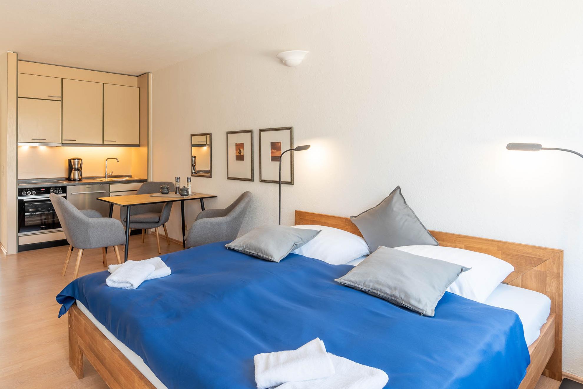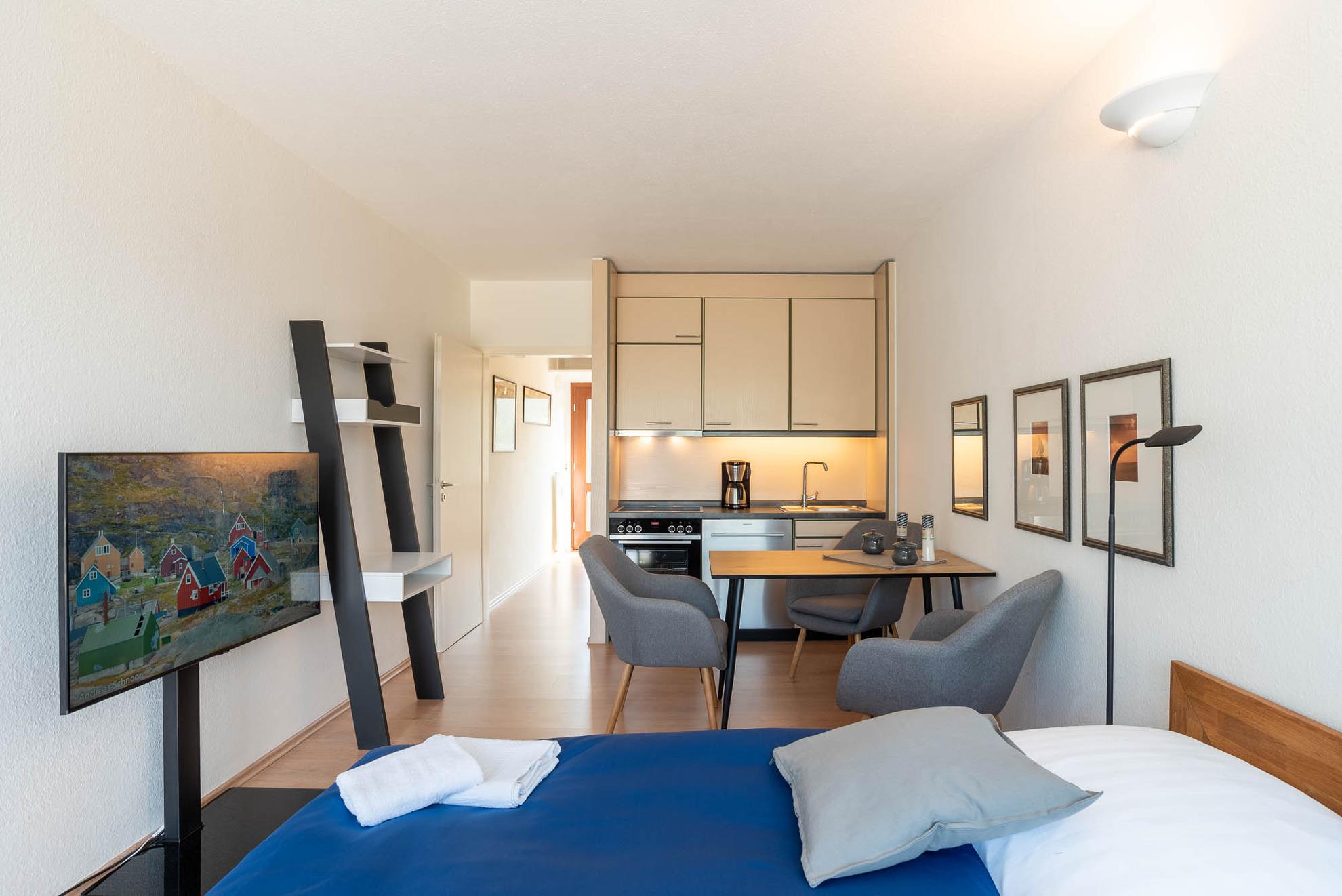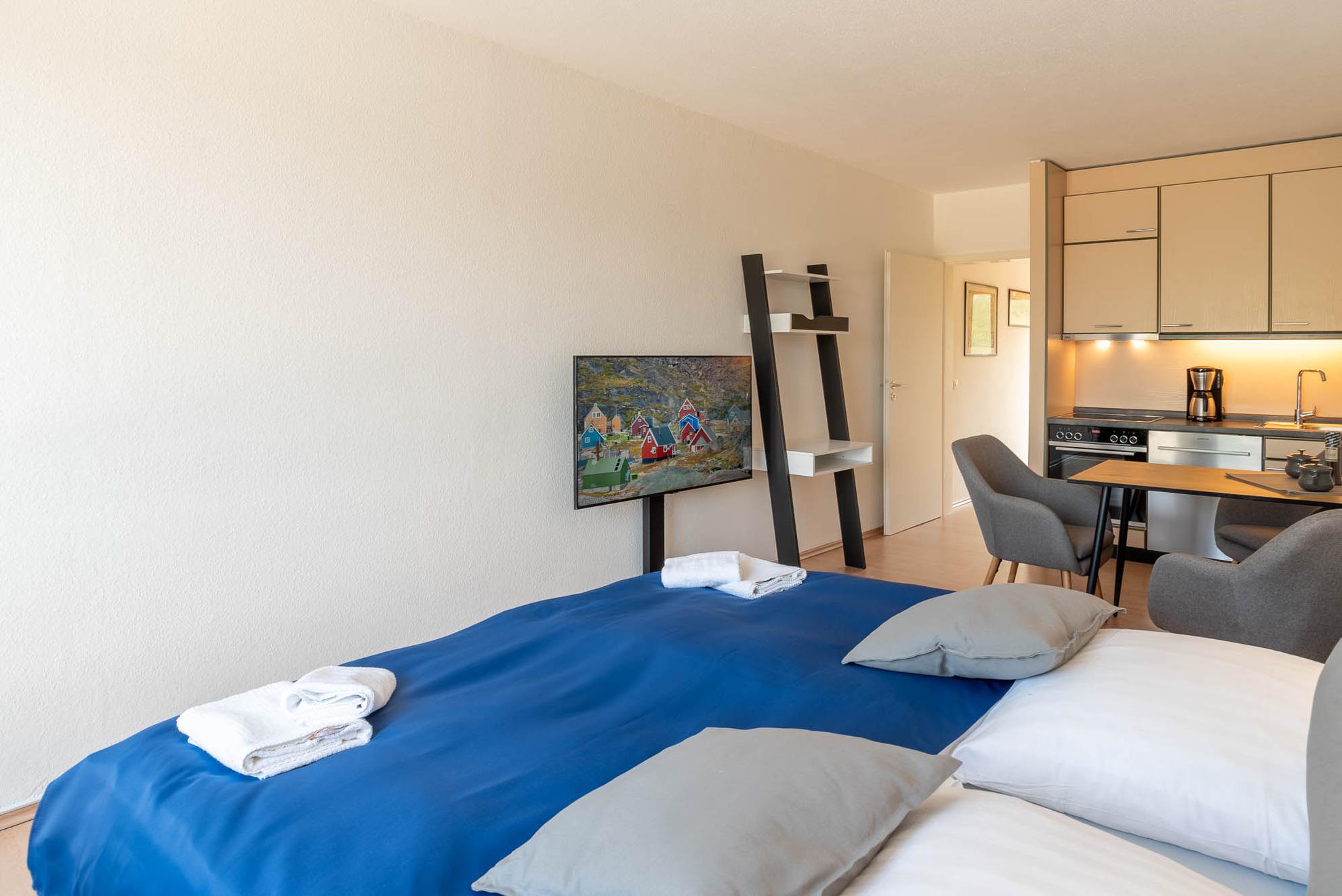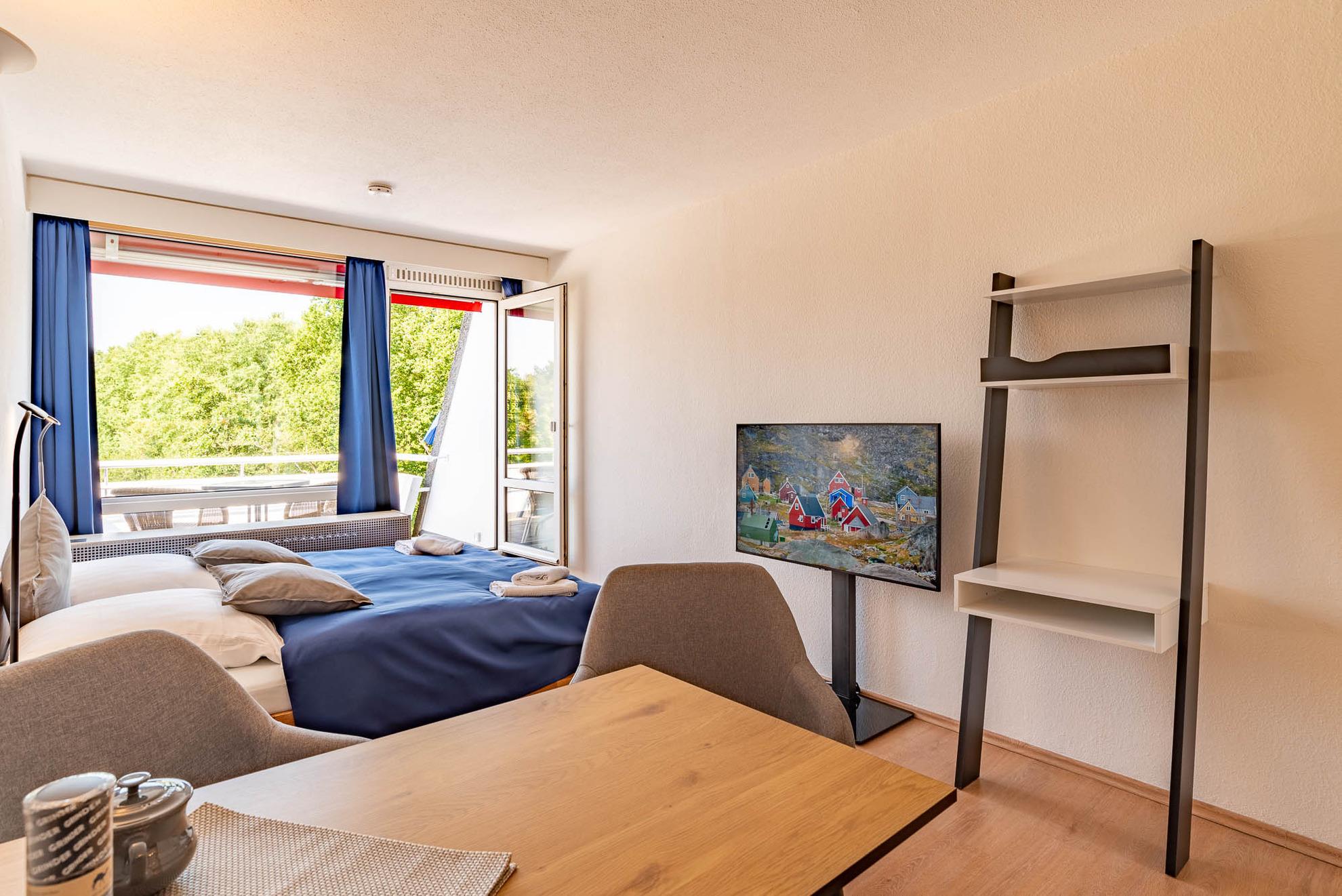 Der kombinierte Wohn- und Schlafraum verfügt über ein Doppelbett in der Größe von 180x200 cm mit getrennten Matratzen. Von hier, oder von den schicken Sesseln aus, können Sie bequem fernsehen.