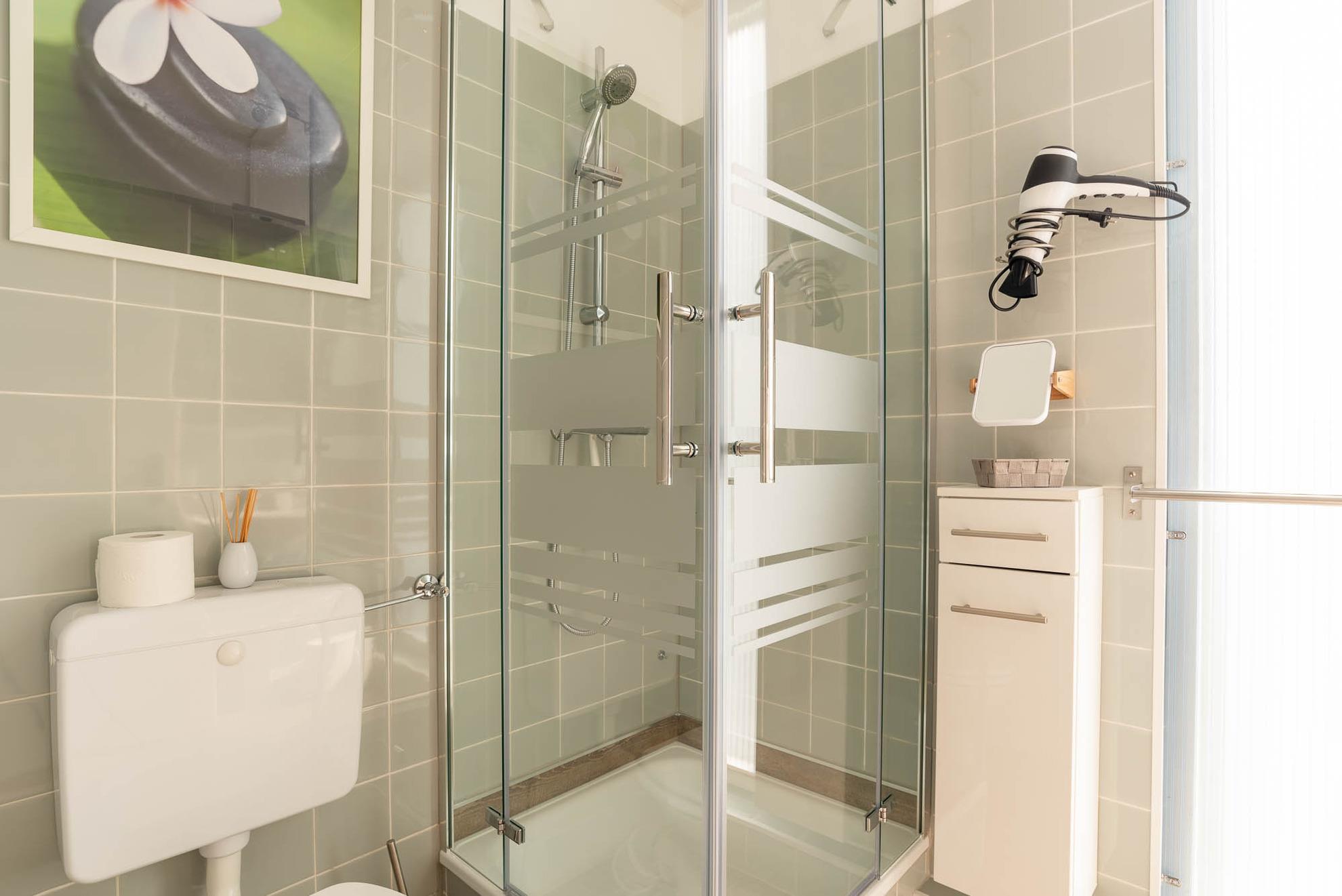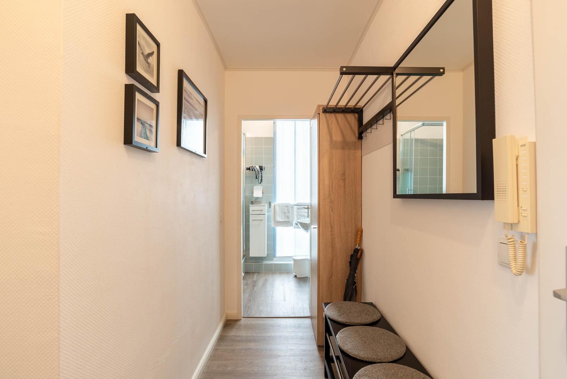 Das Duschbad ist hell gefliest und hat ein Fenster. Der kleine Flur mit Schrank und Flurgarderobe, mit ausreichend Ablagemöglichkeiten während Ihres Aufenthaltes, runden die 47 qm große Wohnung ab.
