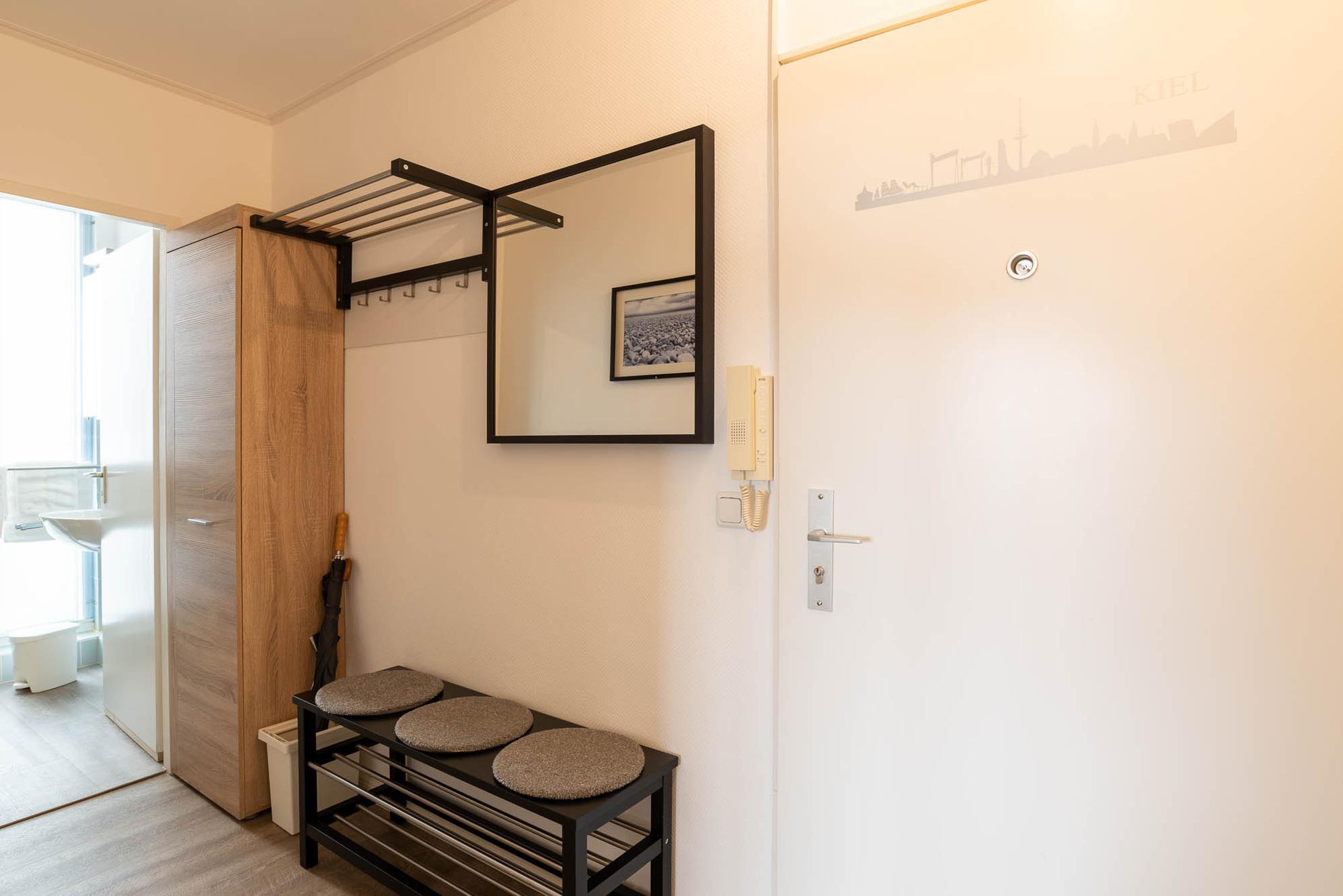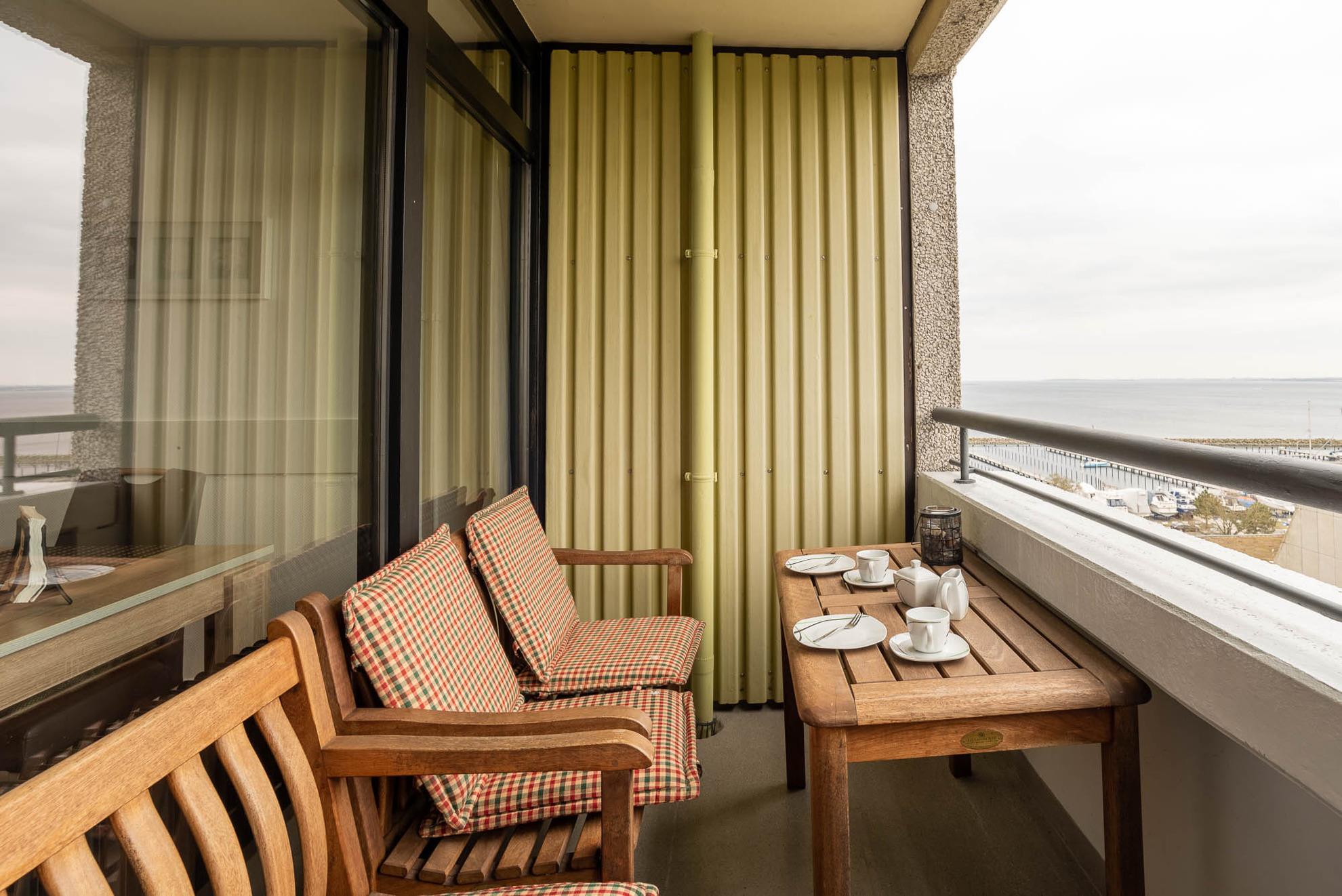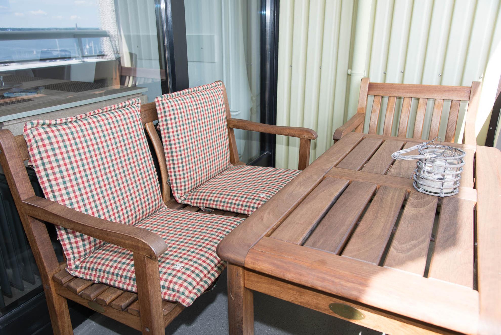 Ein Highlight der Wohnung ist der Balkon mit dem traumhaften Blick über den gesamten Schilkseer Yachthafen und der Kieler Förde. Dadurch, dass sich das Appartment im 9. Stockwerk befindet, können Sie von hier aus alle Schiffsbewegungen überblicken und verfolgen. Eine Gartengarnitur aus Holz lädt hier zum Verweilen ein.