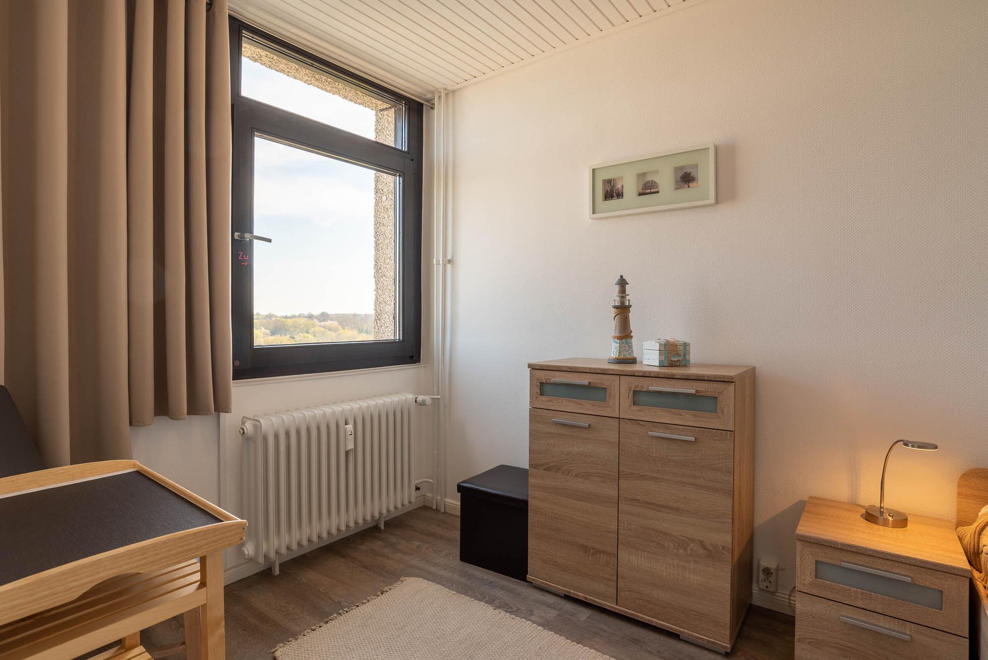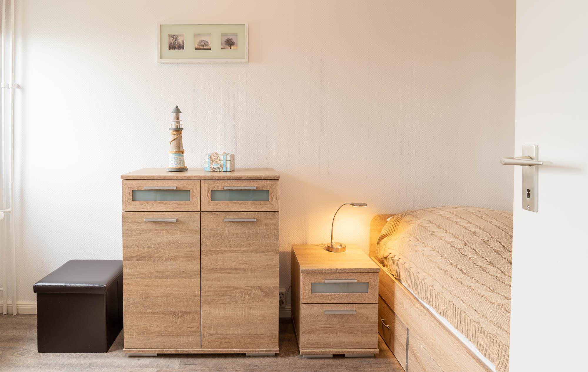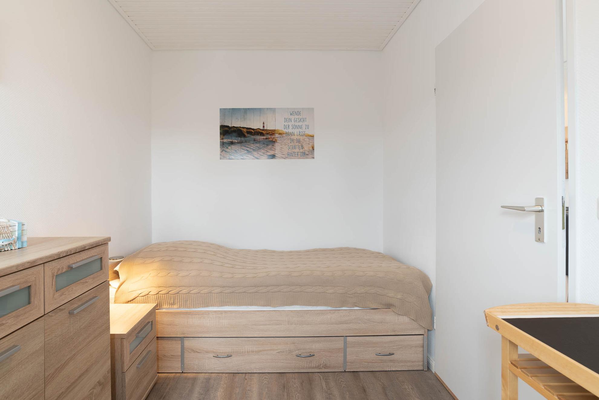 Das Boxspringbett (Liegefläche 180x200 cm) ist durch eine Wand und zwei Vorhänge vom Wohnbereich getrennt. Dies ist der Schlafbereich für 2 Personen. Im halben, kleineren Zimmer befindet sich ein Einzelbett mit einer Liegefläche von 90 x 200 cm für eine dritte Person. Auch von dem Fenster aus haben Sie eine exklusive Sicht auf die Kieler Förde. Das Zimmer lässt sich selbstverständlich verdunkeln.