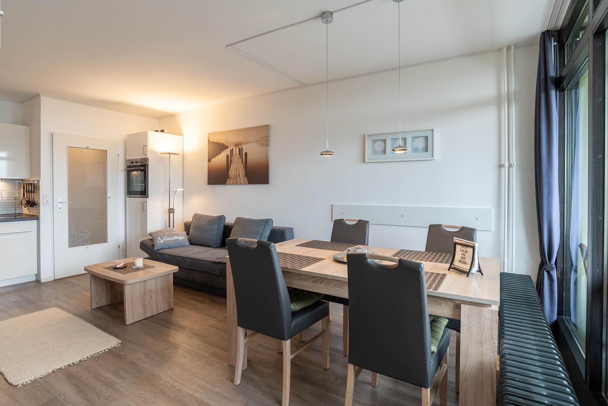 Der Esstisch mit vier Stühlen steht direkt am Fenster, so dass Sie auch bei nicht so schönem Wetter beim Essen den Blick auf die schöne Kieler Förde genießen können.