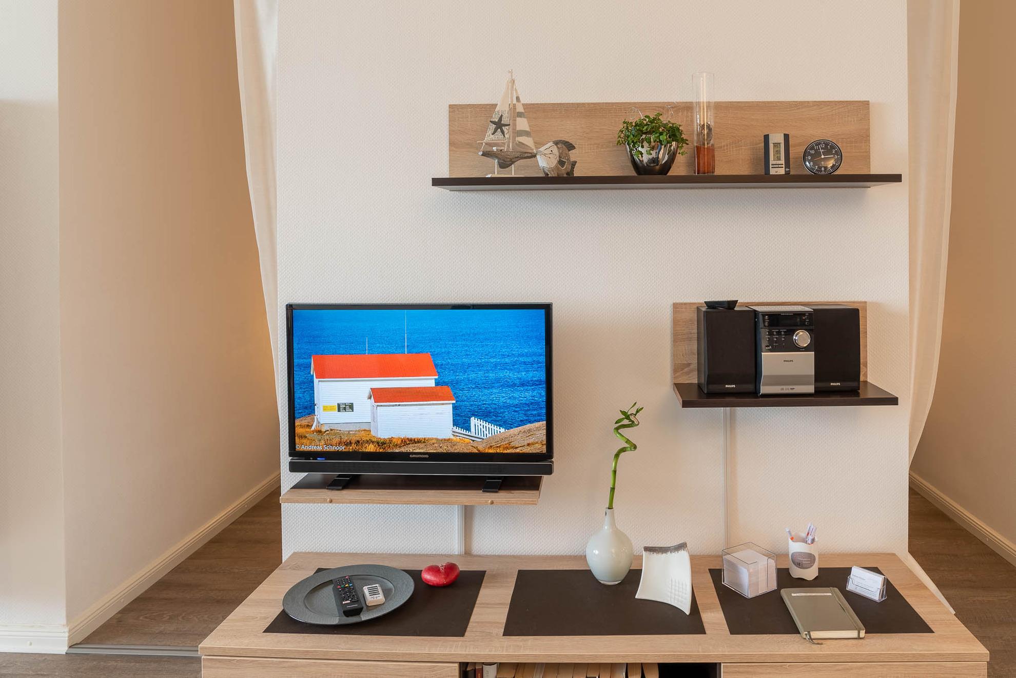 In der 47qm großen Wohnung befindet sich eine gemütliche Couch, direkt gegenüber von einer Wohnzimmerwand mit Flachbild-Fernseher und Radiogerät. Ihnen steht zudem kostenloses WLAN zur Verfügung.