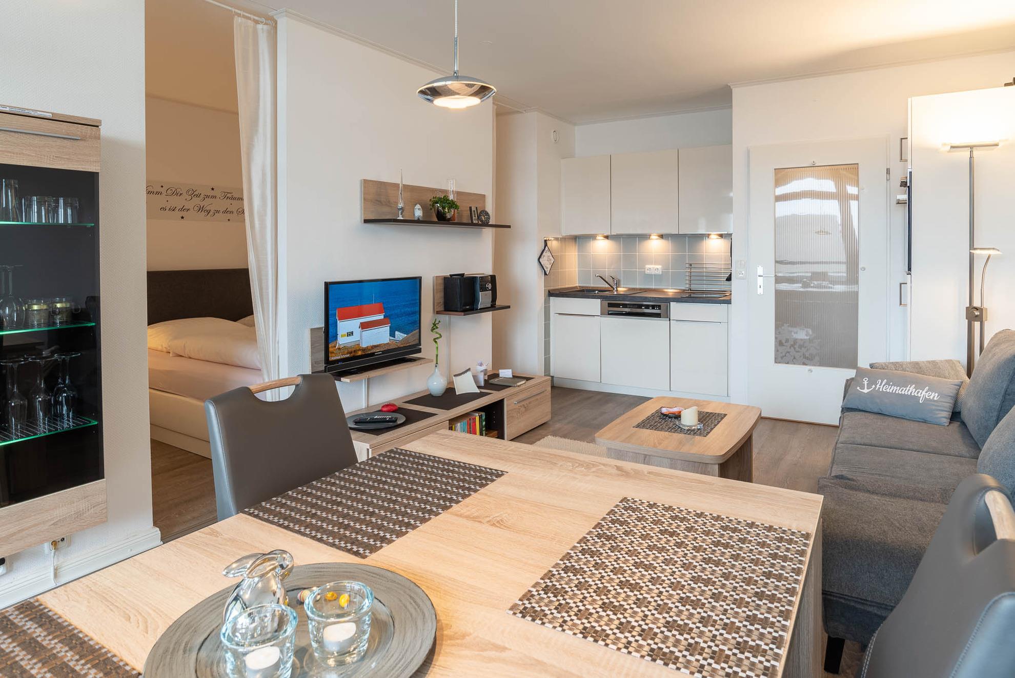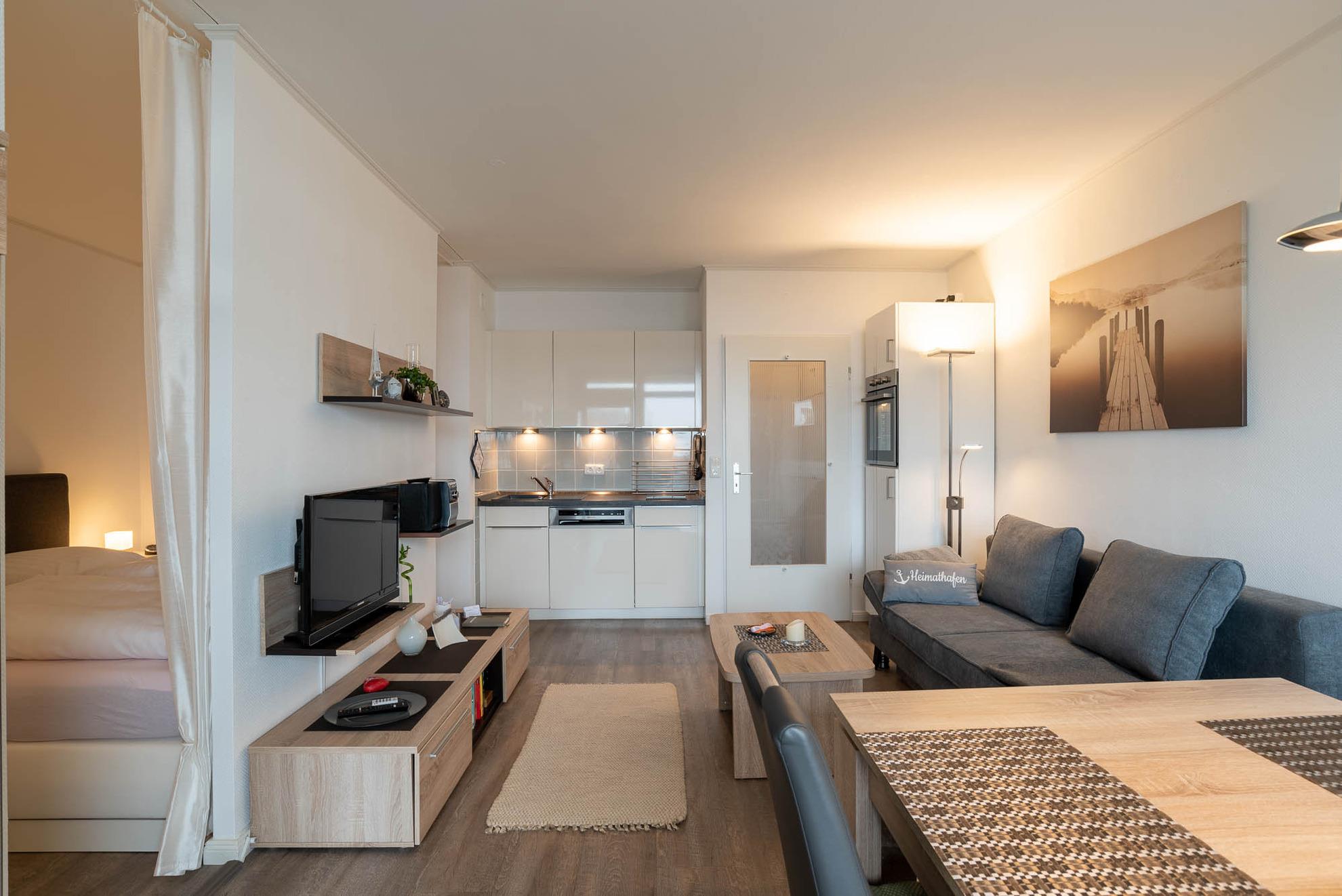 Die kleine Pantry-Küche bietet für 3 Personen eine funktionale Grundausstattung. So befindet sich neben Cerankochfeld, Backofen auf halber Höhe, Kaffeemaschine, Toaster und Wasserkocher auch eine Geschirrspülmaschine in der Küchenzeile.