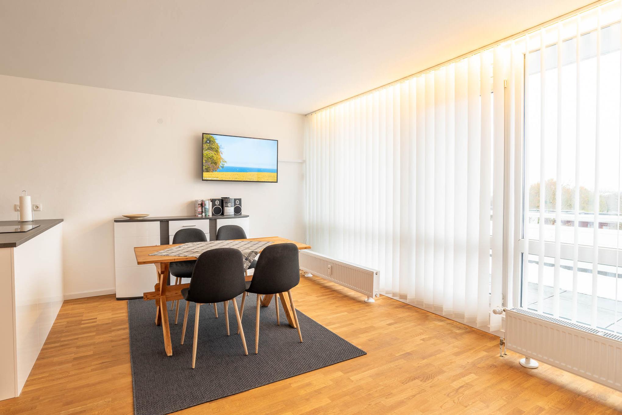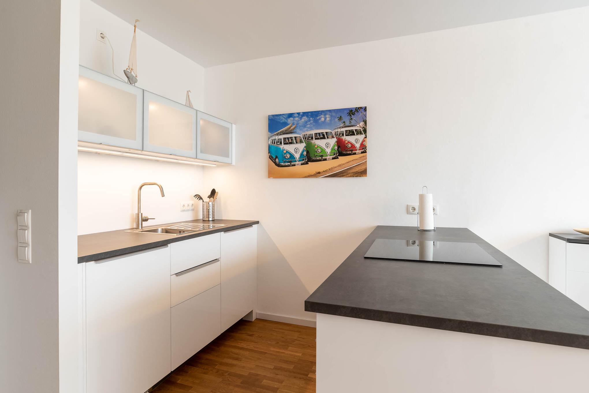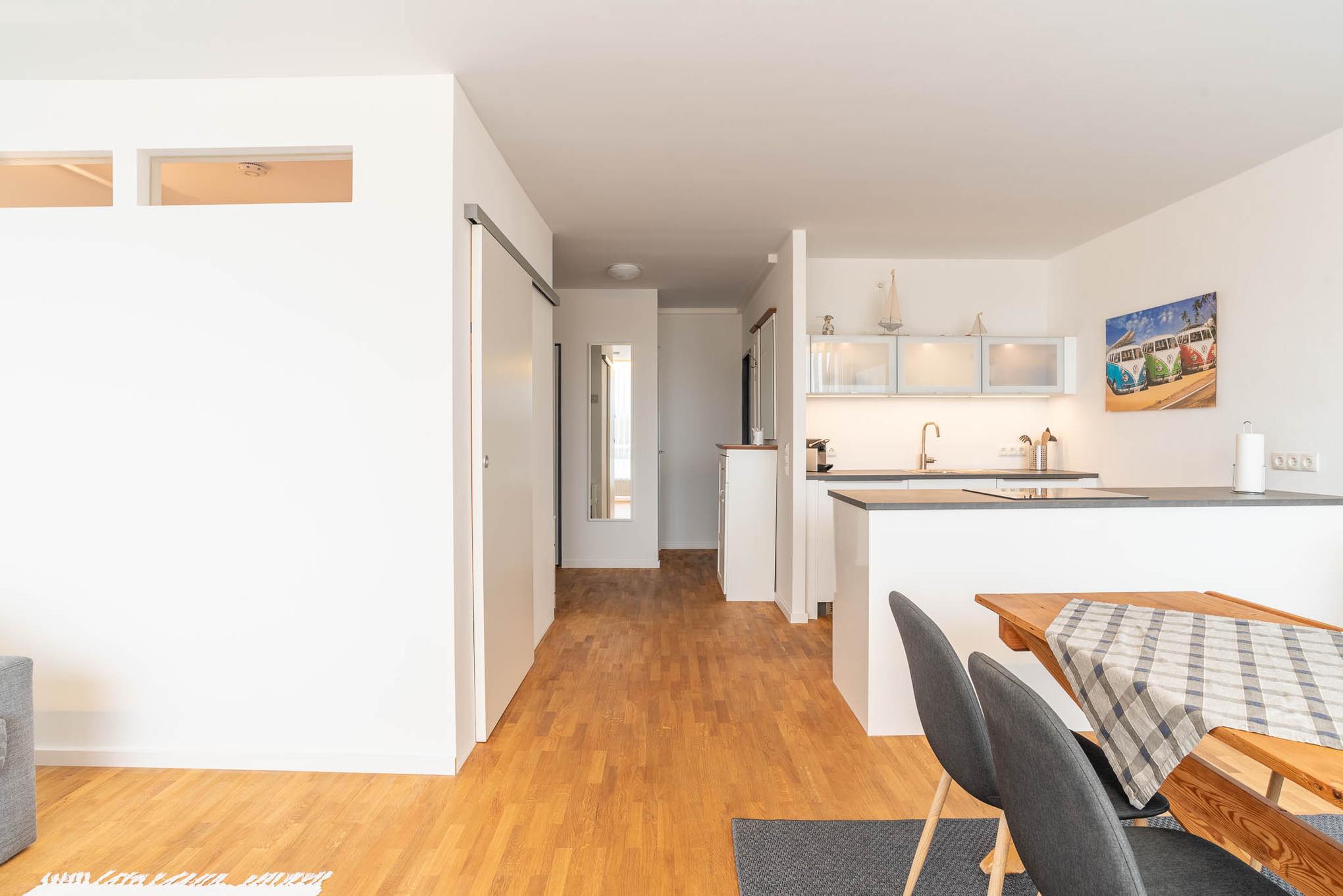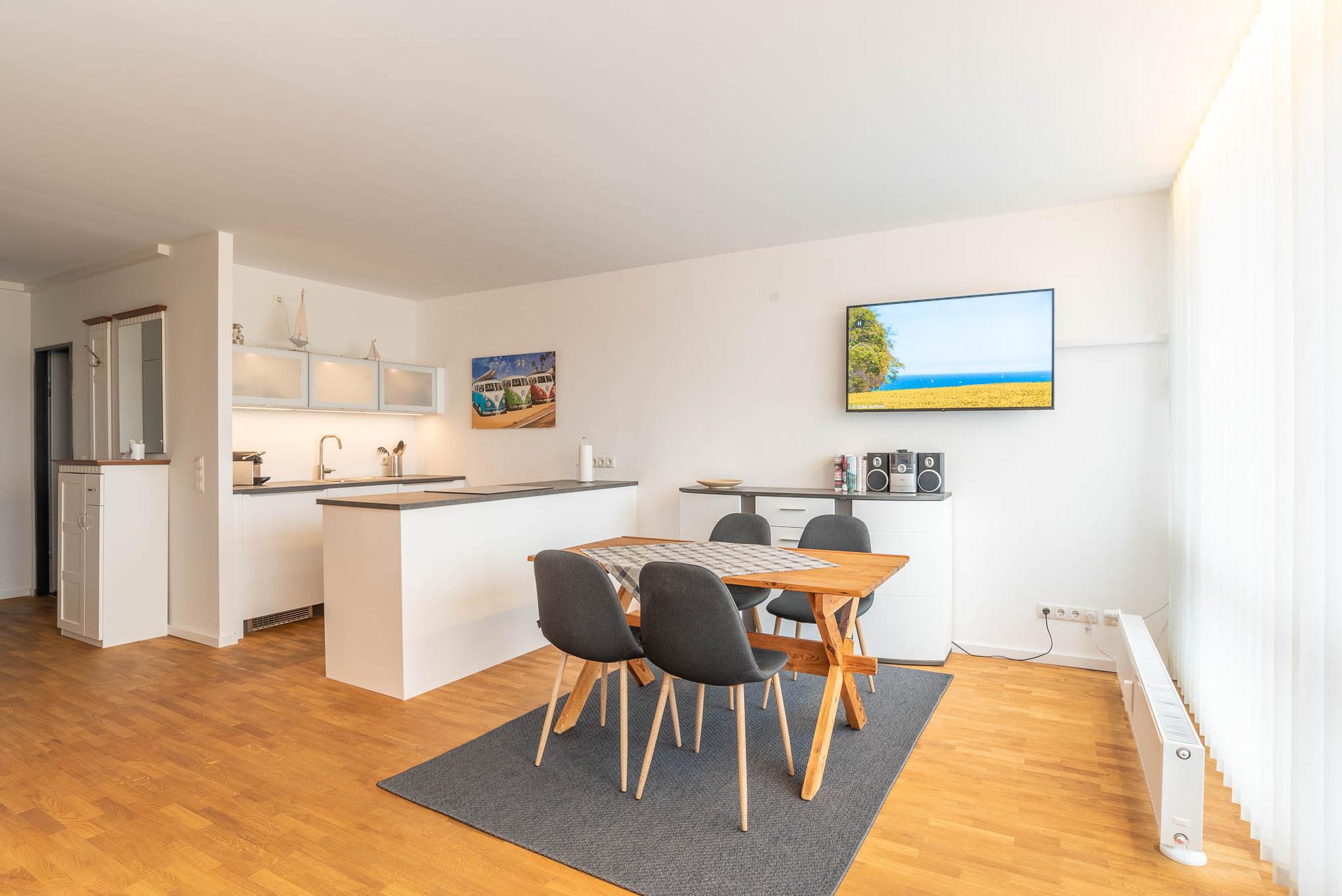 Mit einem Induktionskochfeld, Kühlschrank, Backofen, Wasserkocher und einer Kaffeepadmaschine ist die offene Pantry-Küche eingerichtet und ausgestattet. Auch eine Geschirrspülmaschine steht Ihnen zur Verfügung. Am angrenzenden Esstisch kann man gemütlich zu viert sitzen und essen.