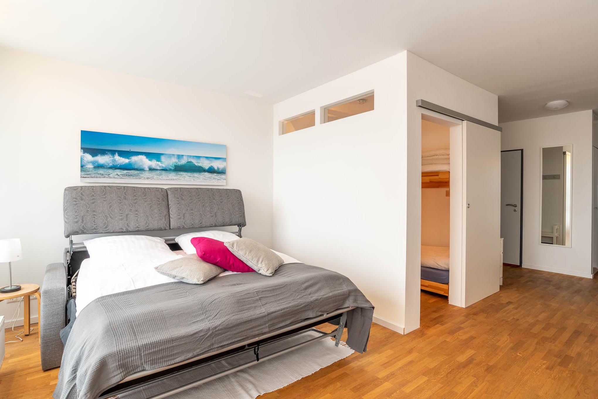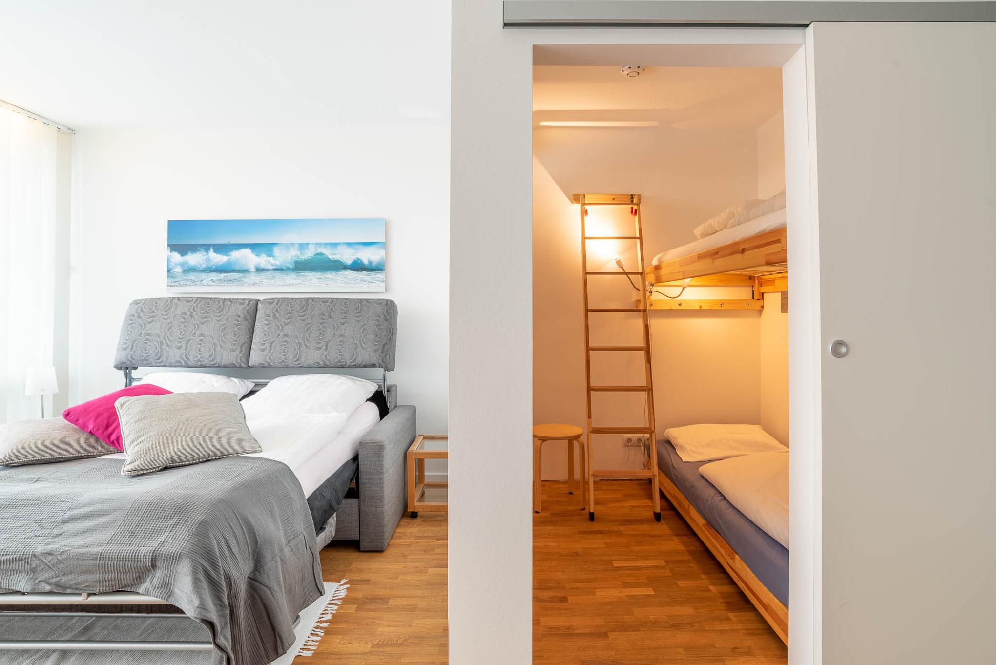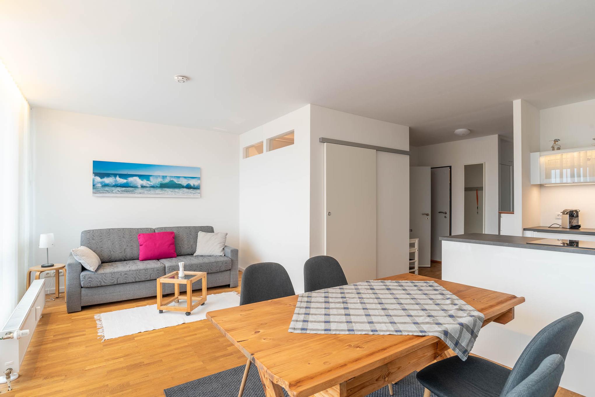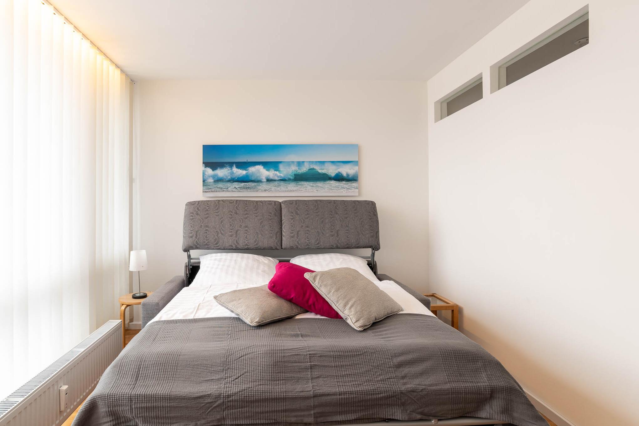 (Kurze) Auszeit am Meer. Die bodentiefe Fensterfront lässt die 1,5 Zimmer-Wohnung hell erstrahlen. Sie bietet Platz für bis zu 3 Personen.
