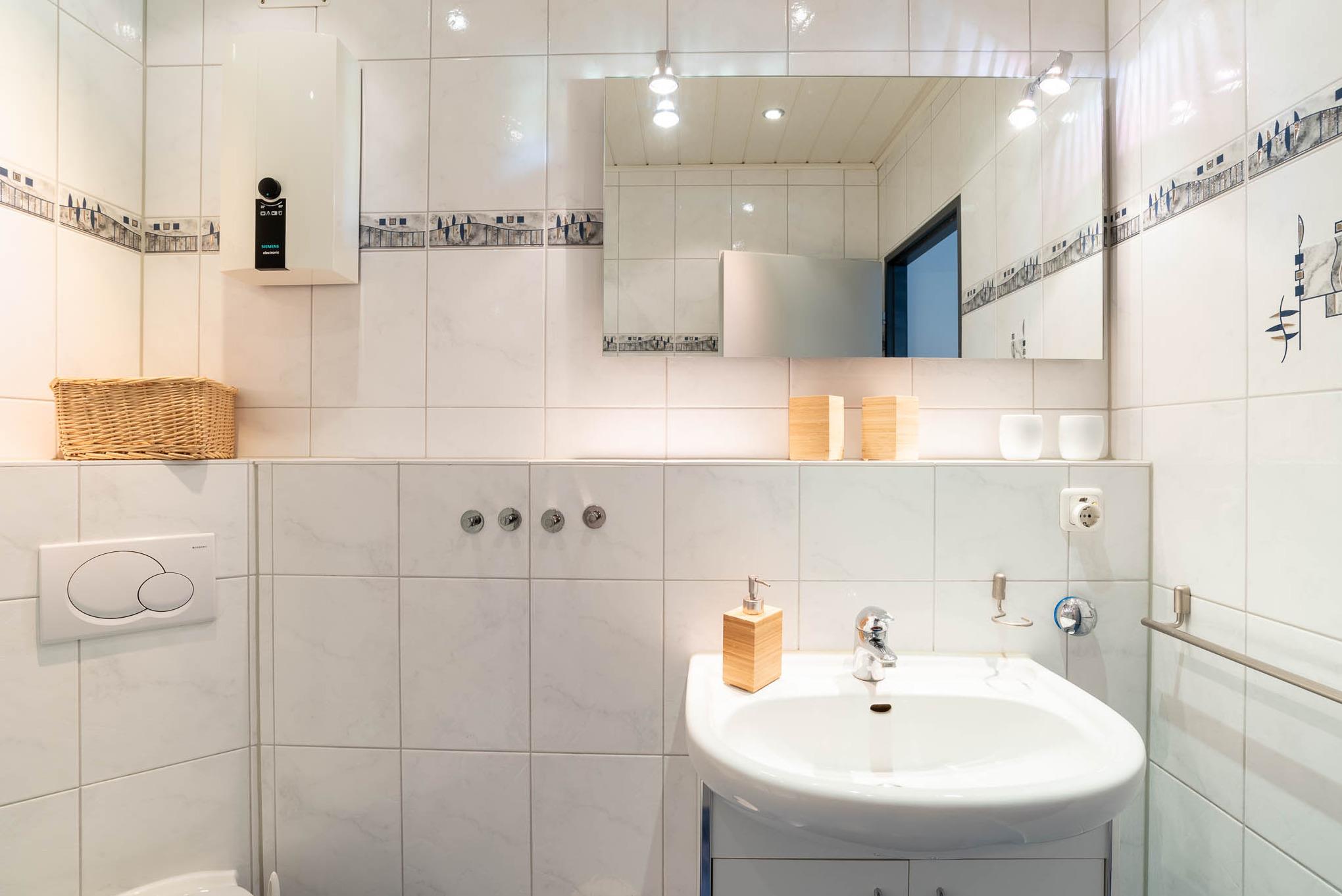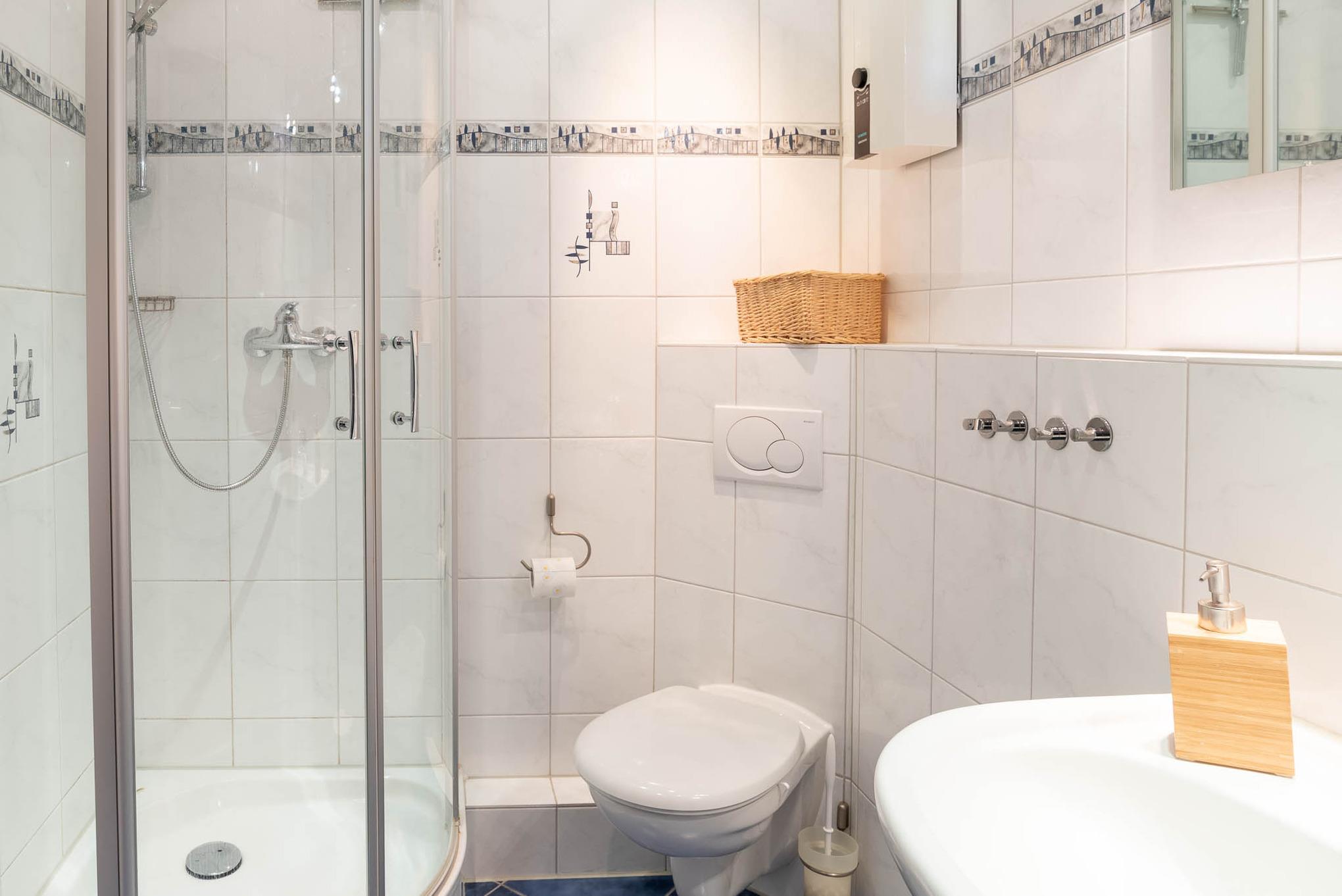 Die Wohnung ist mit einem Duschbad ausgestattet. Zum Flur gehört noch eine Abstellkammer und ein Kleiderschrank dazu.