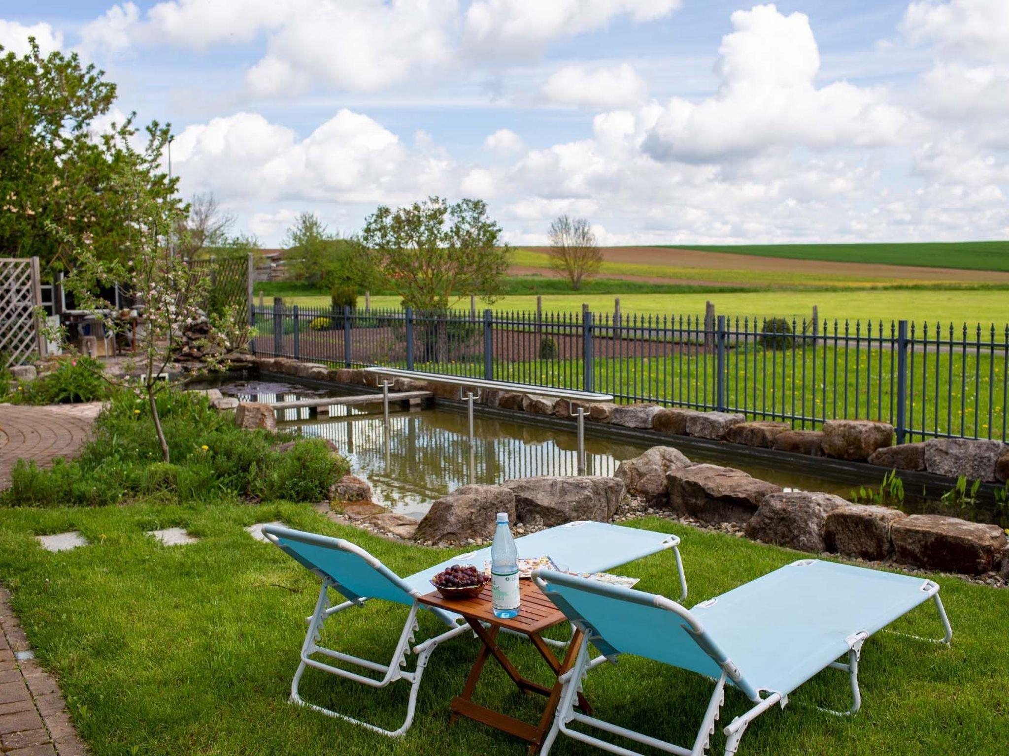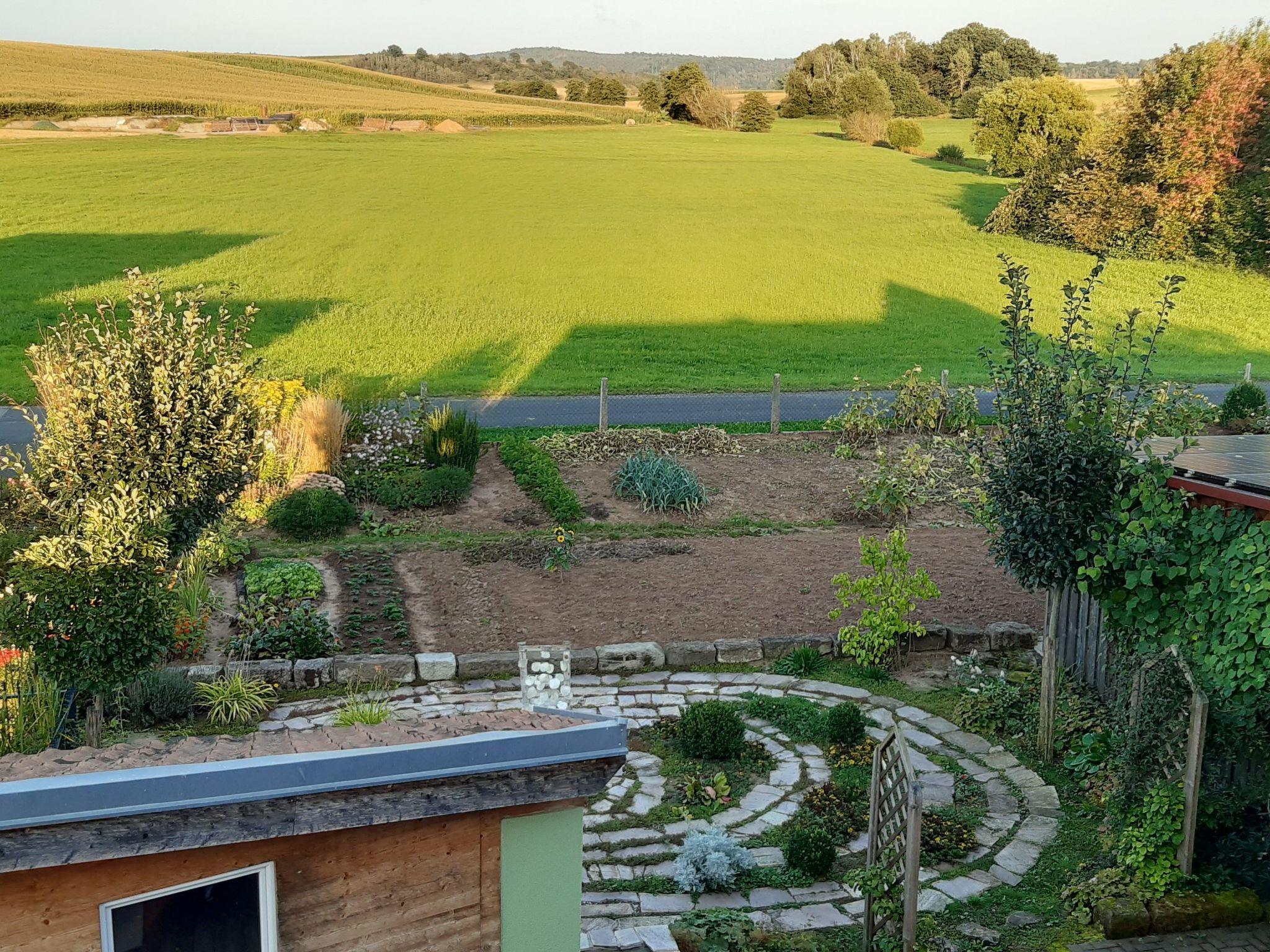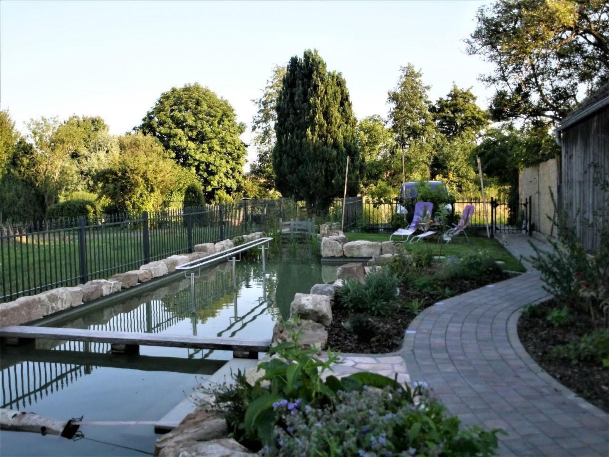 Prayer labyrinth, garden tables with seating and appropriate cushions, 2 x barbecue, enough deckchairs for everyone, 2 meadows, gardens, Kneipp facility with sauna and natural pool with treading, arm-diving and sunbathing areas in the water... particularly quiet location on the edge of the small village