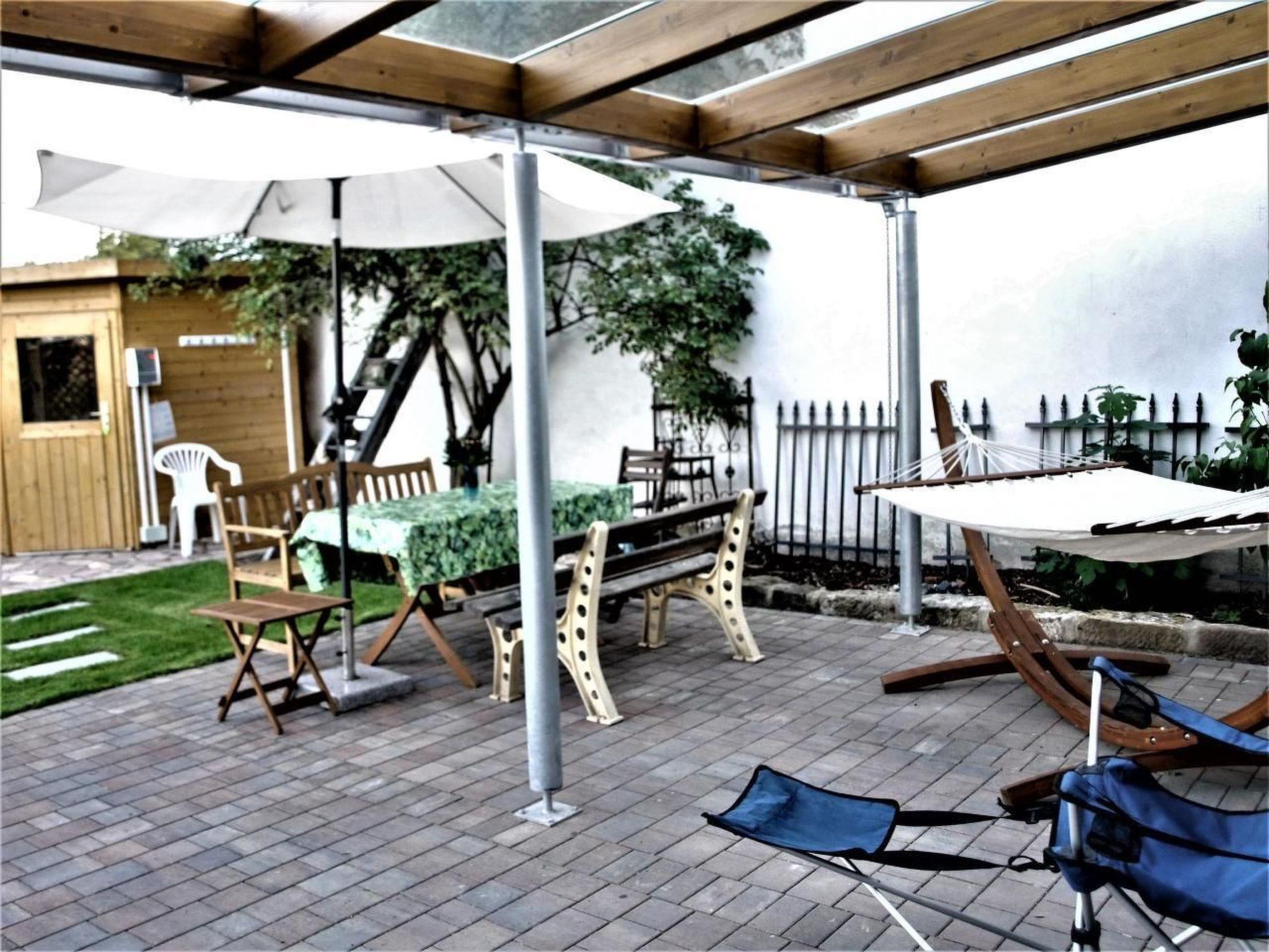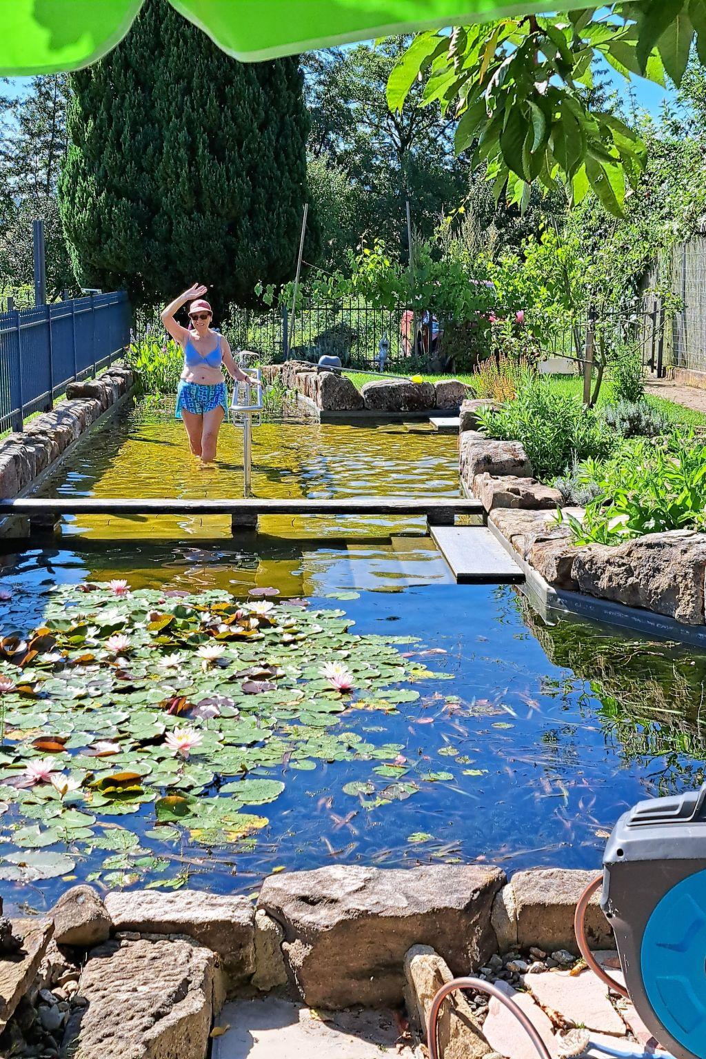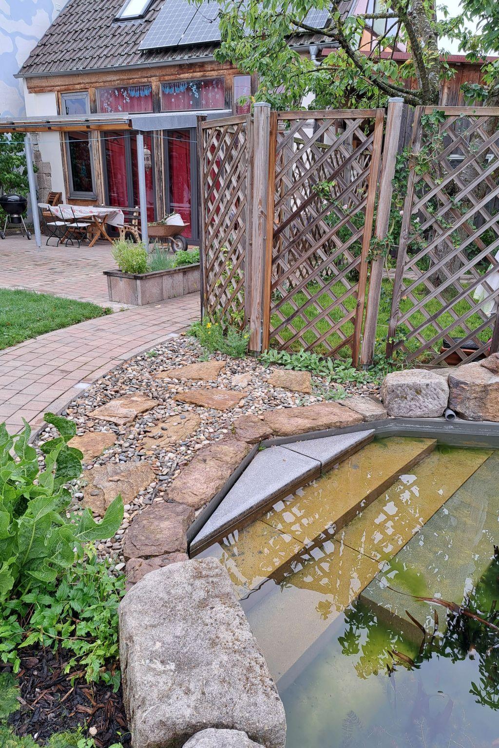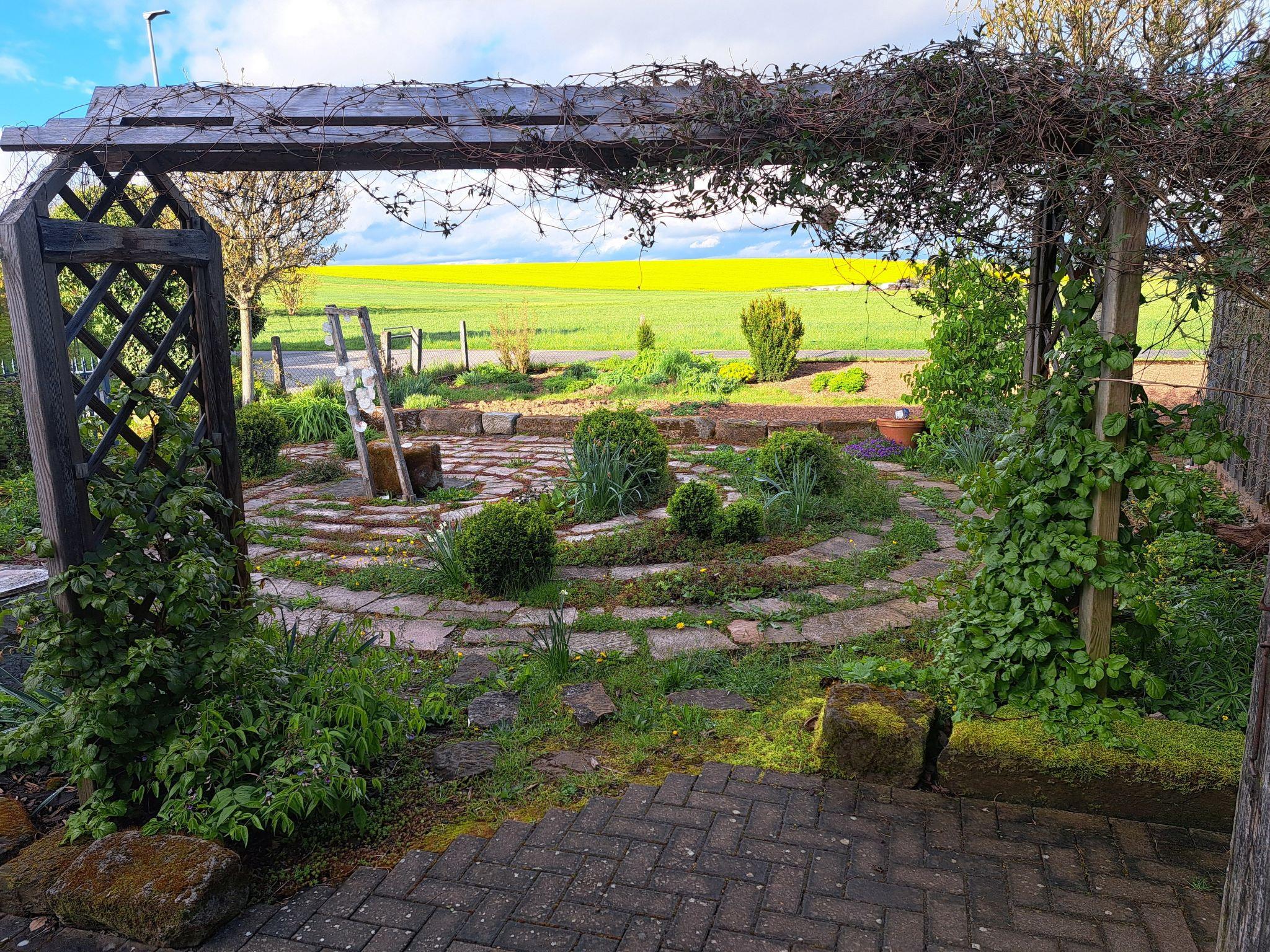 Prayer labyrinth, garden tables with seating and appropriate cushions, 2 x barbecue, enough deckchairs for everyone, 2 meadows, gardens, Kneipp facility with sauna and natural pool with treading, arm-diving and sunbathing areas in the water... particularly quiet location on the edge of the small village